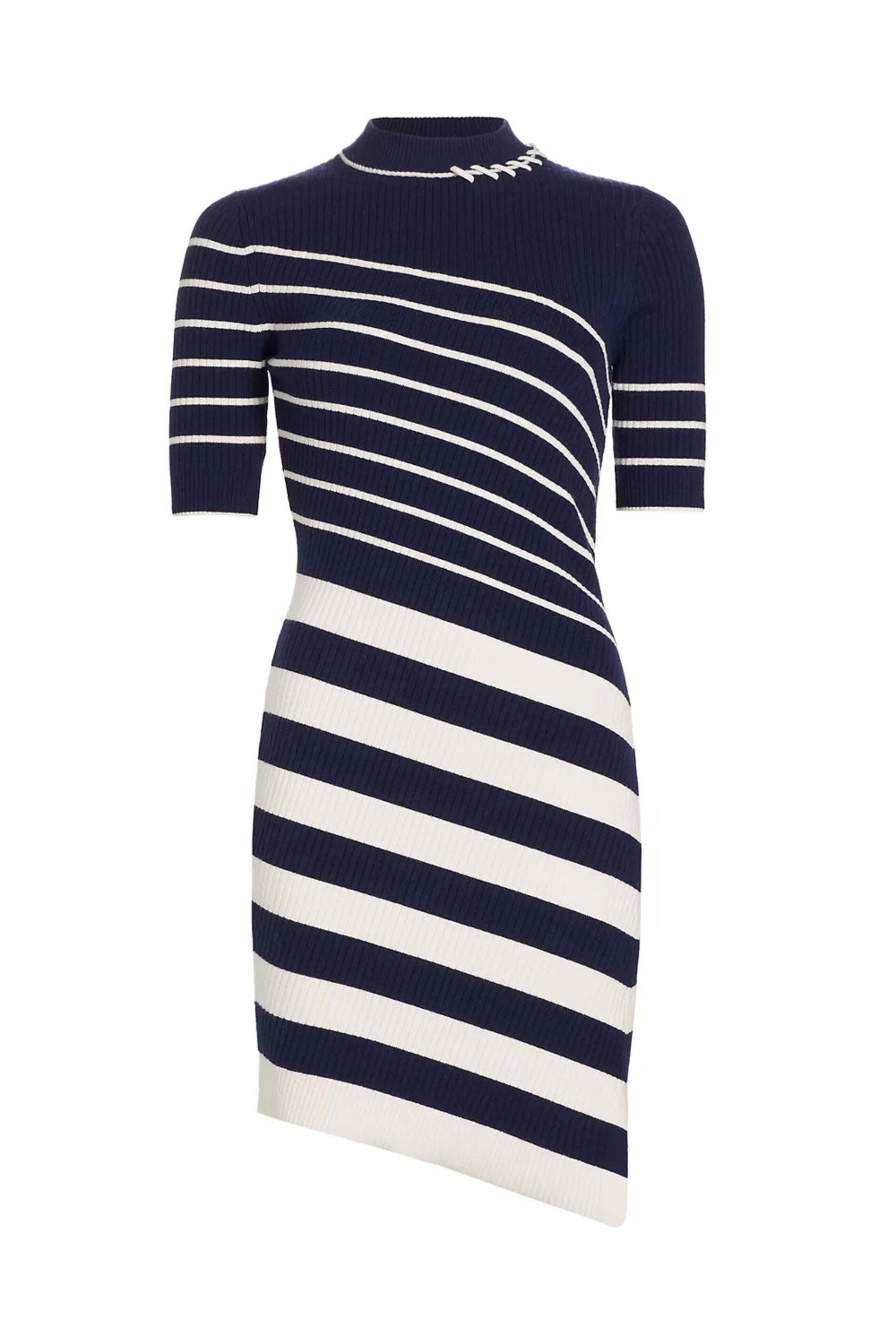 SIMKHAI Midnight Stripe Mock Neck Noah Mini Dress. Mock neck. Short sleeves. Slim silhouette. Mini length. Asymmetrical hem. Ribbed throughout. 100% merino wool.