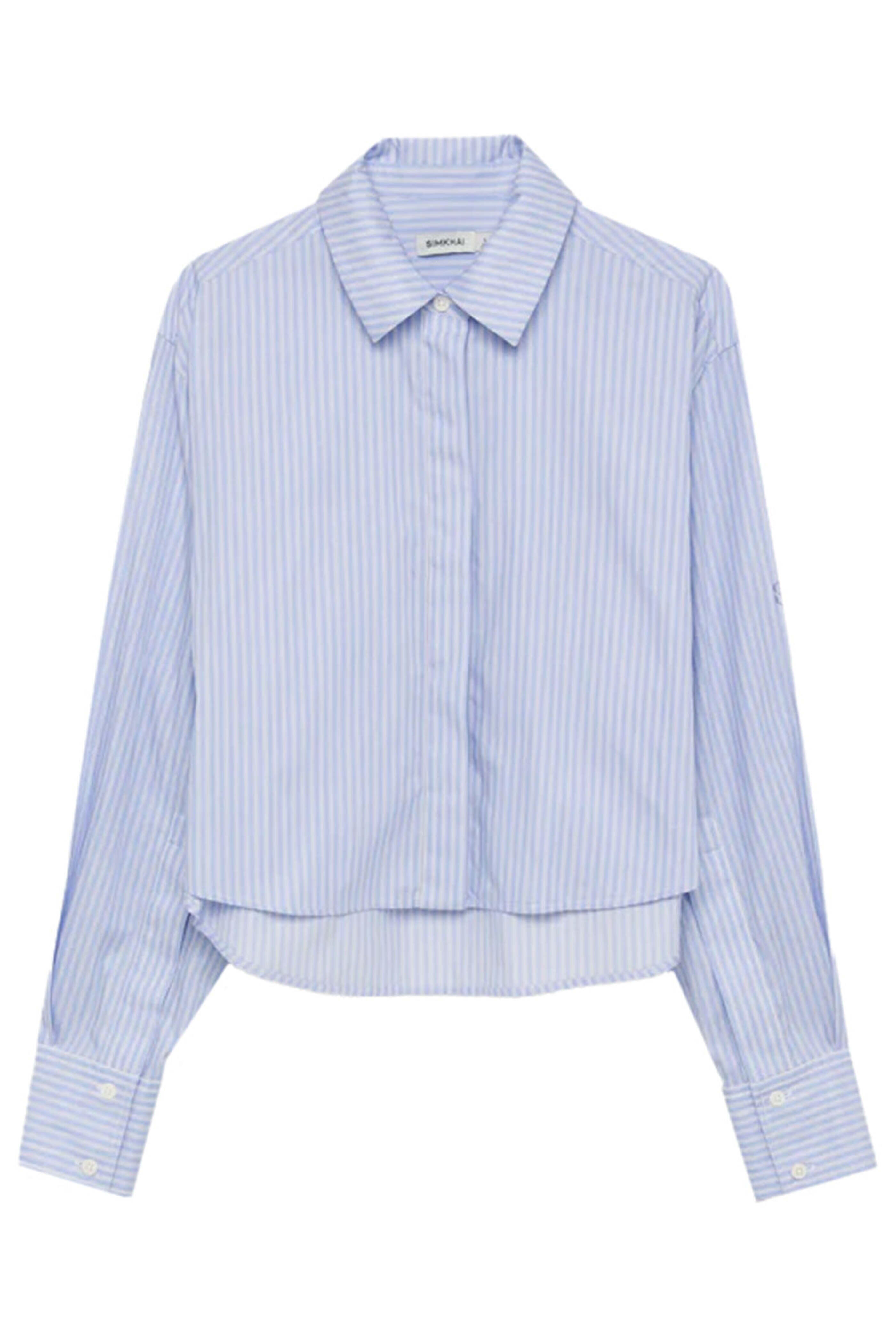SIMKHAI Stripe Renata Cropped Button Down Shirt. Collar. Long sleeves; button cuffs. Concealed button down front closure. Boxy fit. Cropped length. High low hem. 100% cotton.