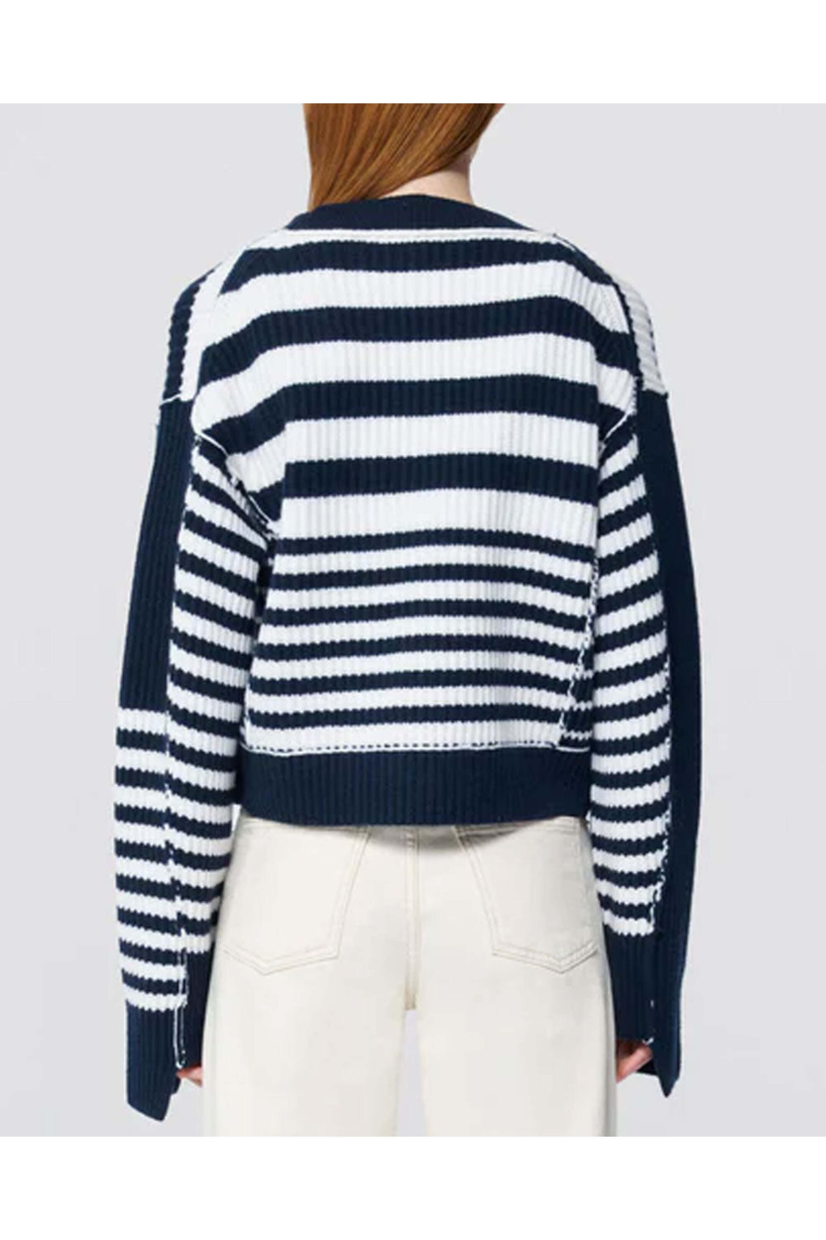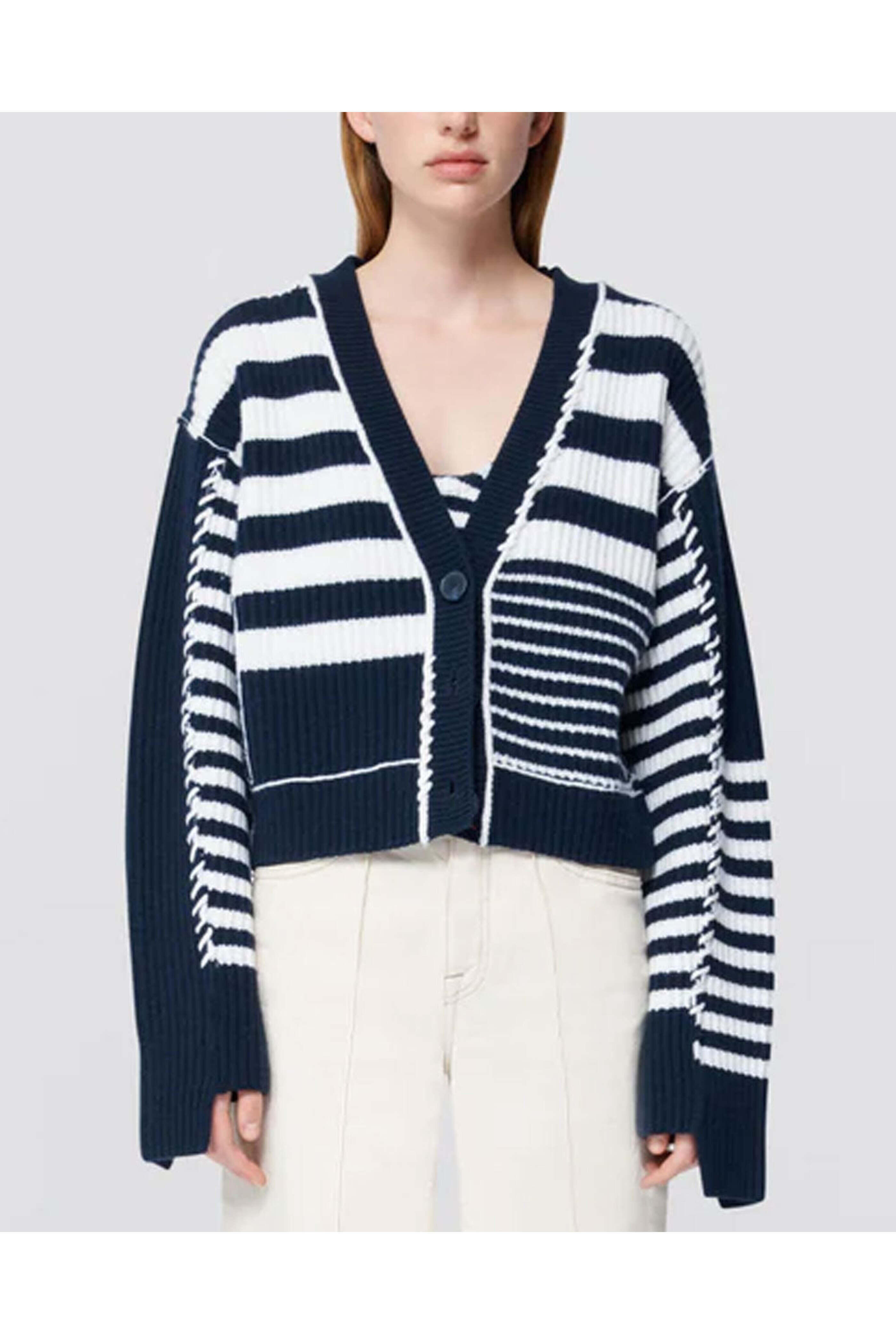 SIMKHAI Midnight Stripe Adara Cardigan. V neck. Drop shoulders. Long sleeves. Front button closure. Boxy fit. Knit fabrication. 90% wool, 10% cashmere.