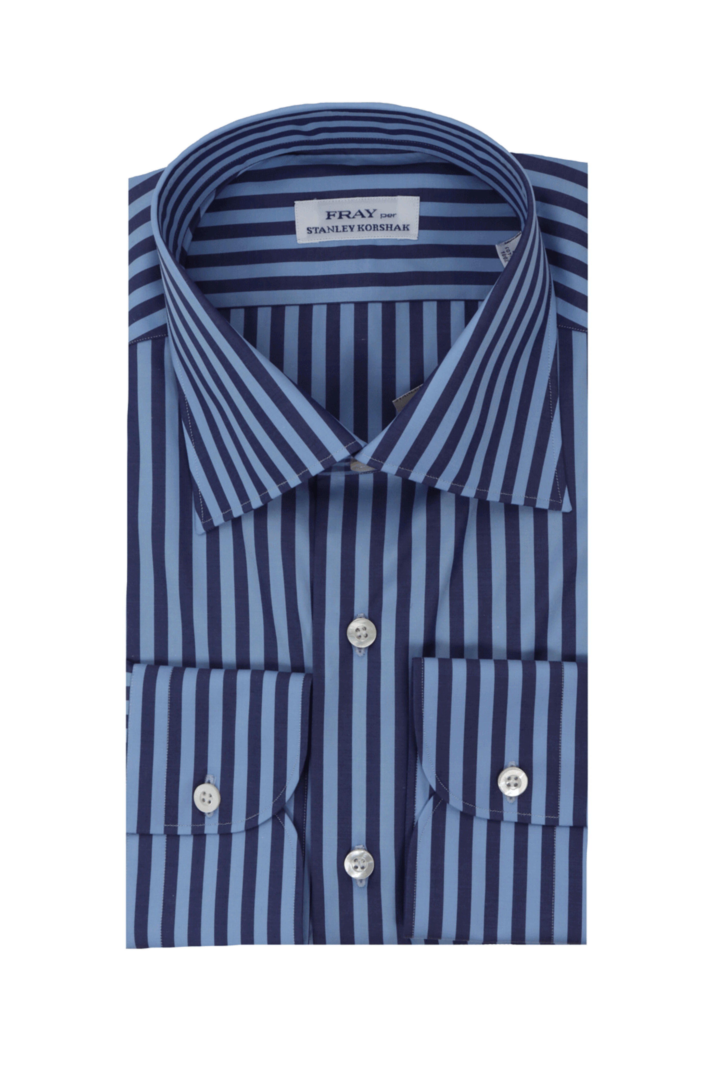 Fray Deep Indigo Striped Byron Dress Shirt. Point collar. Button down front closure. Barrel mitered cuffs. Long sleeves. SK exclusive. Made in Italy . 100% Cotton.
