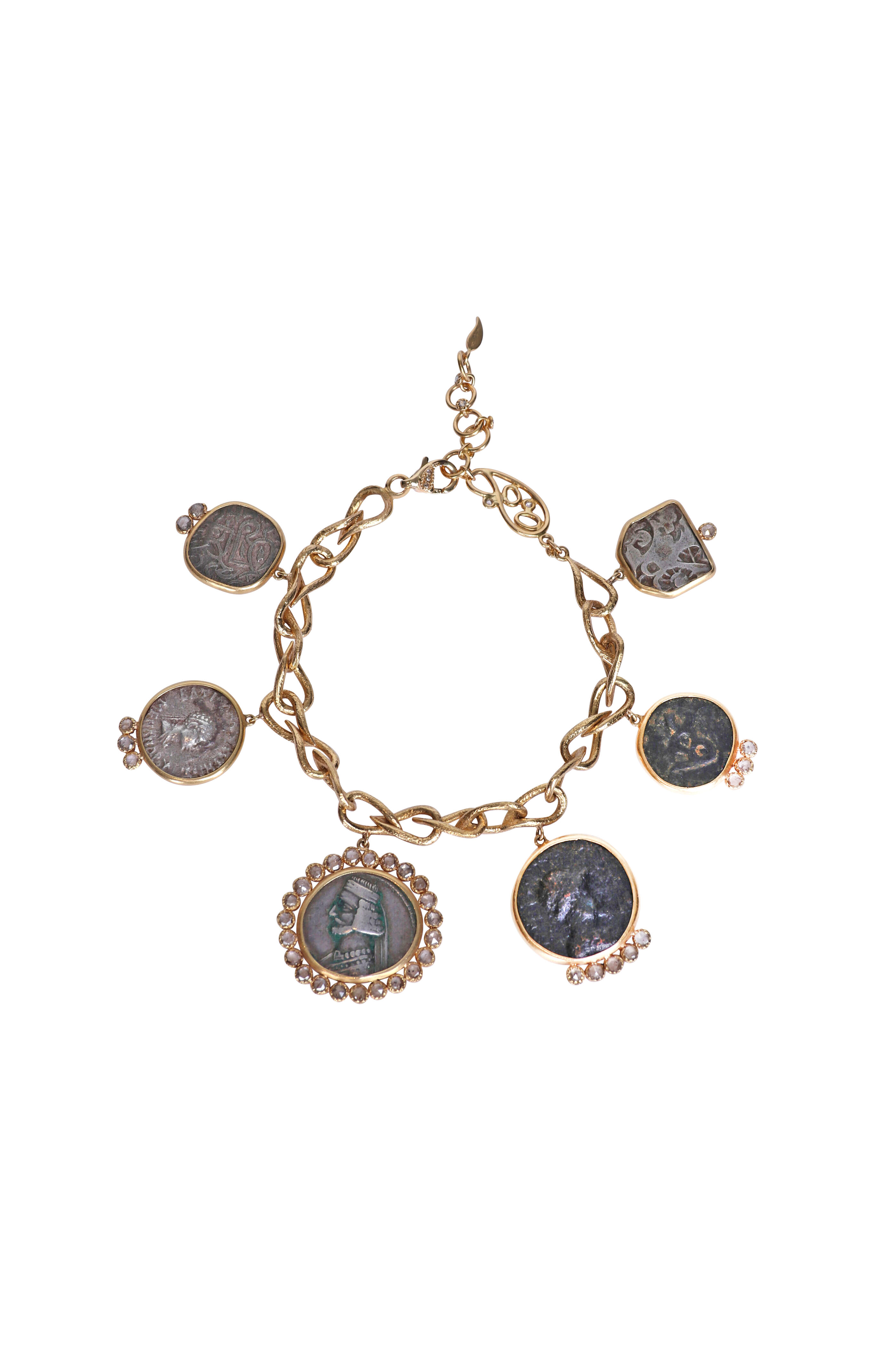 20k gold. Diamond. Antique coin. Charm design. Diamond scallop detailing. Gold bezel. Link chain. Lobster claw clasps. One of a kind. Handmade. Based in New York.