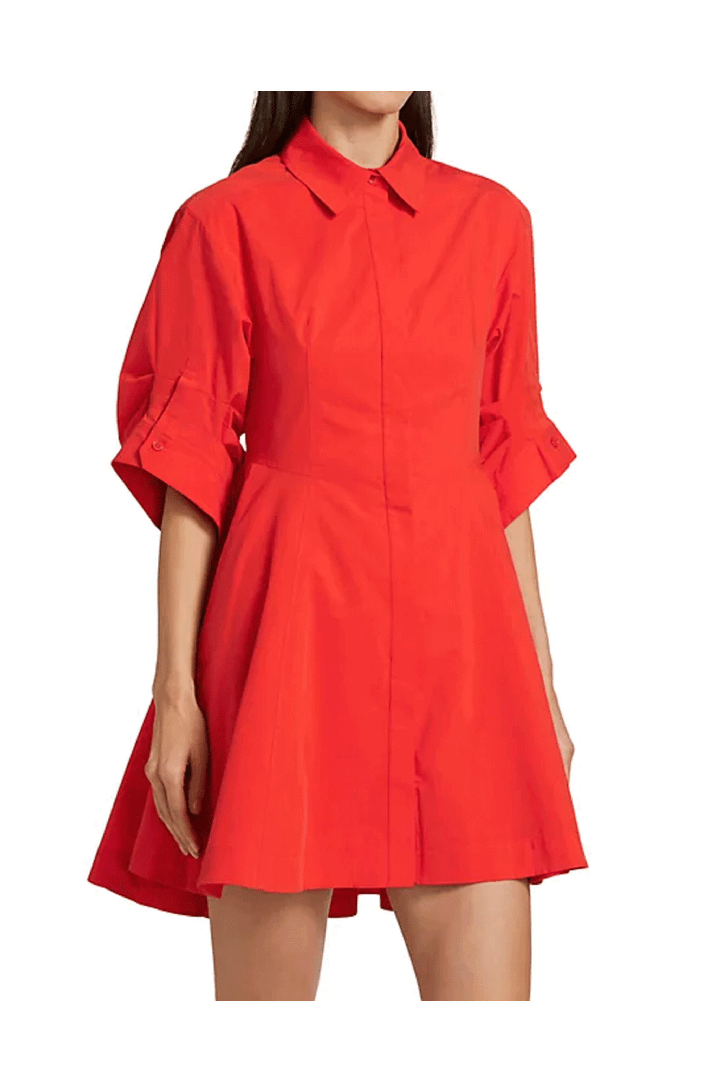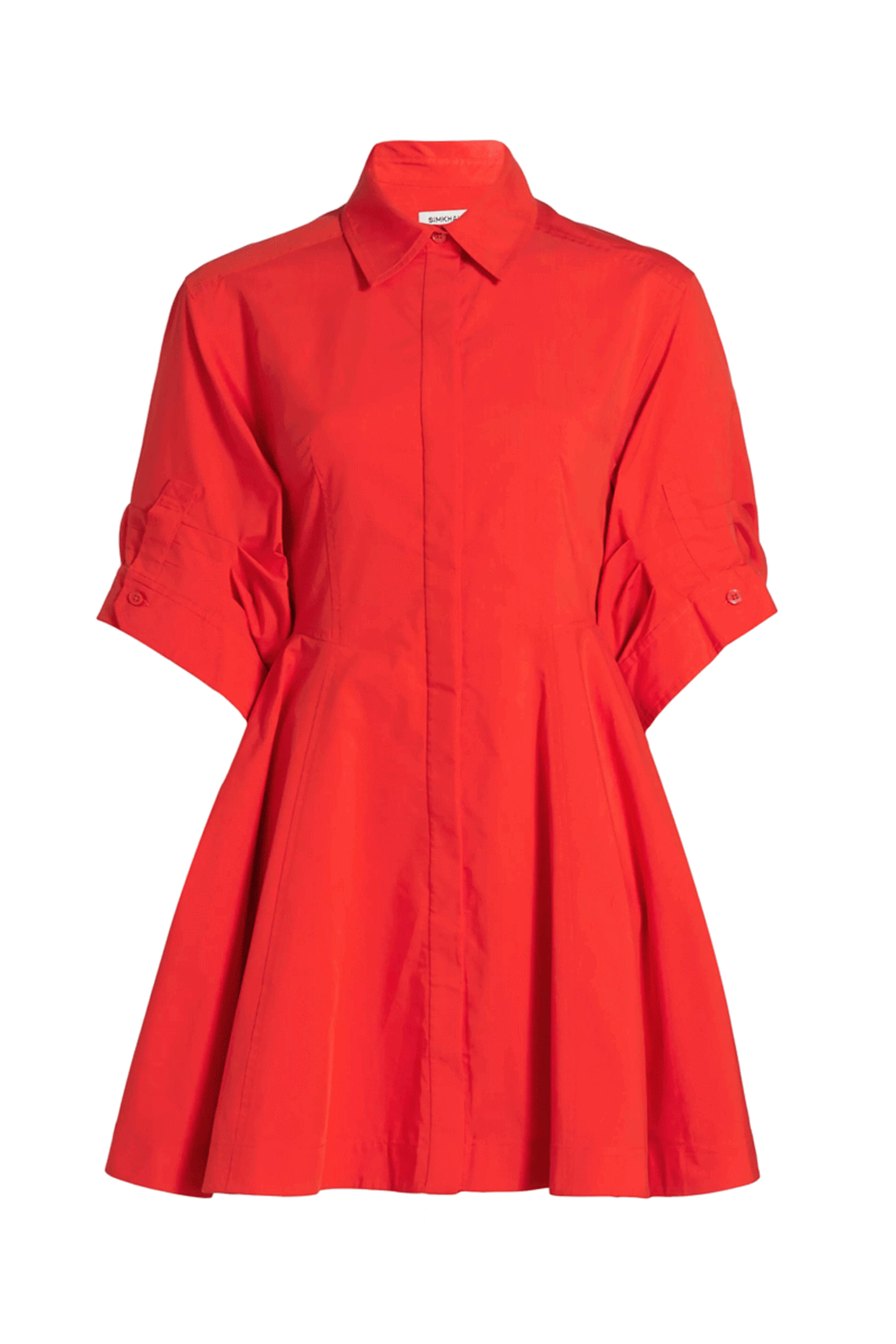 Simkhai Fiery Red Jazzie Mini Dress. Spread collar. Short puff sleeves, button cuffs. Side-seam pockets. Concealed button-front closure. 63% cotton, 37% polyester. Lining: 100% cotton.