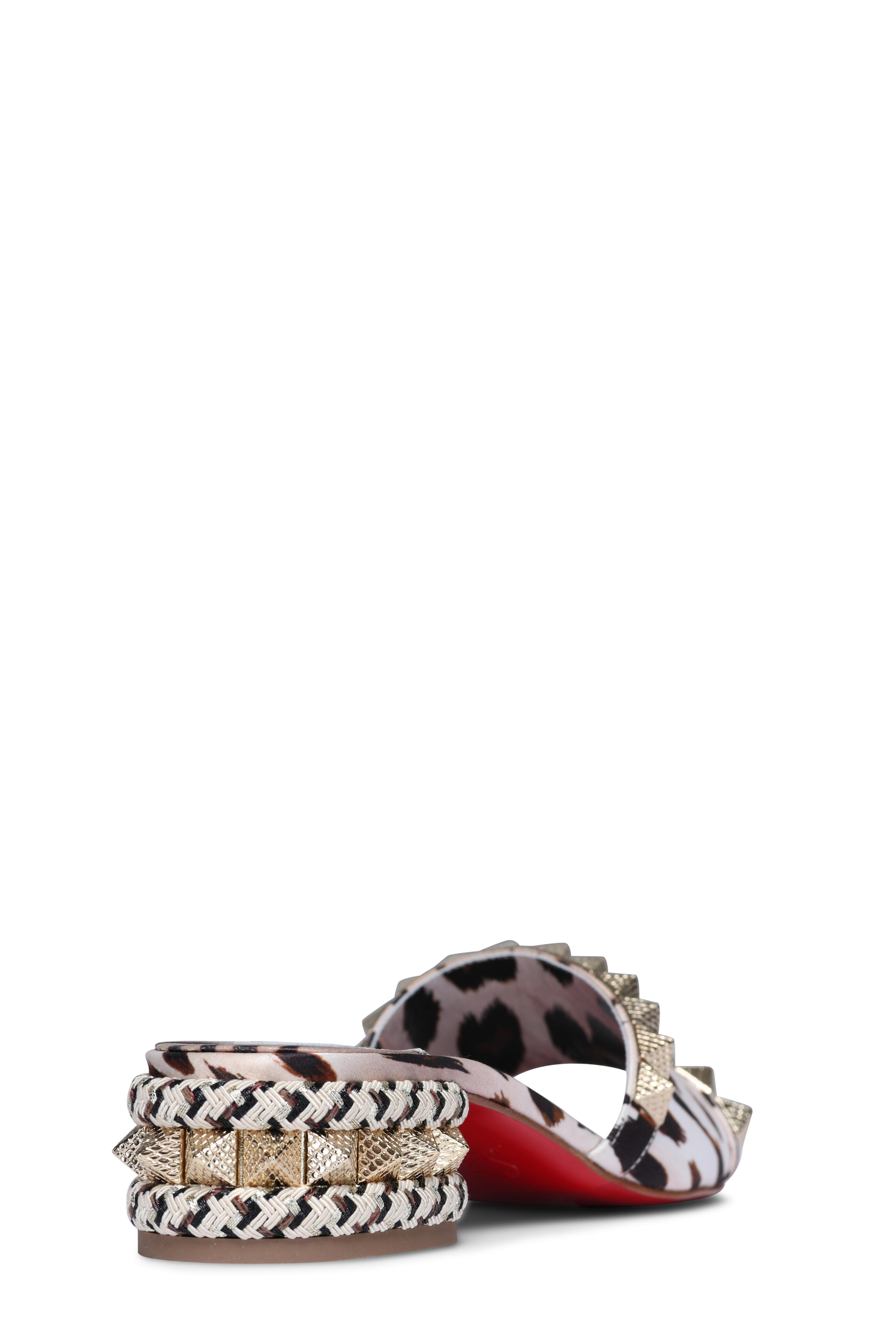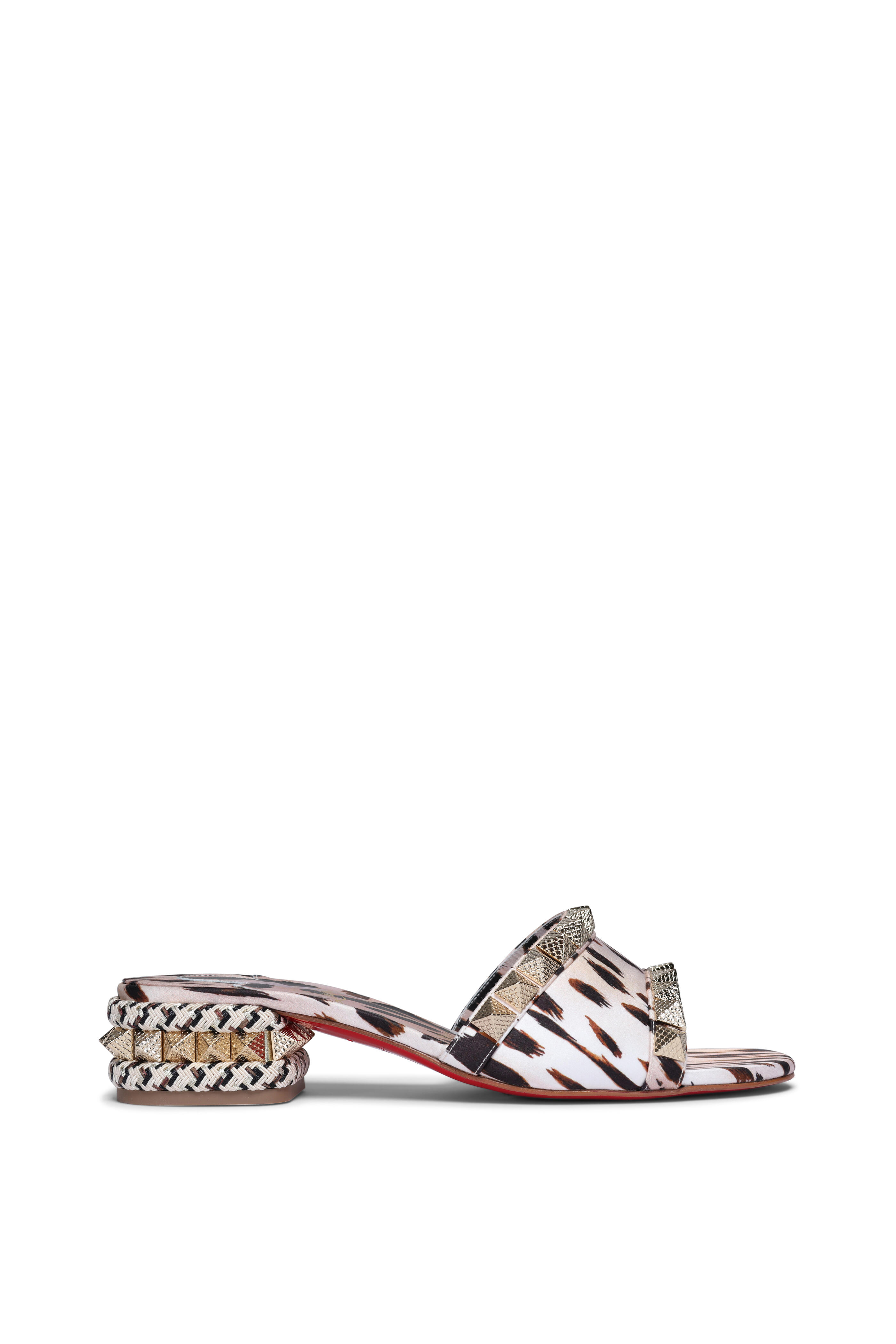 Satin upper. Leather lining. Signature red leather sole. Open toe. Wide band vamp. Slip-on style. Braiding and pyramid studded trim. Made in Italy. Heel measurement: 30mm.
