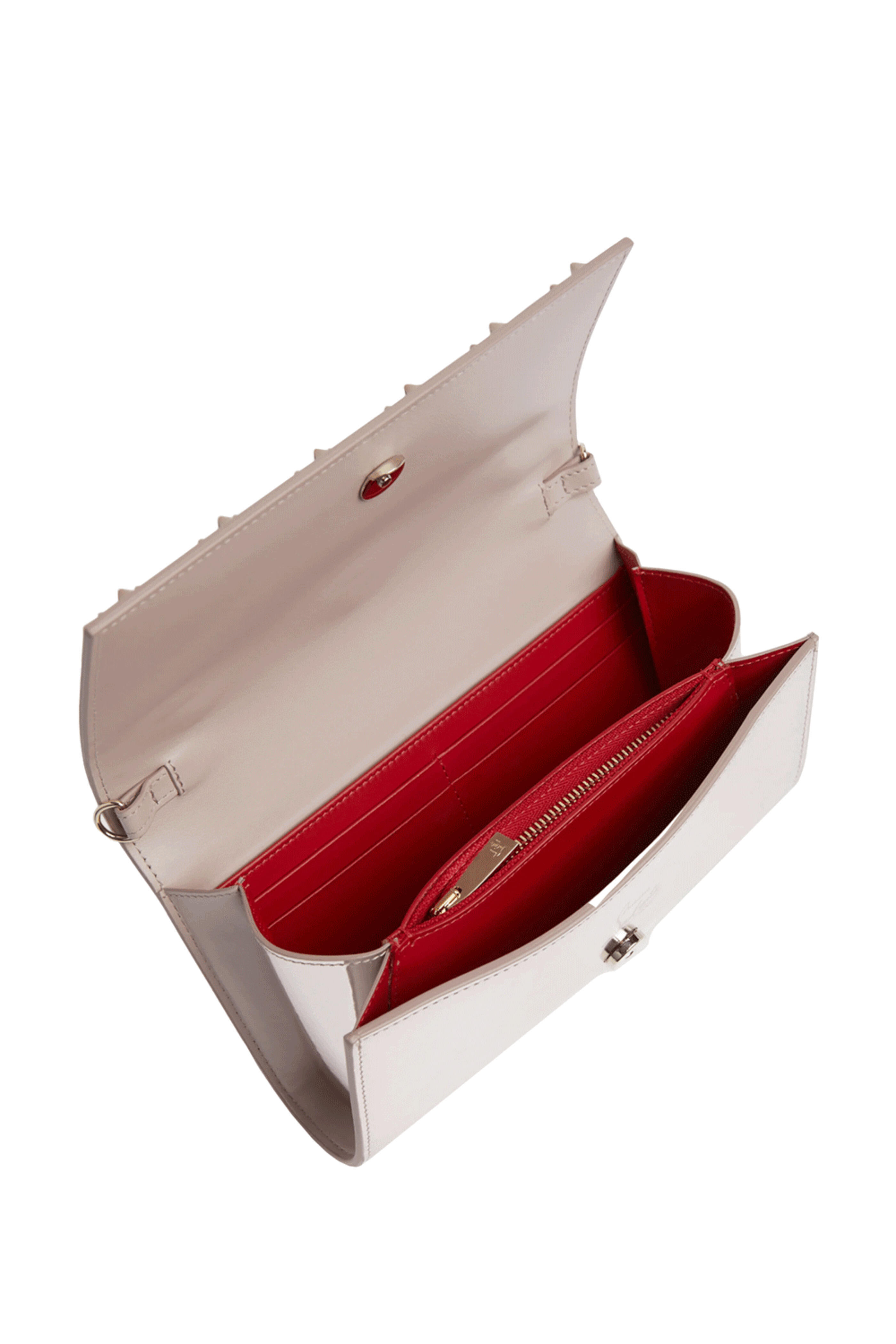 Christian Louboutin Paloma Loubinthesky Metallic Wallet on Chain in Specchio. Flap top with magnetic closure. Detachable chain shoulder strap. Embellished Loubinrhesky studs. Two main compartments. Four card slots. Zip pouch. Metallic leather upper. Signature red leather lining. 7.5â W x 4.1â H x 1.8â D. Made in Italy.