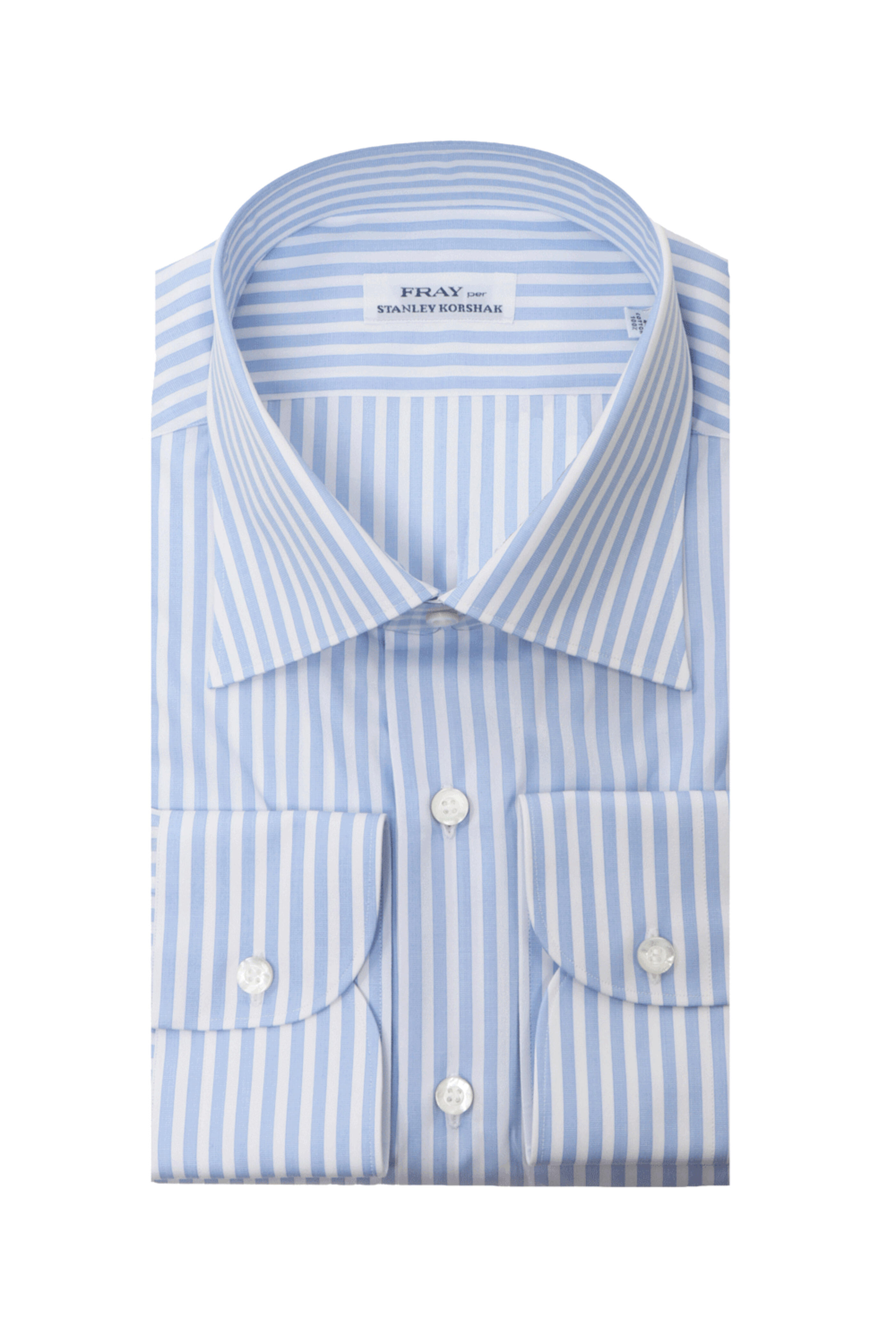 Fray White and Light Blue Striped Byron Dress Shirt . Spread collar. Button down front closure. Long sleeves. Single button cuffs. SK exclusive. Made in Italy . 100% Cotton.