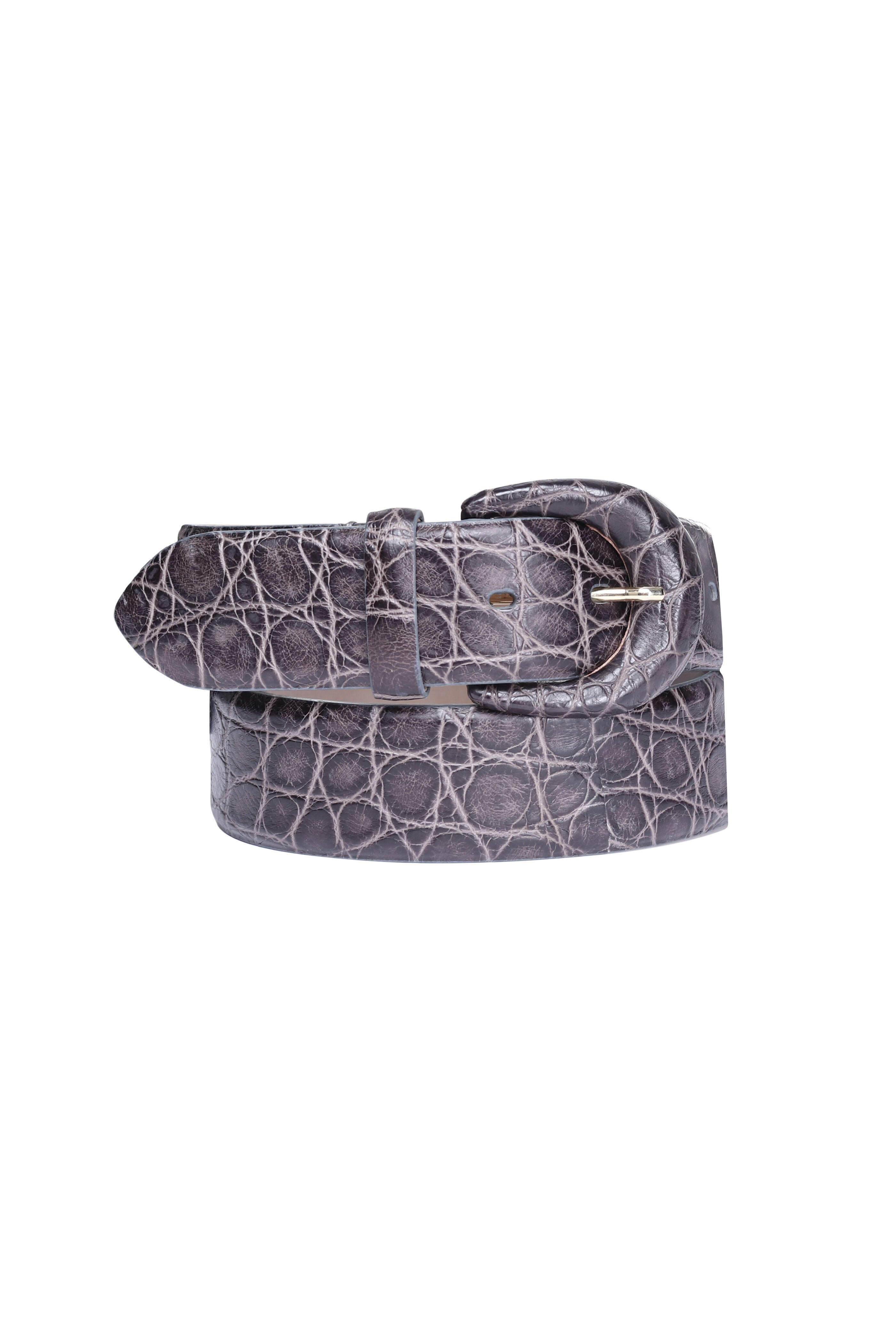 Brown crocodile leather outer. Round buckle. Adjustable. Tonal hardware. Made in Italy. Width: 40mm.