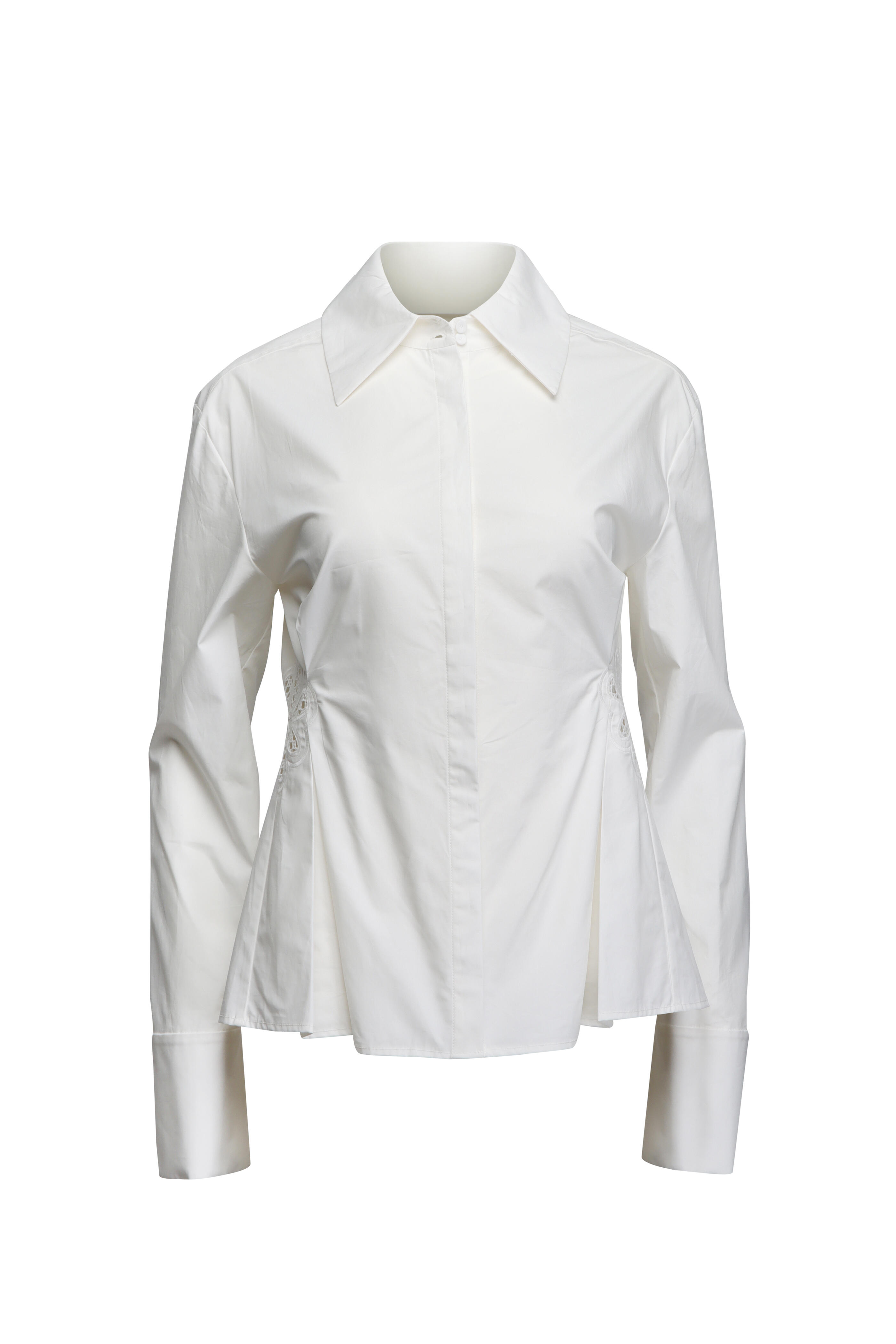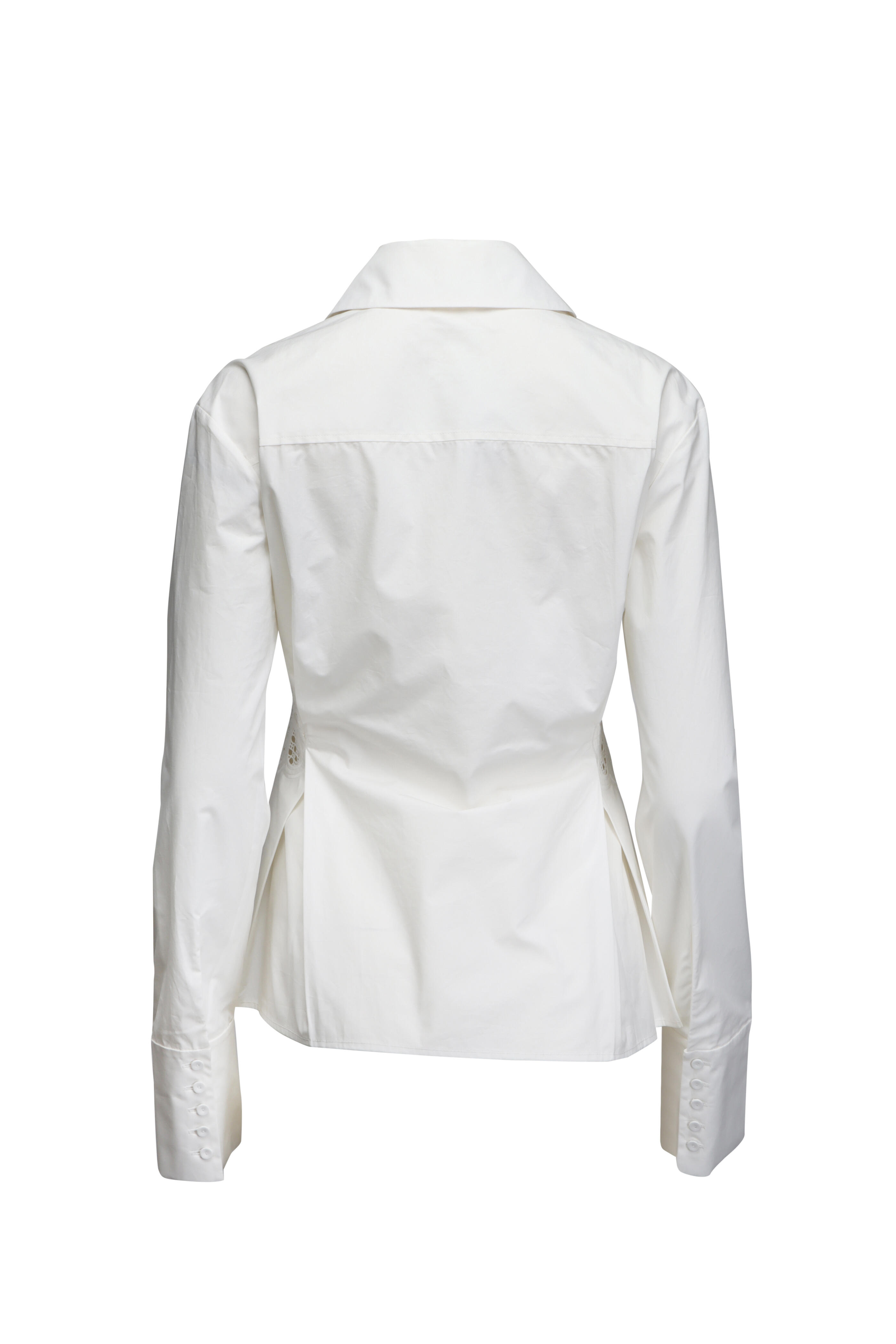 Collar. Long sleeves; button cuffs. Concealed button down front closure. Ruched at natural waist; embroidered detail at sides. Fitted silhouette. Straight hem. Imported. Bust approx. 85 cm (Size S). Waist approx. 68 cm (Size S). 100% cotton outer, 100% polyester embroidery. Dry clean.