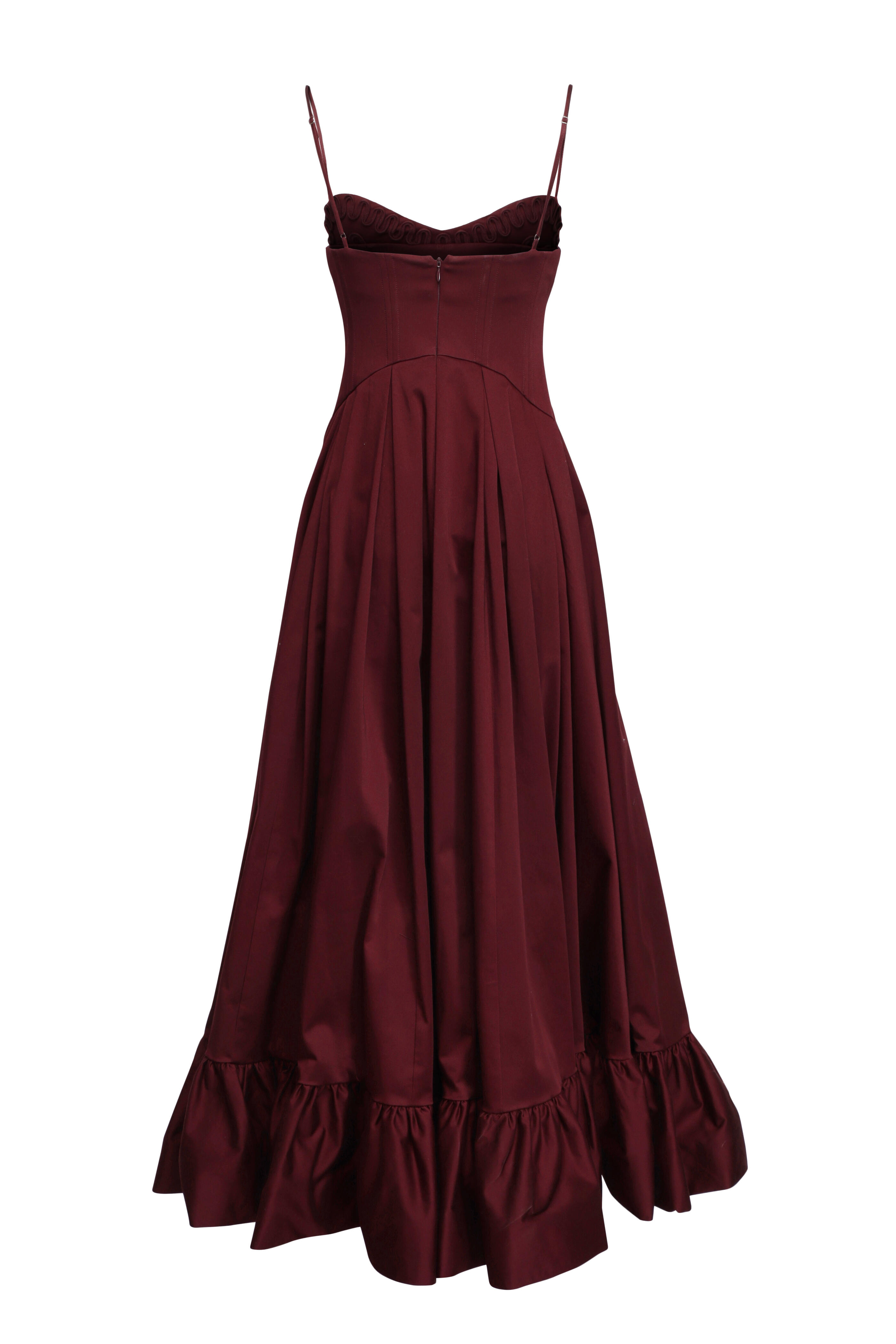 Sweetheart neckline. Square back. Sleeveless; thin adjustable shoulder straps. Inverted curve drop waist. Concealed back zip closure. Aline skirt. Flounce hem. Imported. Bust 85 cm (Size S). Waist 68 cm (Size S). Hip 95 cm (Size S). 97% cotton, 3% elastane outer, 100% cotton embroidery, 52% polyester, 48% viscose lining. Dry clean.