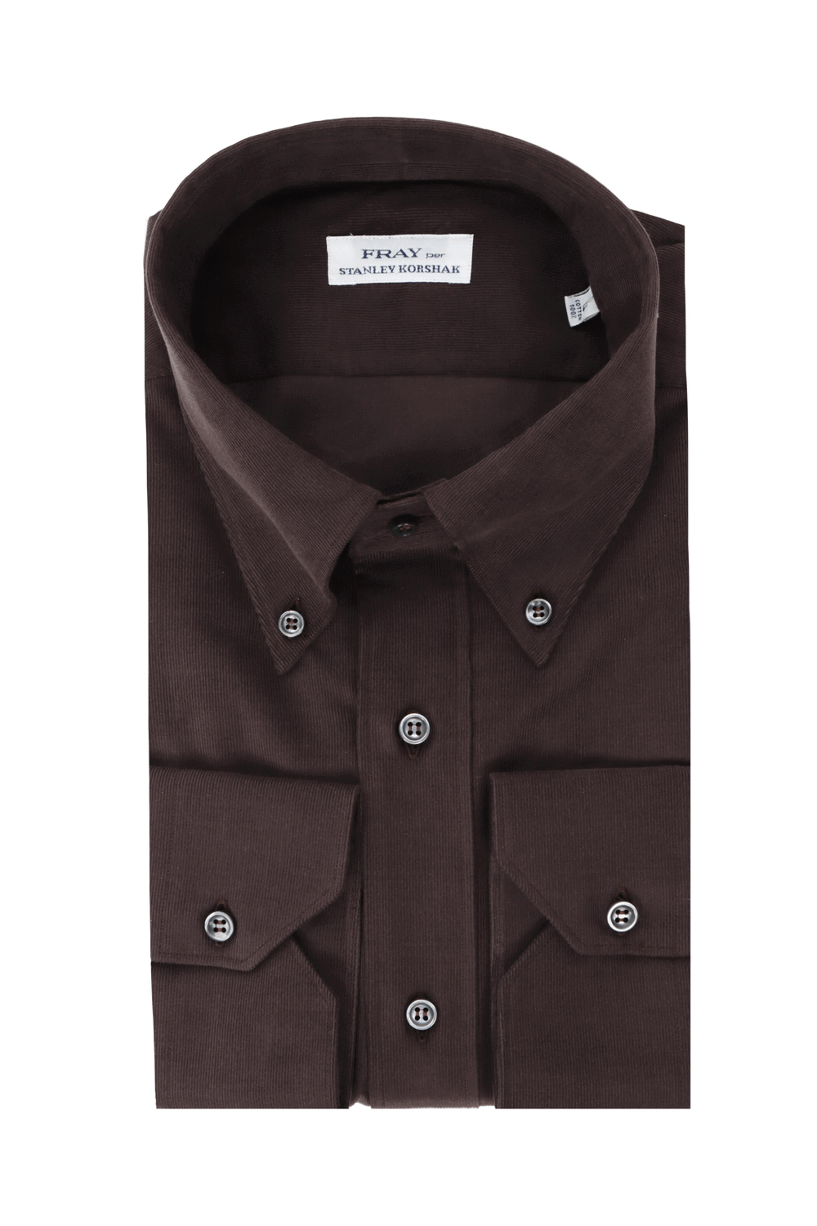 Fray Brown Corduroy Boston Sportshirt. Semi spread collar. Button down front. Long sleeves. Single button cuffs. Stanley Korshak Exclusive. Made in Italy. 100% cotton.