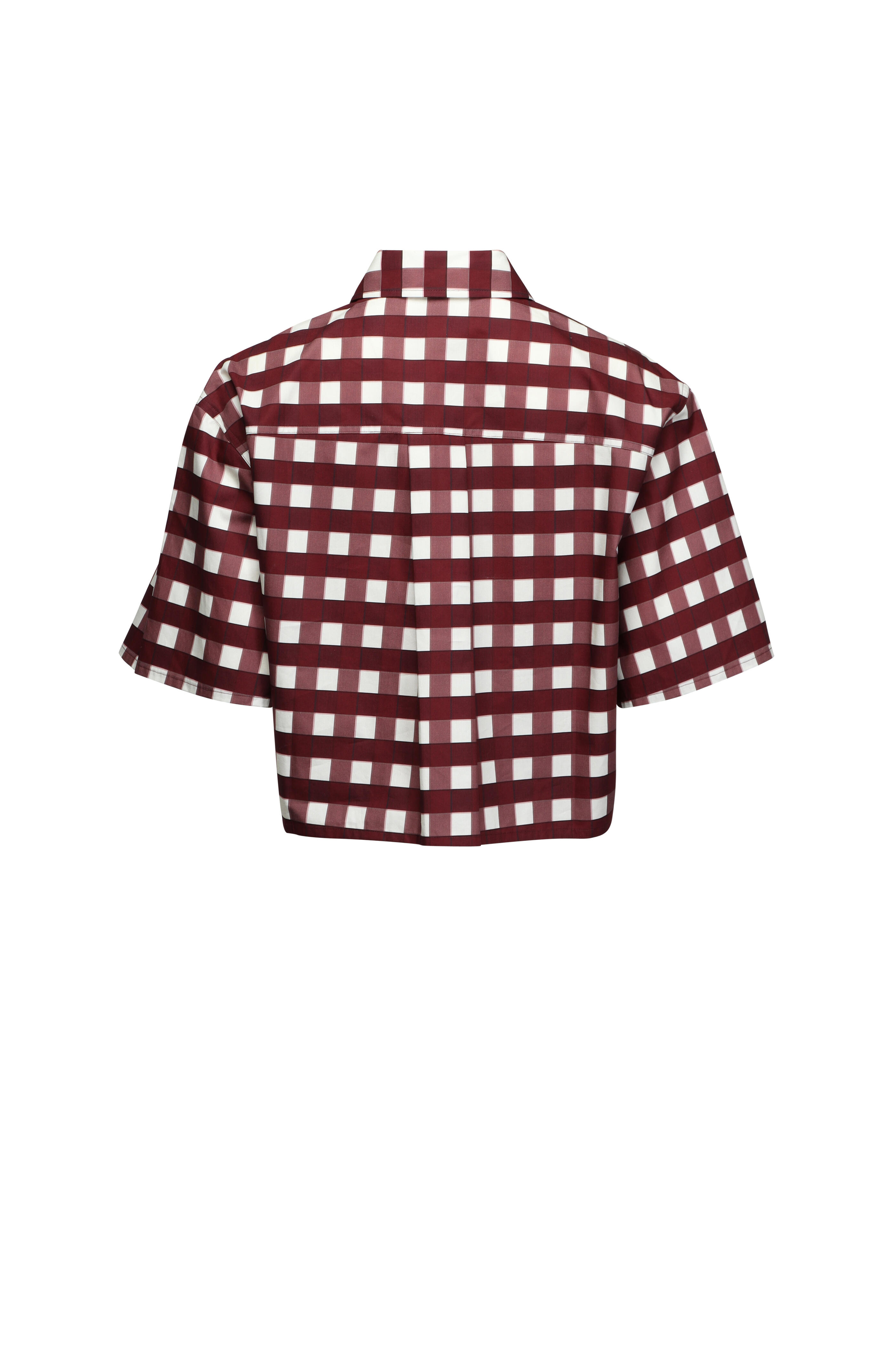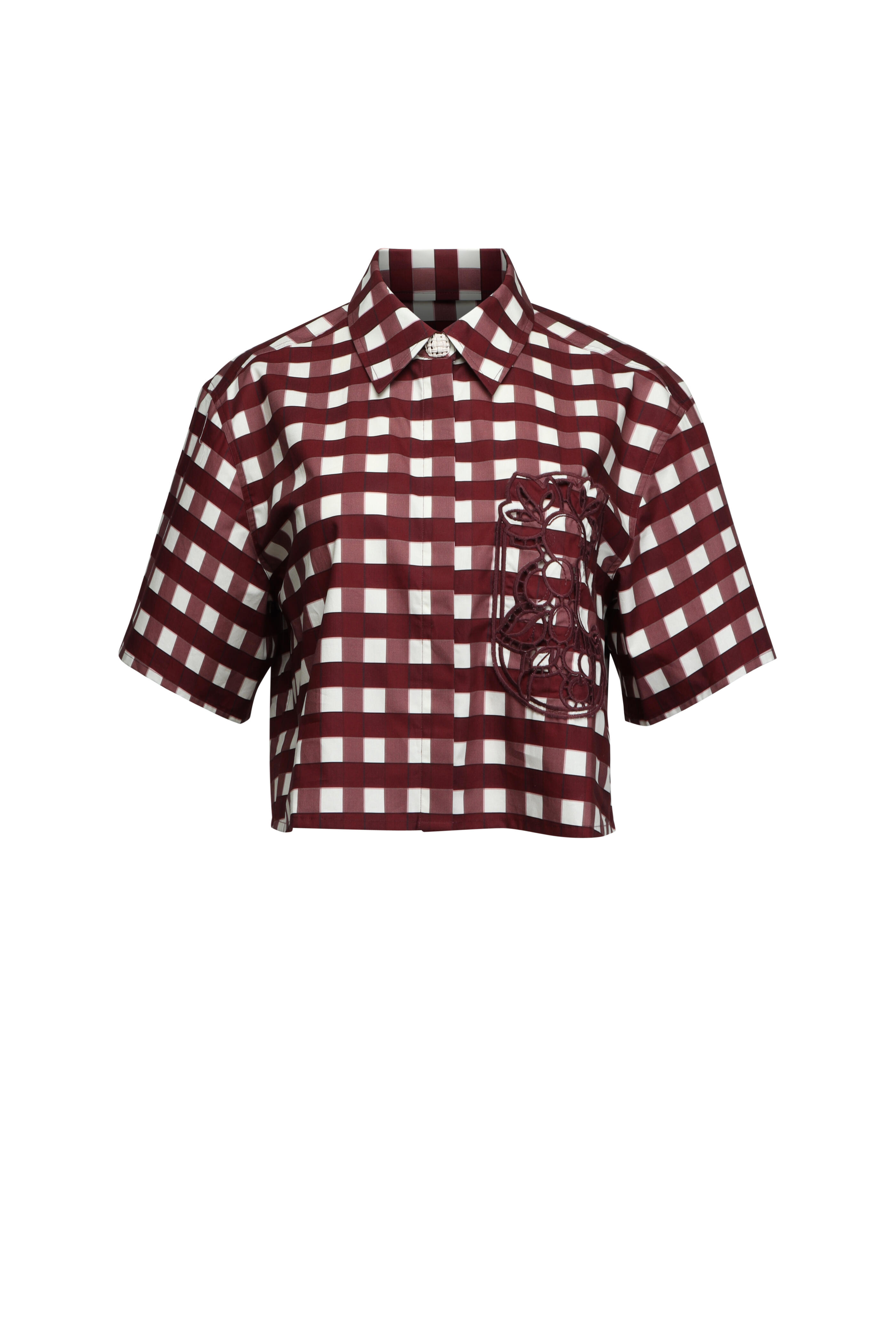Collar. Short sleeves. Concealed button down front closure. Single chest patch pocket. Boxy fit. Cropped length. Imported. Bust approx. 90 cm (Size S). 100% cotton outer, 100% polyester. Dry clean.