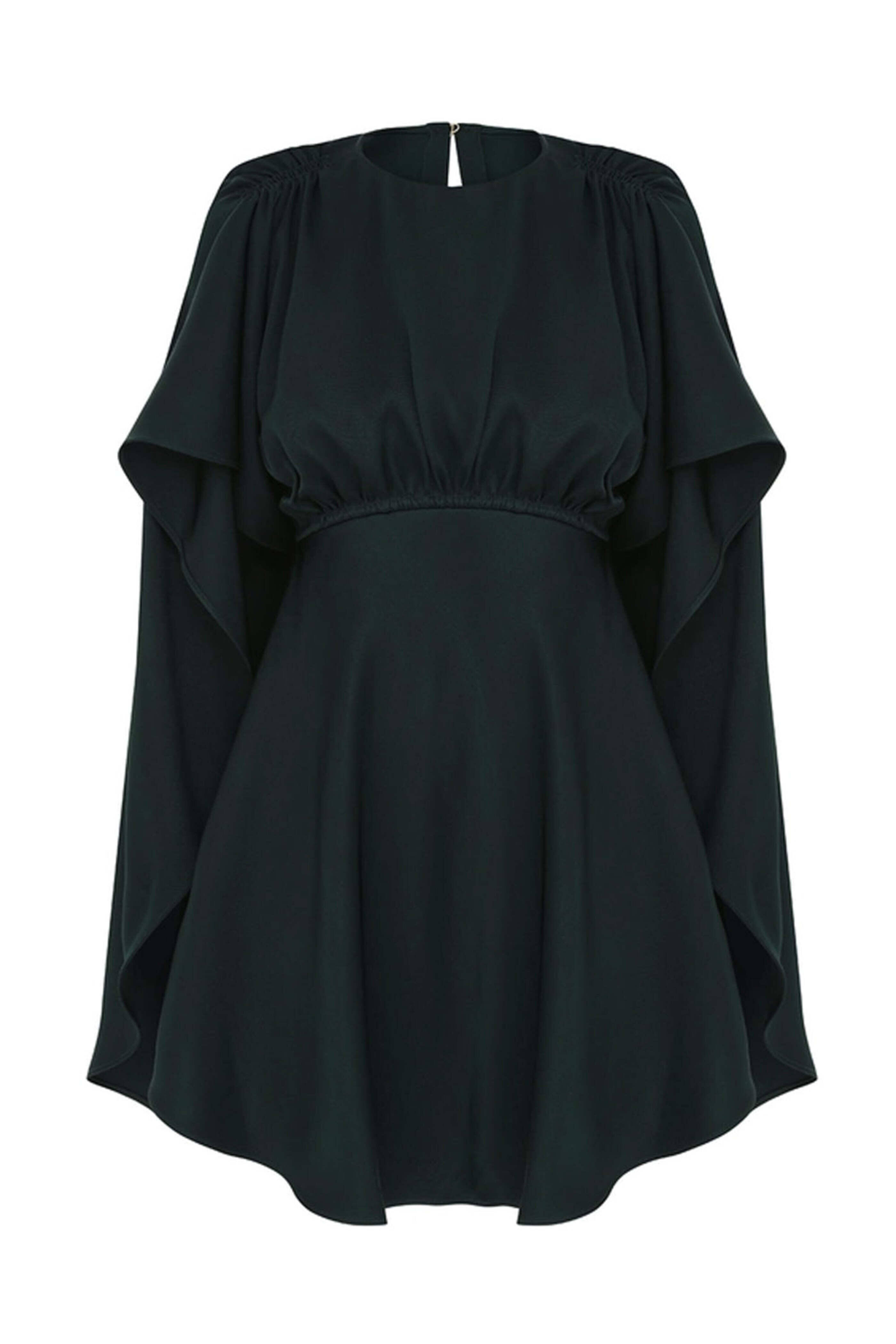 Zimmermann Bottle Green Eden Cascading Mini Dress. Round neck. Back button closure; open back. Short cape sleeves; cape drape detail. Empire waist. Mini length. Rounded hem. 100% viscose.