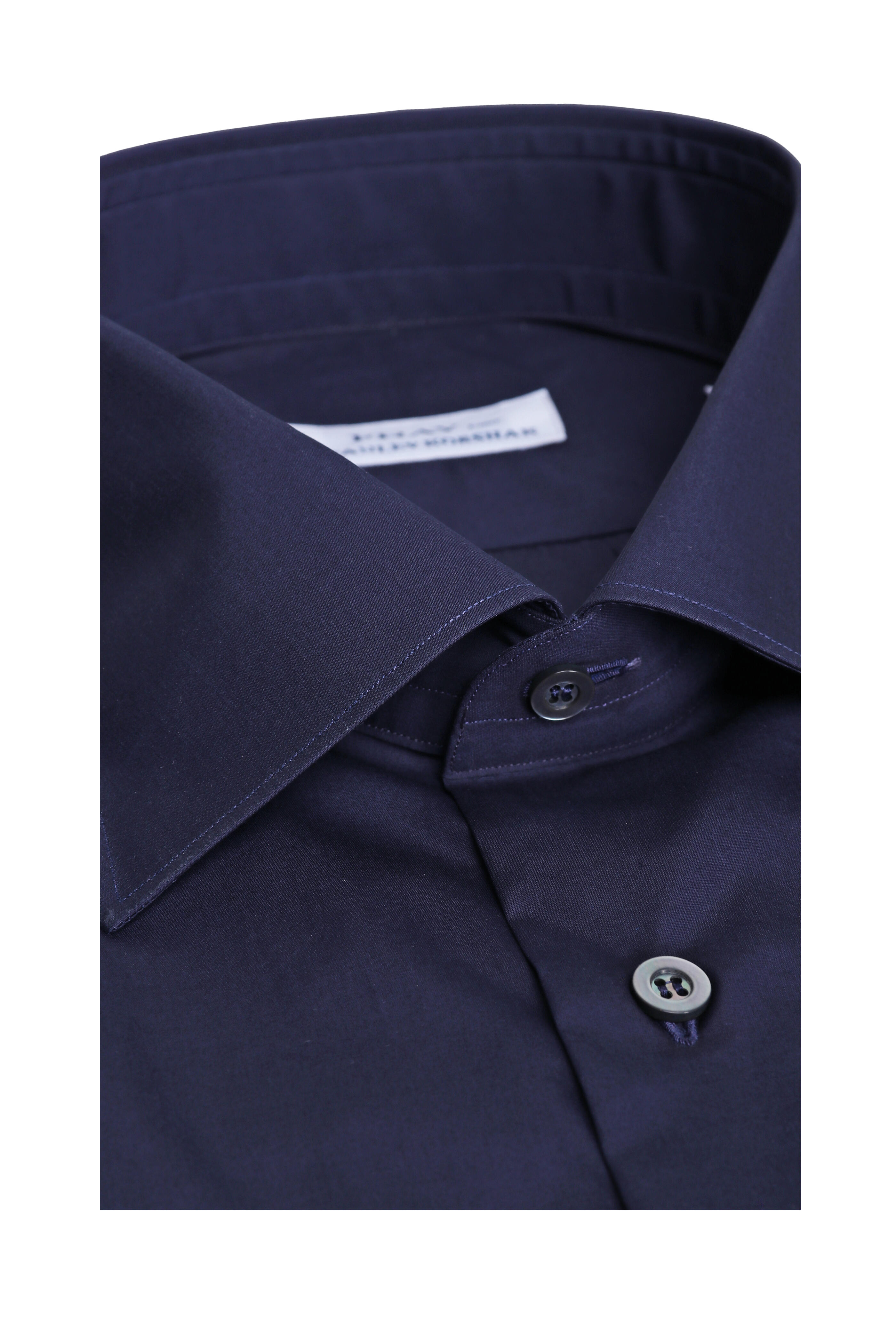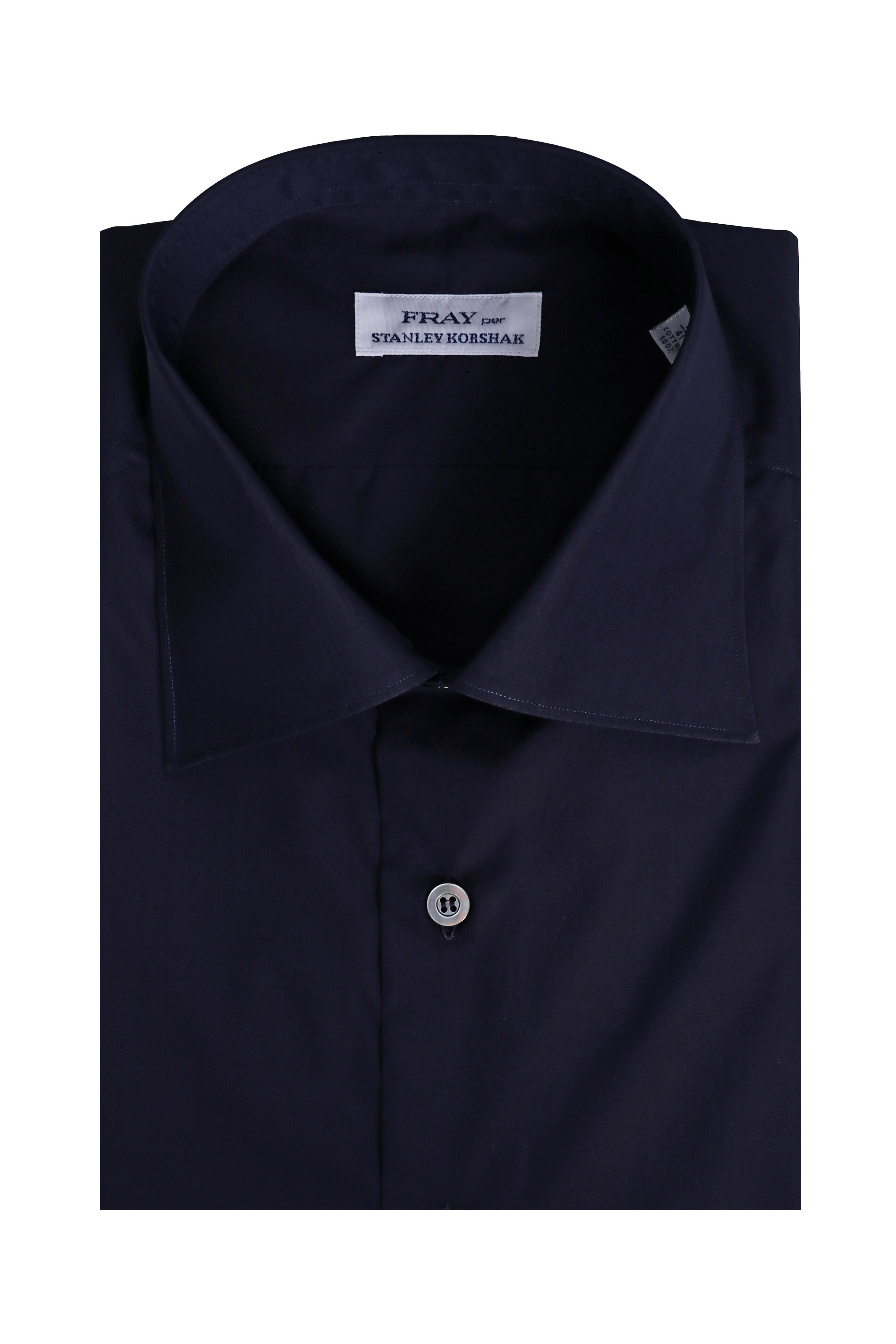 Spread collar. French front button placket. Single button barrel cuffs. Made in Italy. 100% cotton. Dry clean.