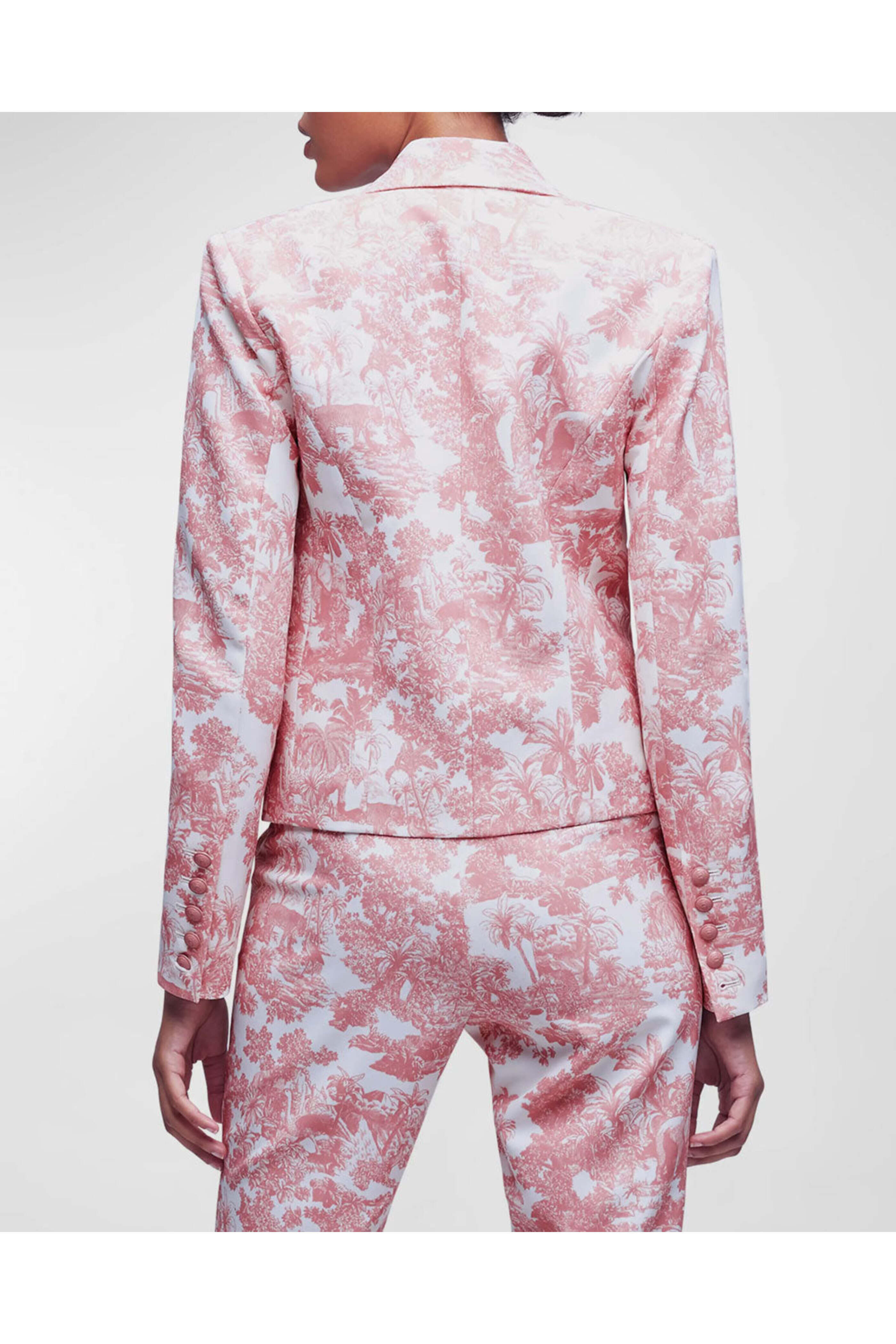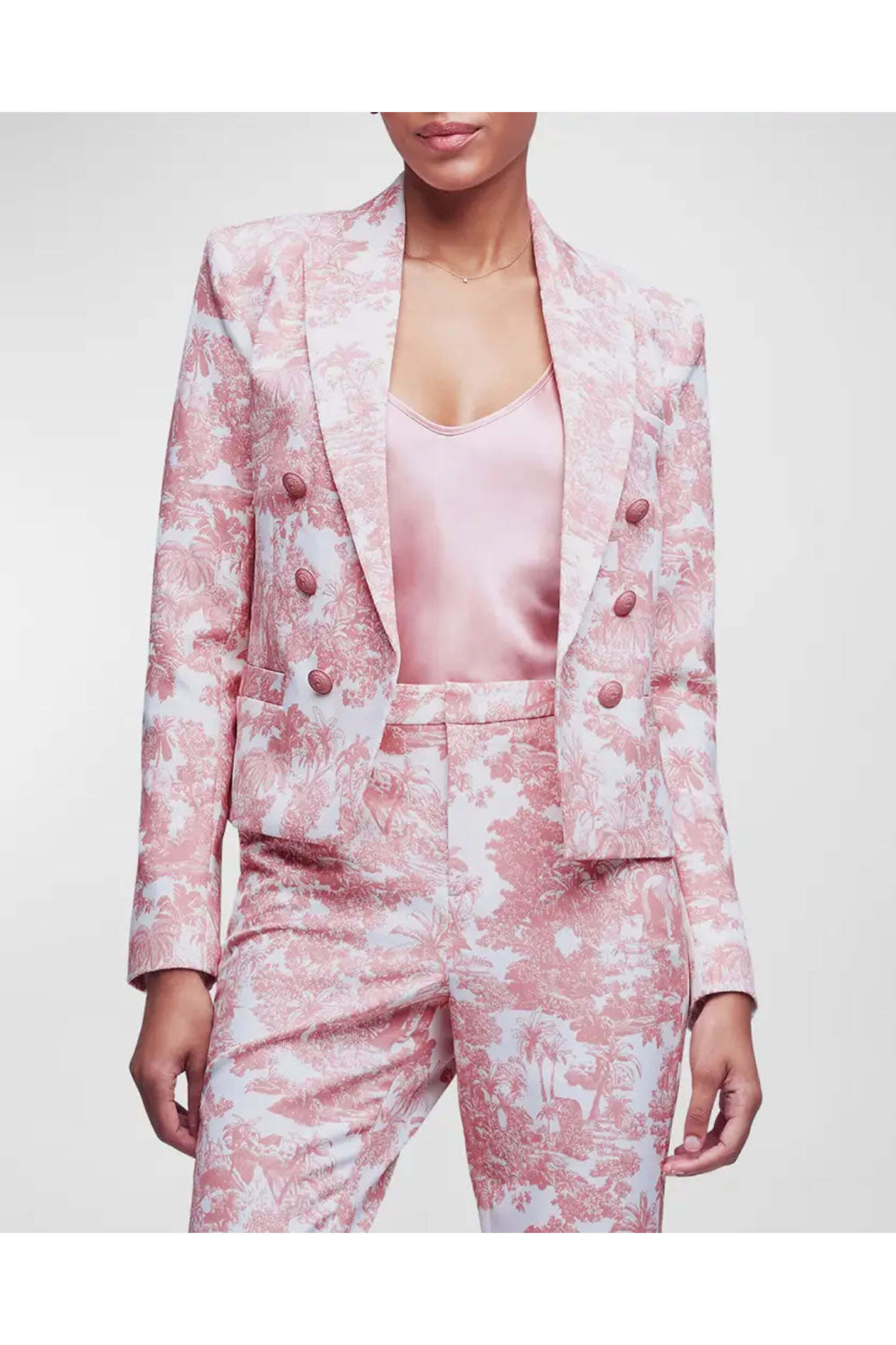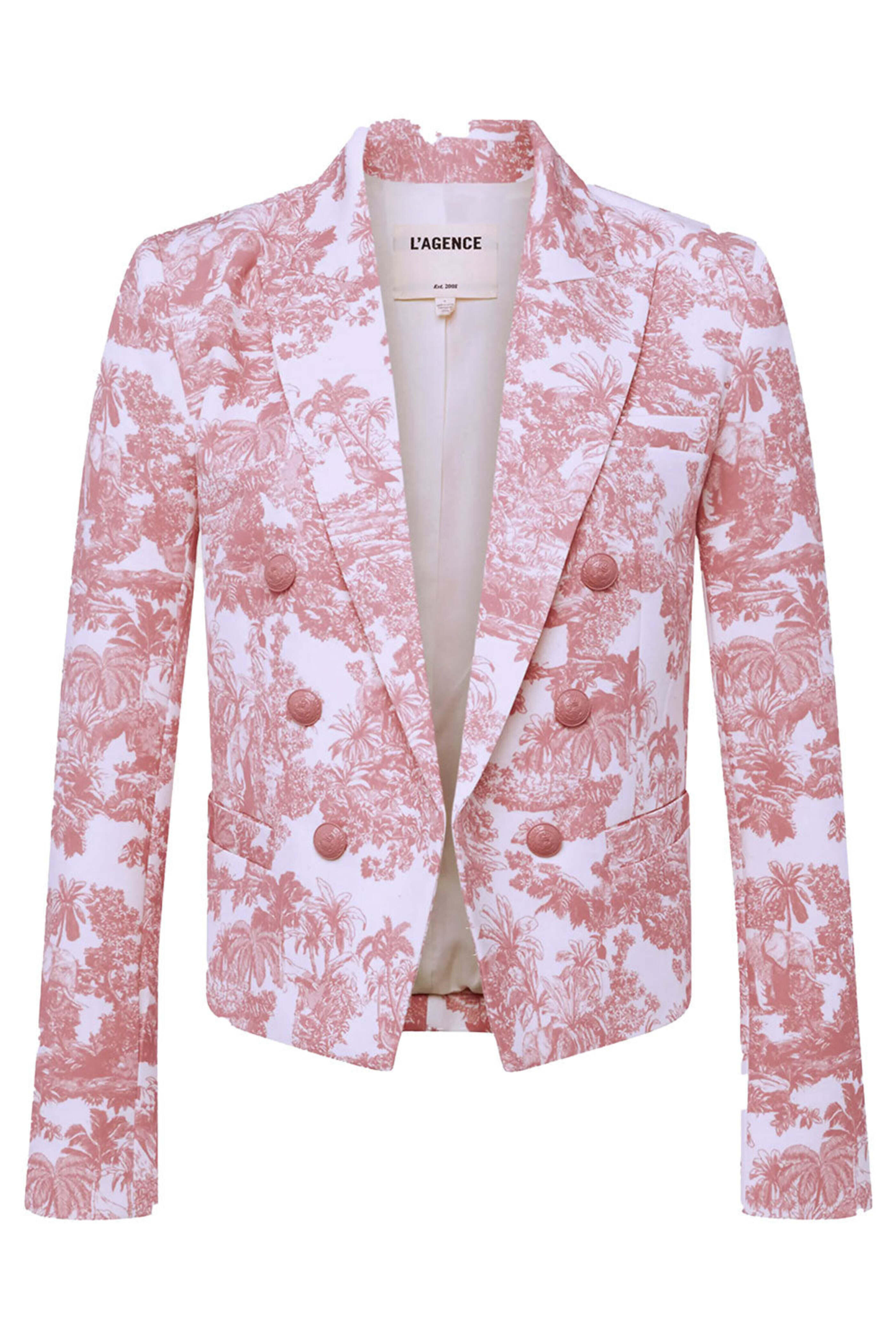 L'Agence Rose & Tan Double Breasted Blazer. Peak lapels; double-breasted front . Long sleeves; button cuffs. Waist welt pockets. Cropped length. Slim fit . Polyester/spandex.
