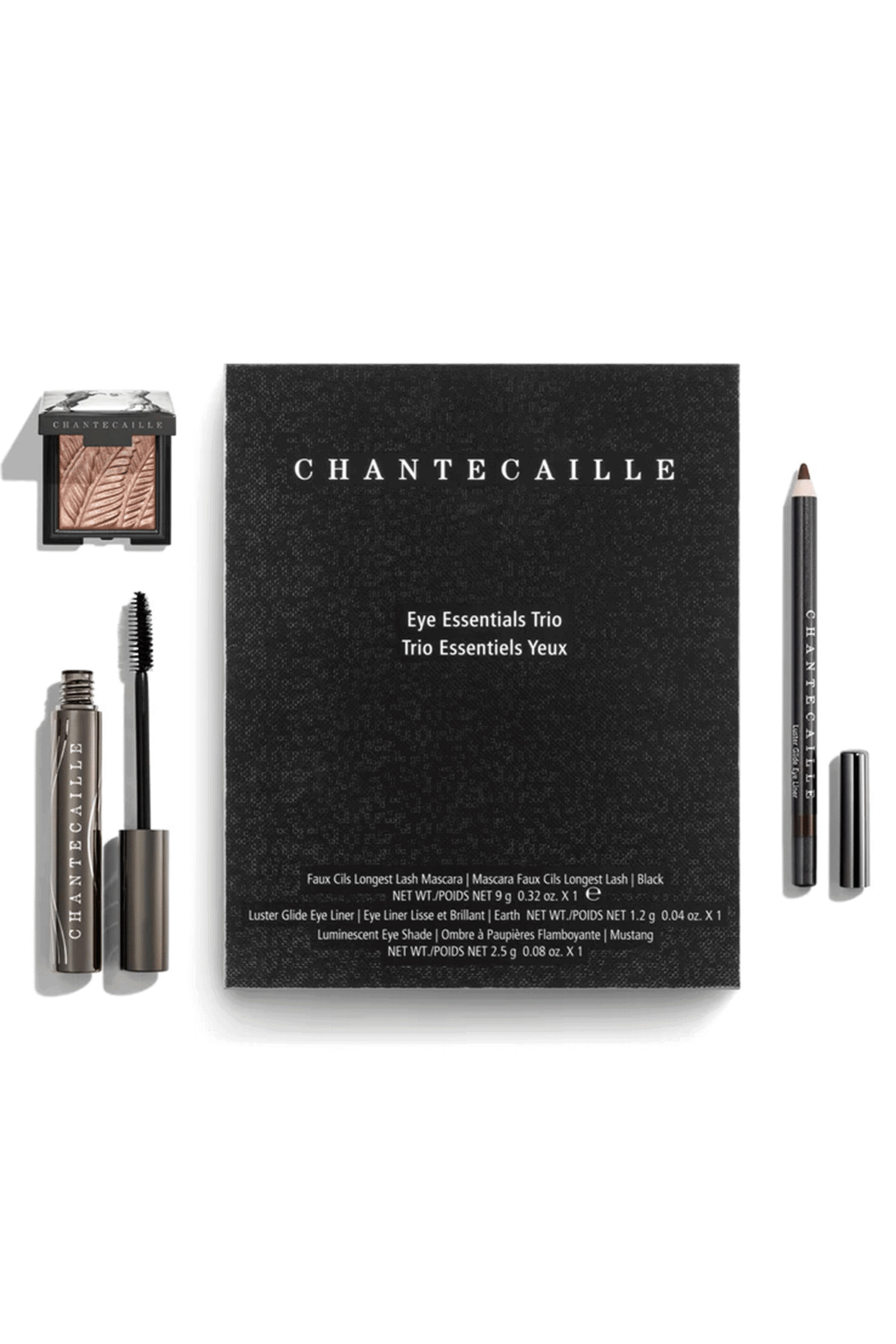 Chantecaille Eye Essentials Trio. Set Includes: Faux Cils Longest Lash Mascara, Luster Glide Jasper, Luminescent Eye Shade - Mustang. Faux Cils Longest Lash Mascara is an iconic formula infused with rose oil and a lash peptide for glossy, voluminous lashes.. Luster Glide Eye Liner in Jasper creates luxe lashline definition in a deep bronze hue.. Luminescent Eye Shade in Mustang is a rich cinnamon hue that adds alluring metallic shimmer to the eye.