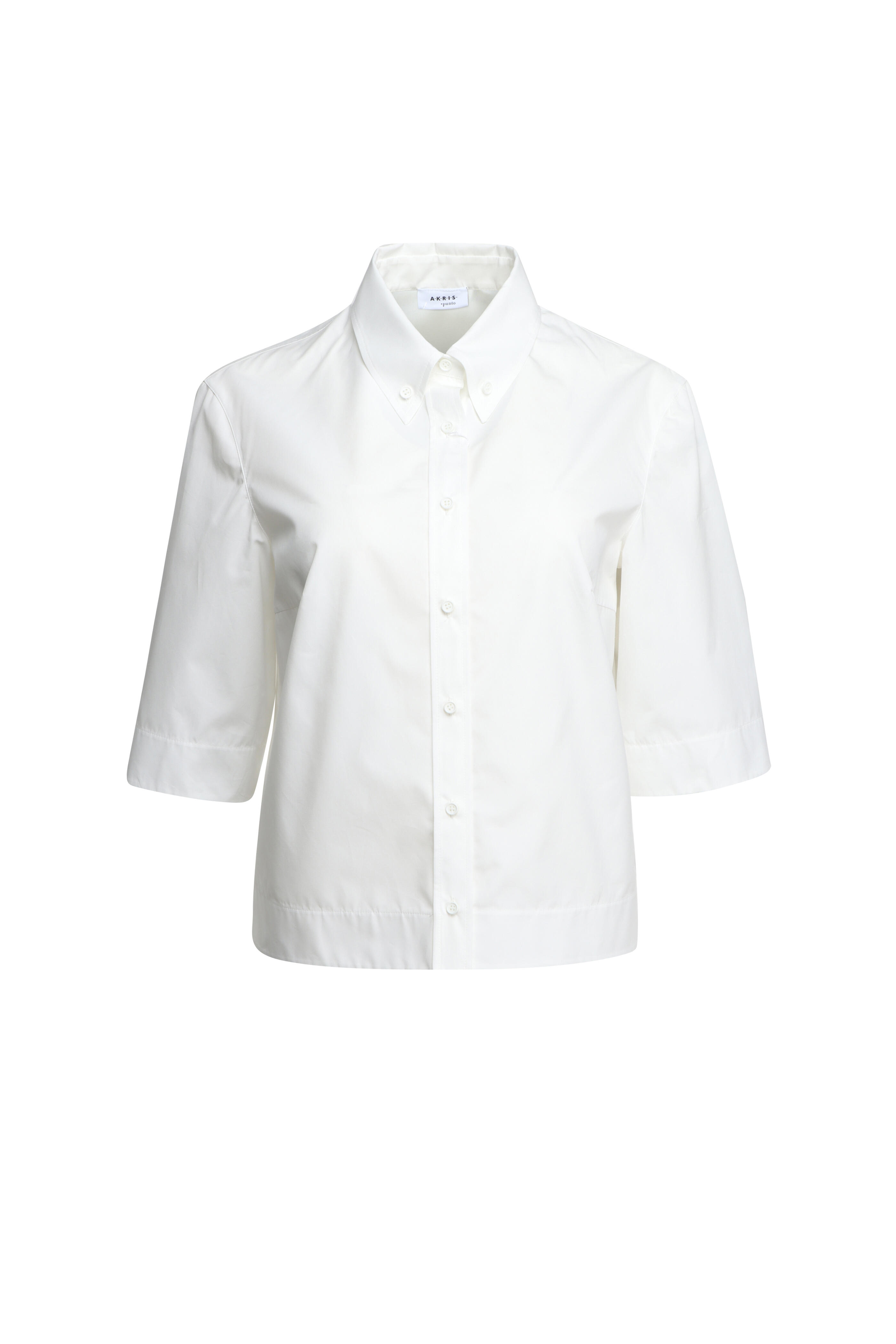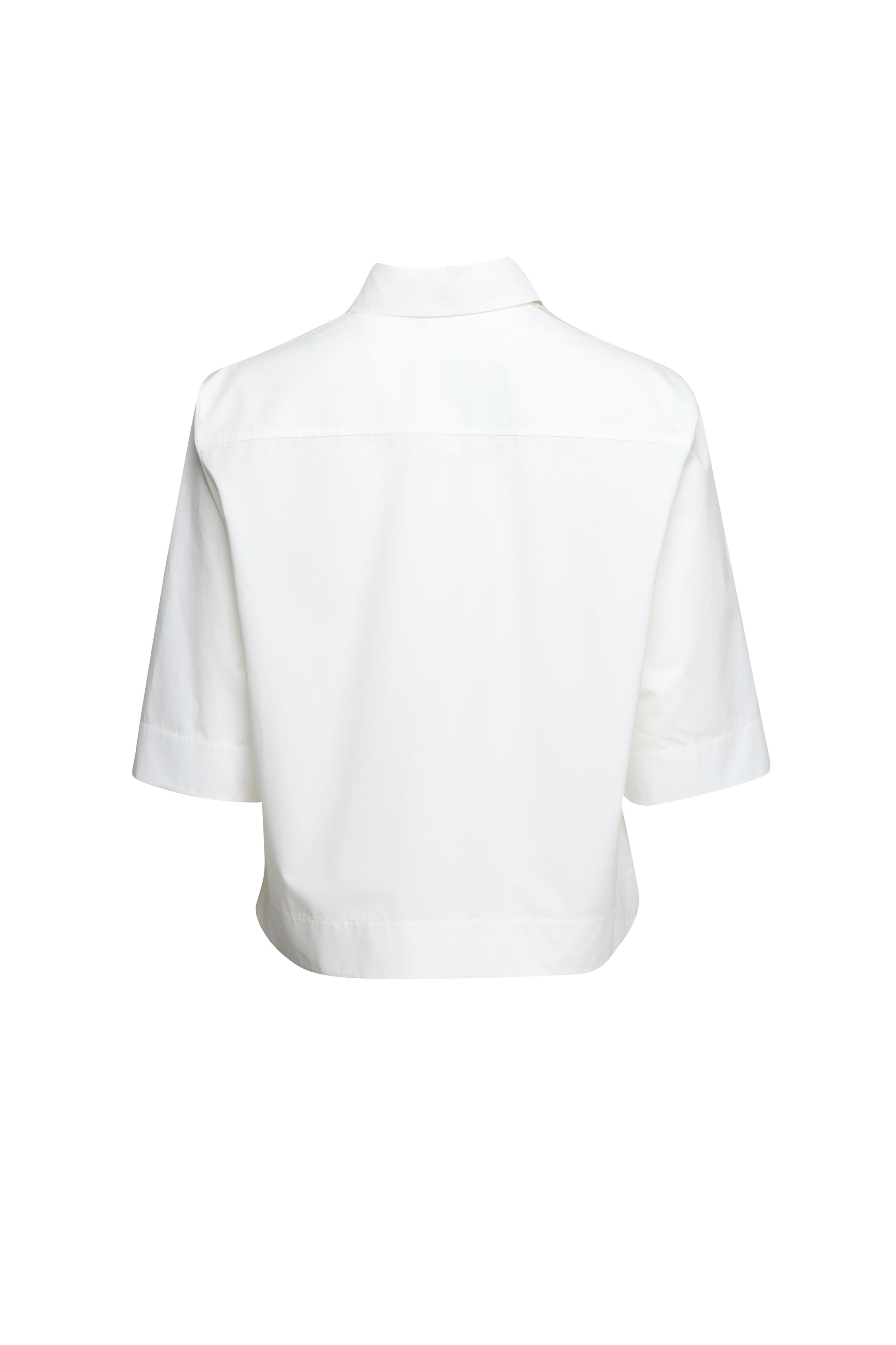 Collar; button stays. Elbow length wide sleeves. Button front closure. Boxy fit. Cropped length. Imported. 100% cotton. Dry clean.