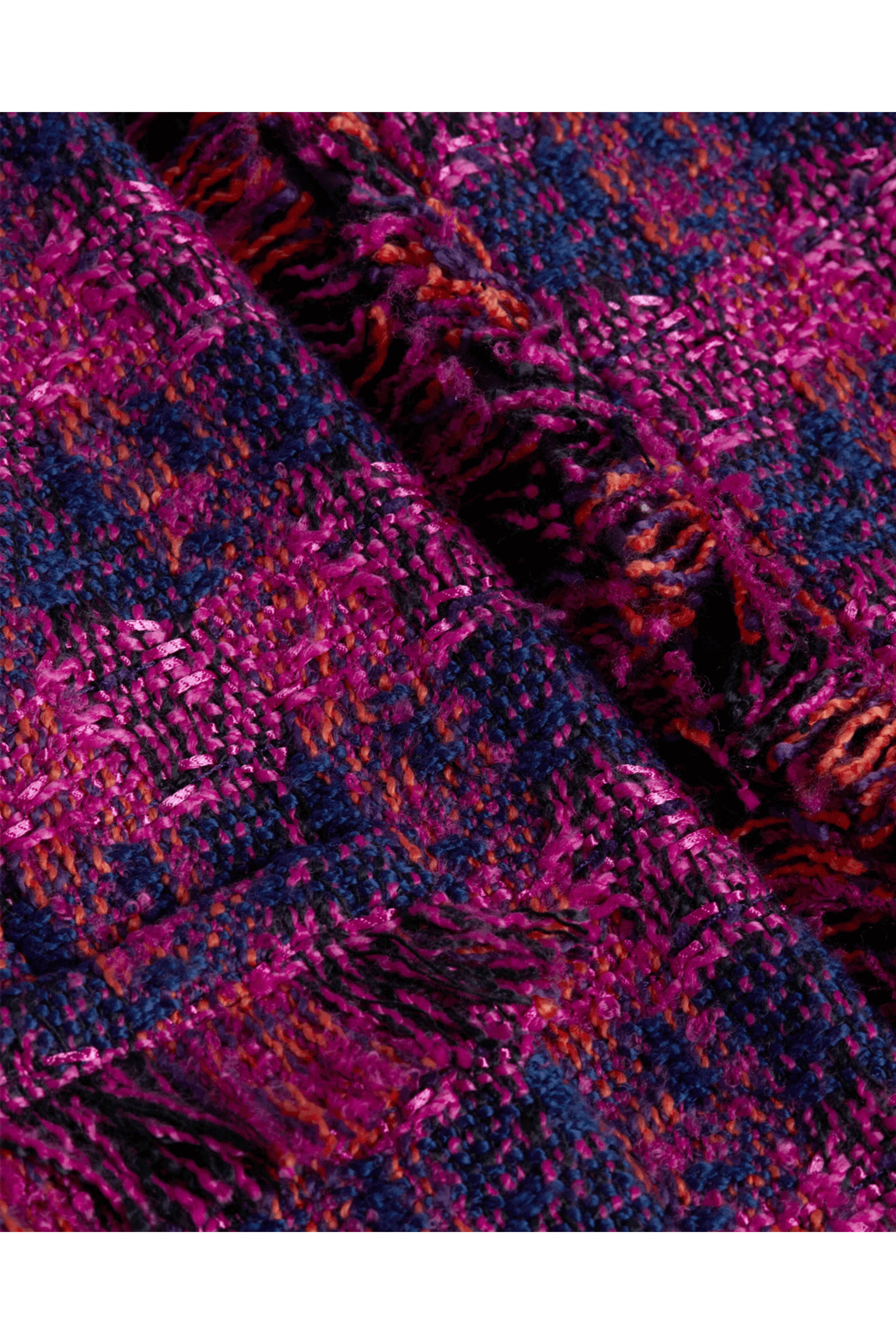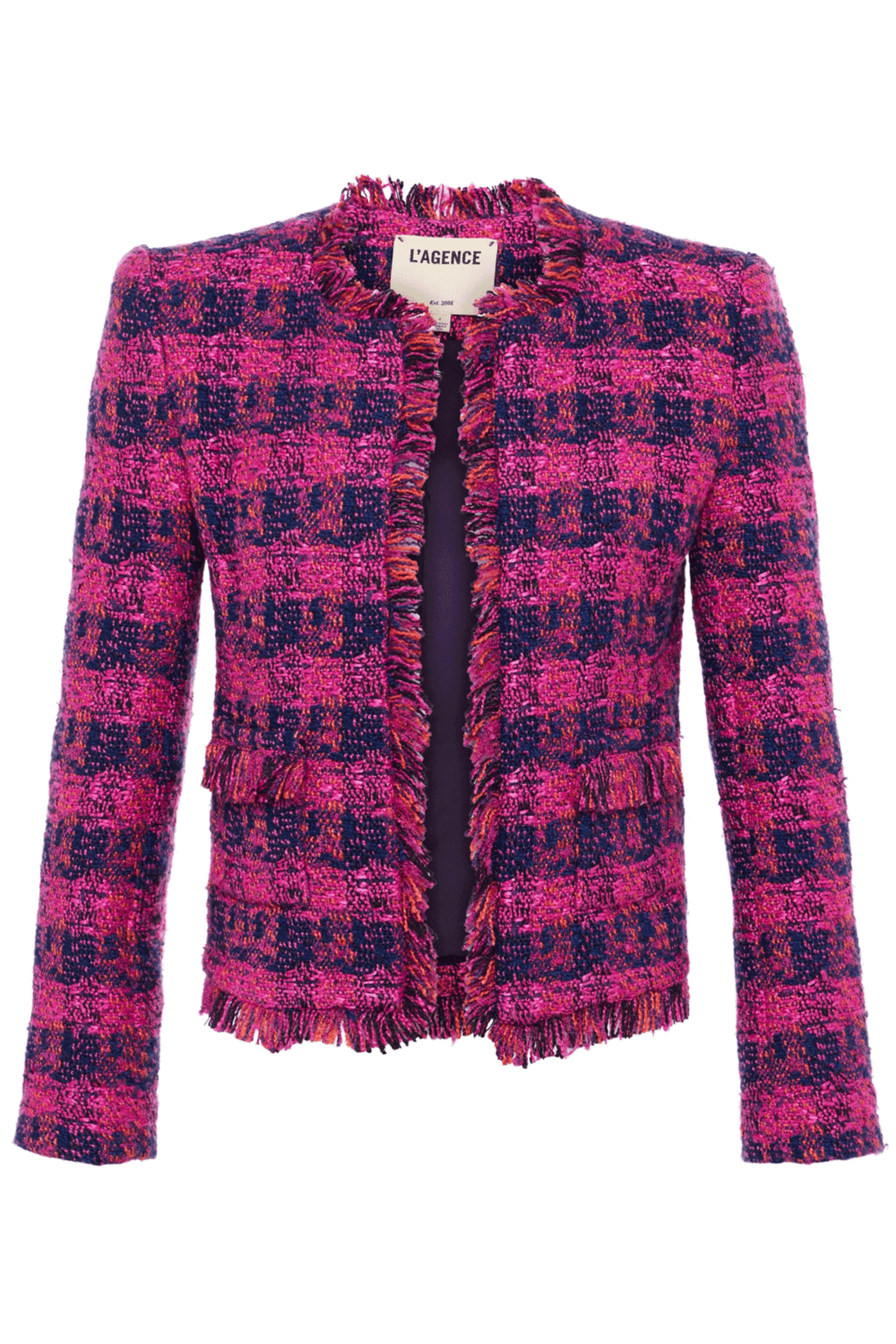 L'Agence Midnight Acai Ruby Tweed Angelina Blazer . Round neckline . Open-front style . Two square button cuffs . Lower patch pockets . Fringe trim . Wool-infused textured tweed . Fully lined . Imported . 80% polyester, 20% wool . Dry clean .