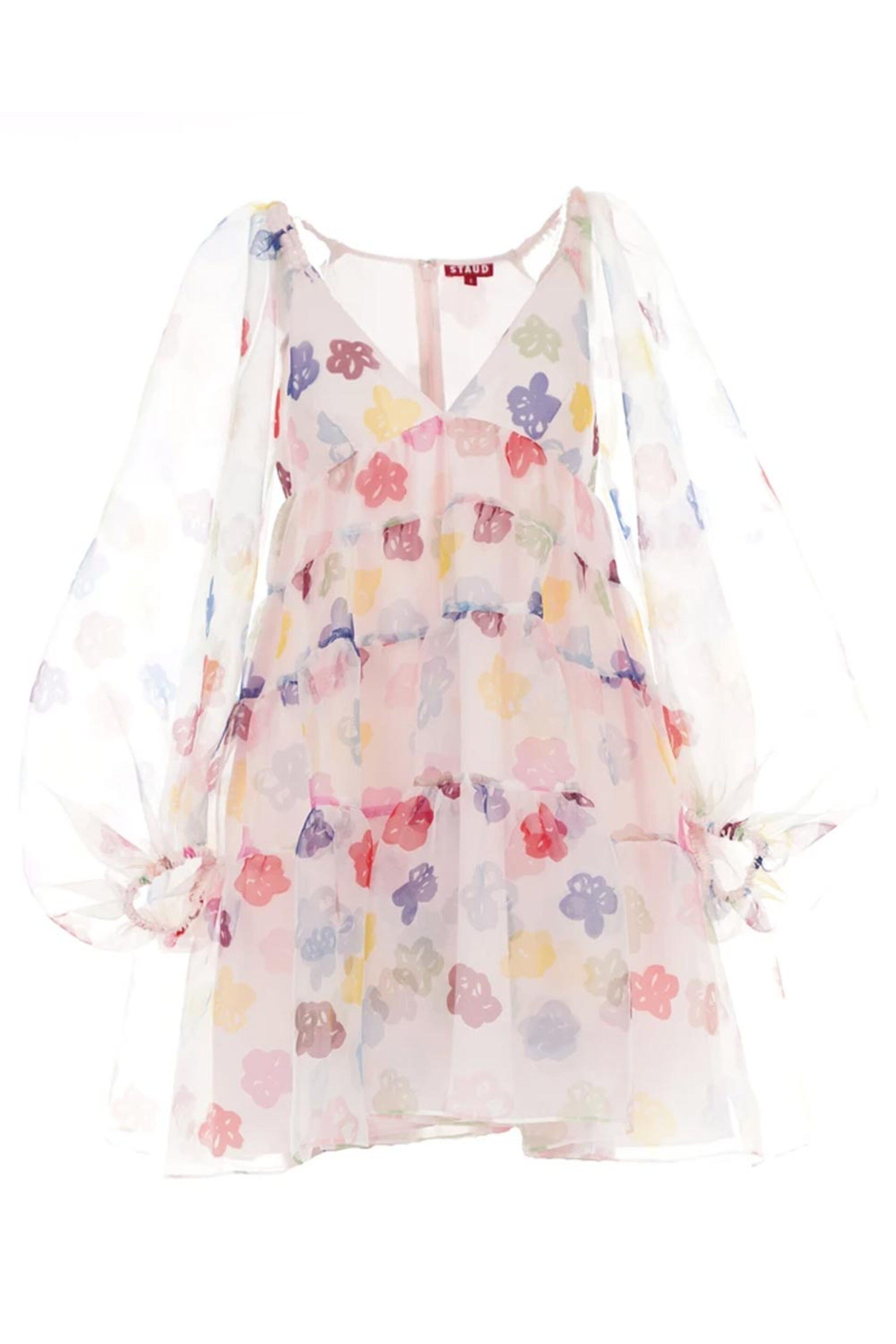 - Staud Rainbow Meadow Mini Dress V neck Long sheer puff sleeves; elastic shoulders and cuffs Hidden back zip closure Side slip pockets Mini length Lined 100% polyester outer and lining
