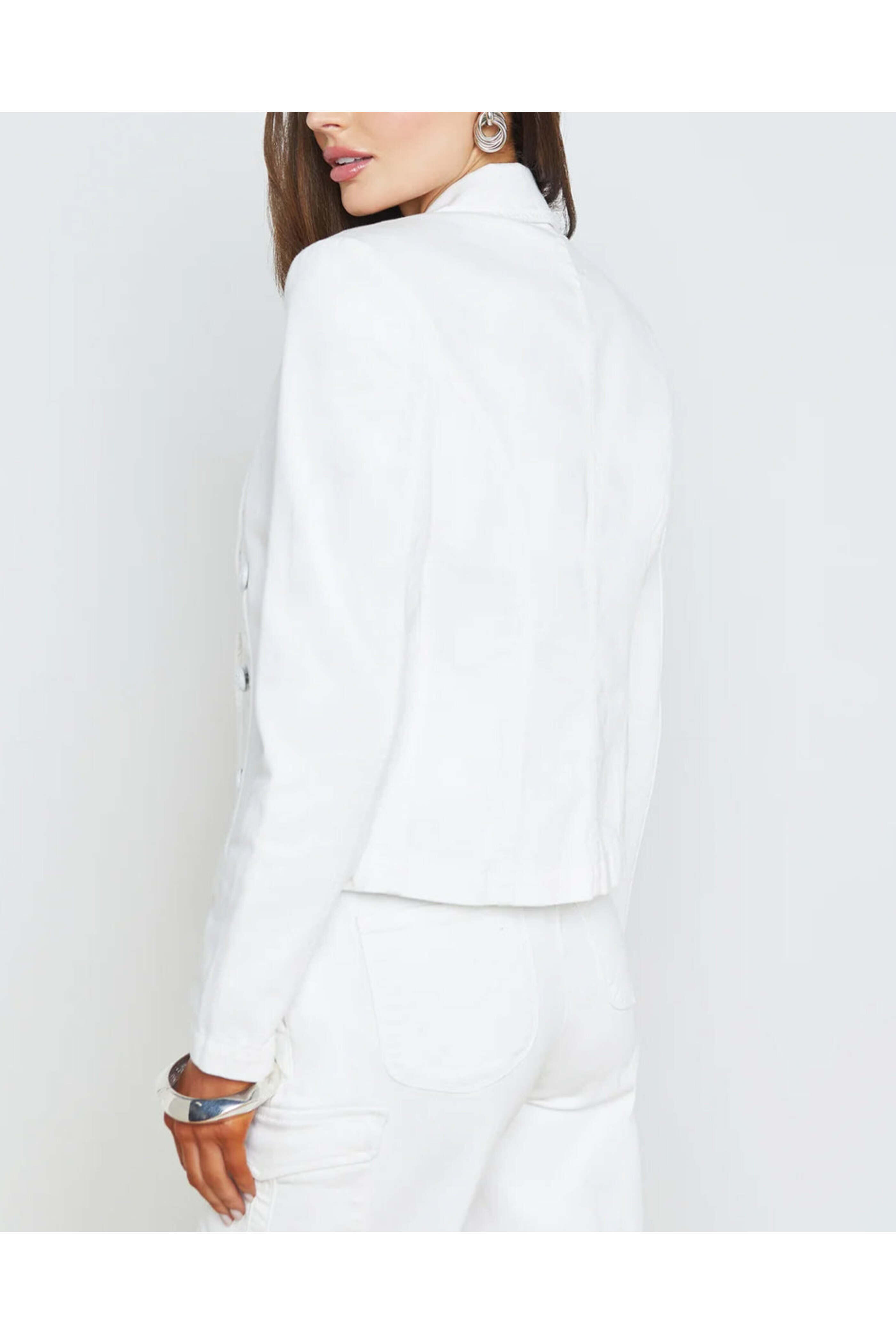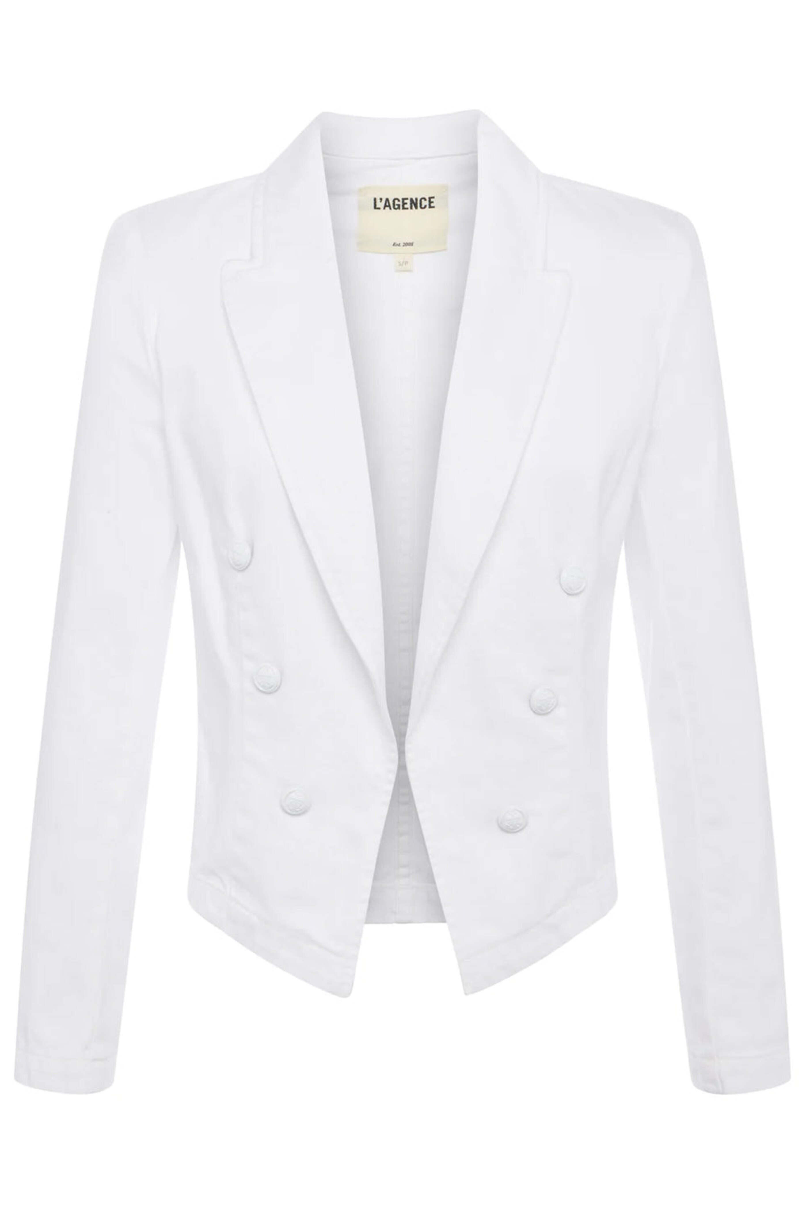 LAgence Blanc Wayne Denim Crop Jacket. Peak lapel. Structured shoulders. Long sleeves. Double breasted front button detail. Slim fit. Denim fabrication. 100% cotton.