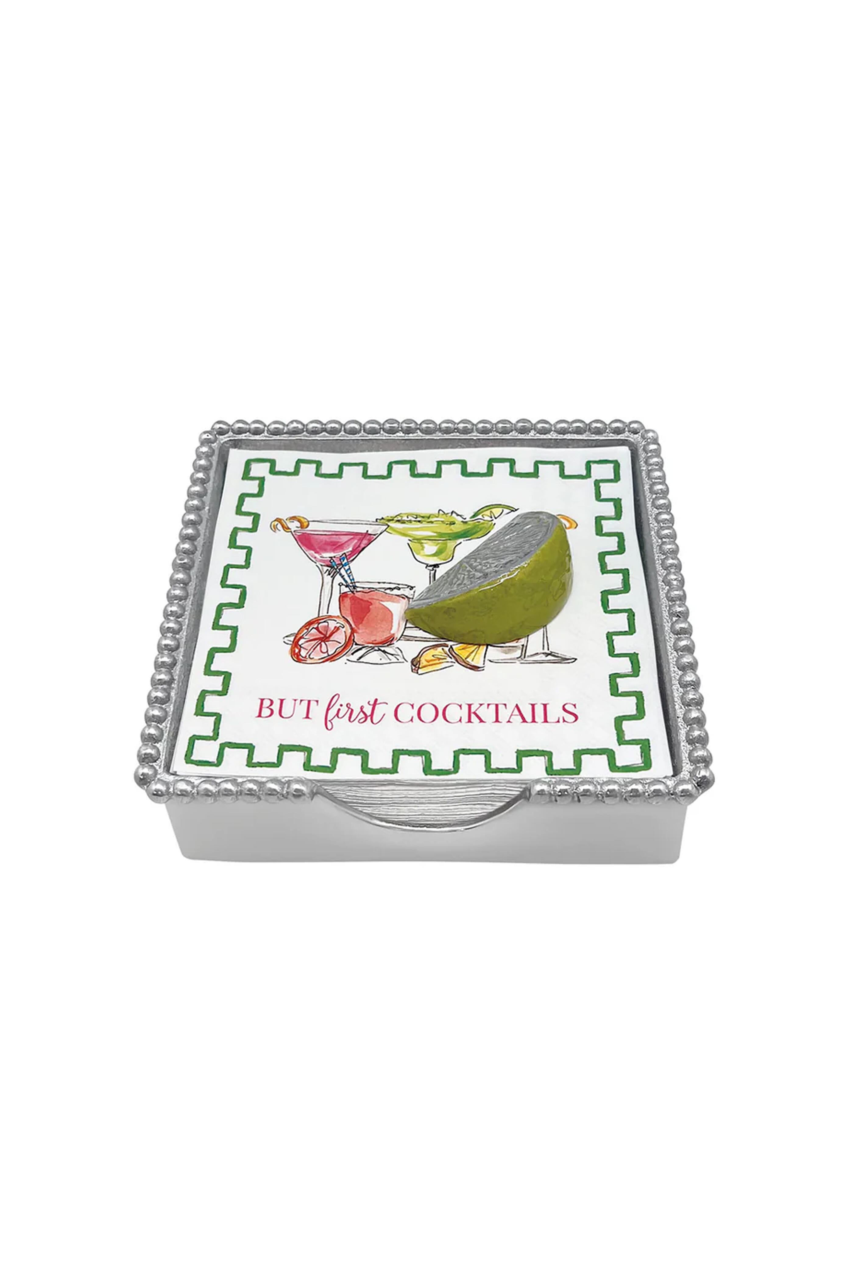 Napkin box. Lime wedge napkin weight. Beaded detailing. Imported. 5.75" L x 5.75" W x 1.5"H. Handcrafted and made from 100% recycled aluminum.