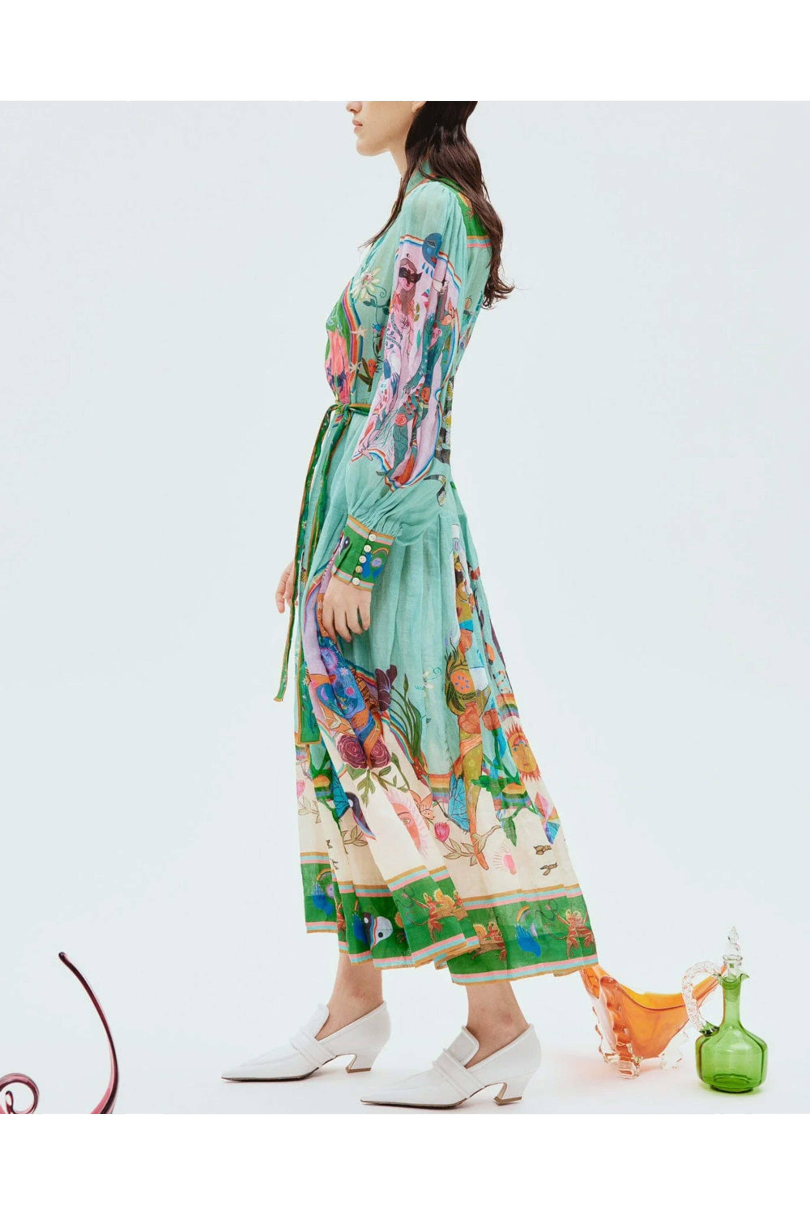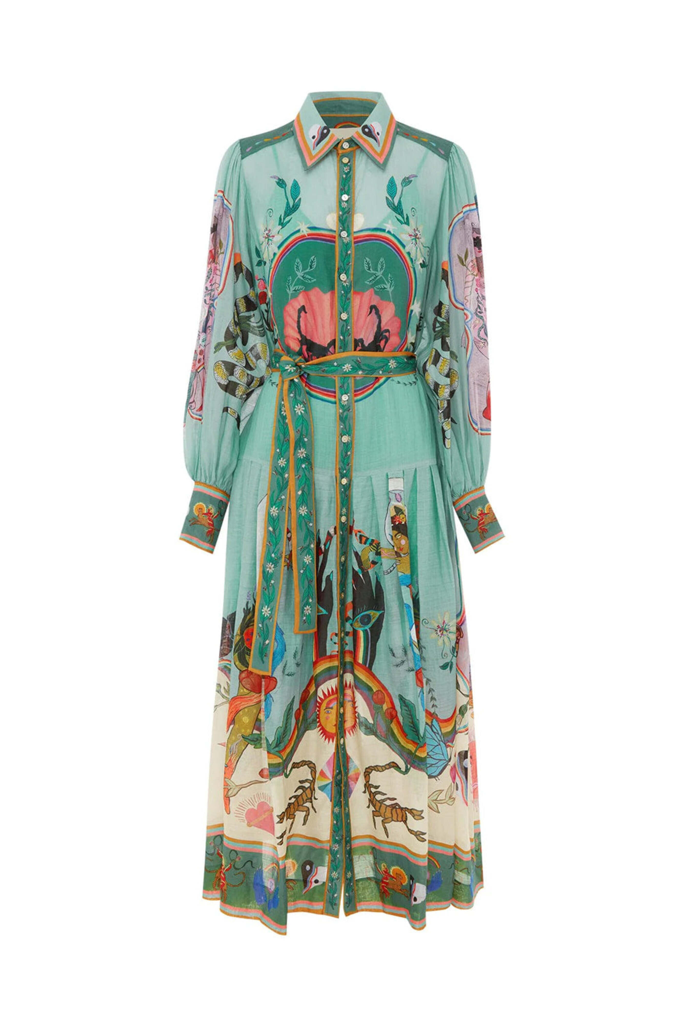 Alémais Multicolor Evergreen Shirt Dress. Collar. Long blouson sleeves; button cuffs. Button down front closure. Removable self-tie belt at waist; self-fabrication. Relaxed fit. Flare skirt. Midi length. Lined/ slip included. 100% ramie outer, 100% cotton lining/ slip.