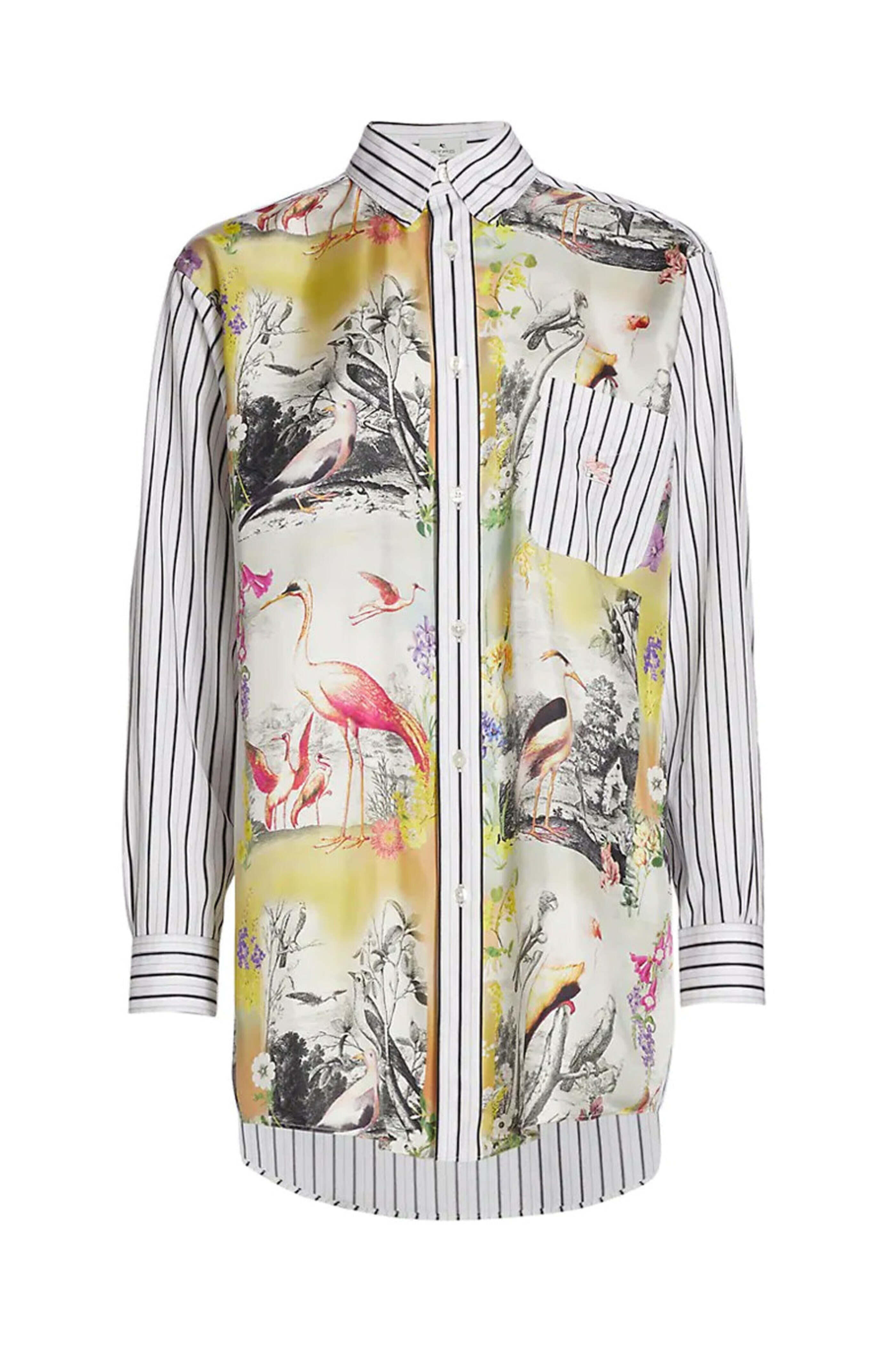 Etro Tucano Pinstripe Silk and Cotton Shirt. Point collar. Long sleeves; button cuffs. Button down front closure. Single chest pocket. Boyfriend fit. Contrast fabric panels. High low hem. Unlined. Made in Italy. 100% silk front, 100% cotton back, sleeves, and pocket.