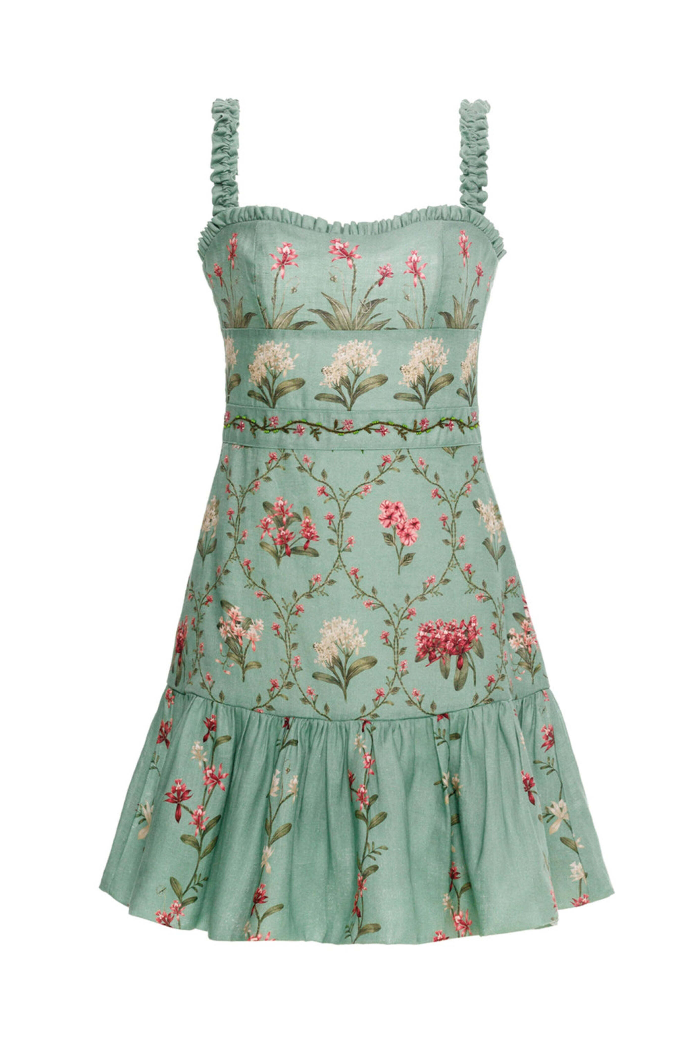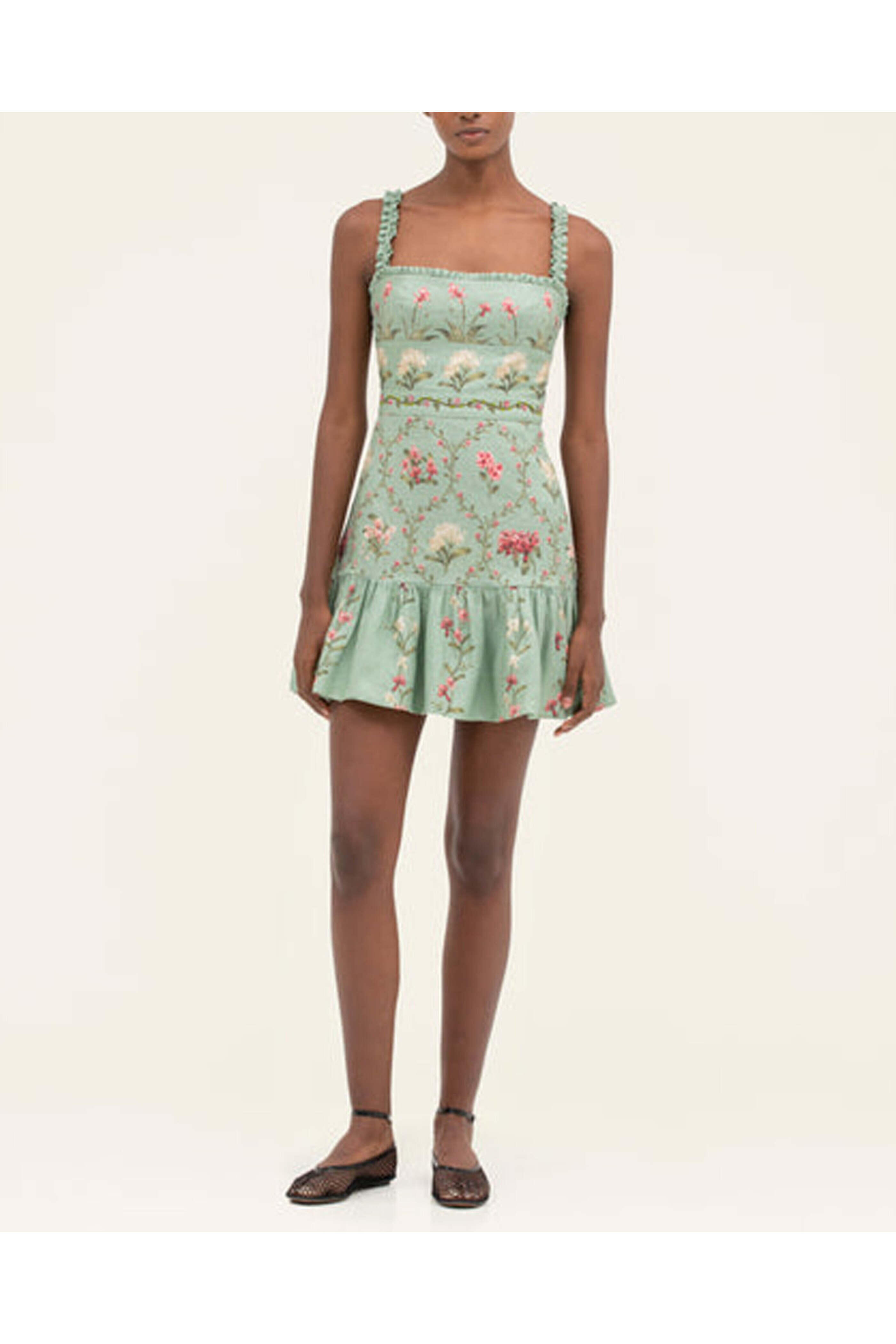 Agua By Agua Bendita Seafoam Floral Nieve Orquidea Mini Dress. Square neck. Square back. Sleeveles. Concealed back zip closure. Banded waist. Tiered aline skirt. Mini length. Lined. 100% linen.