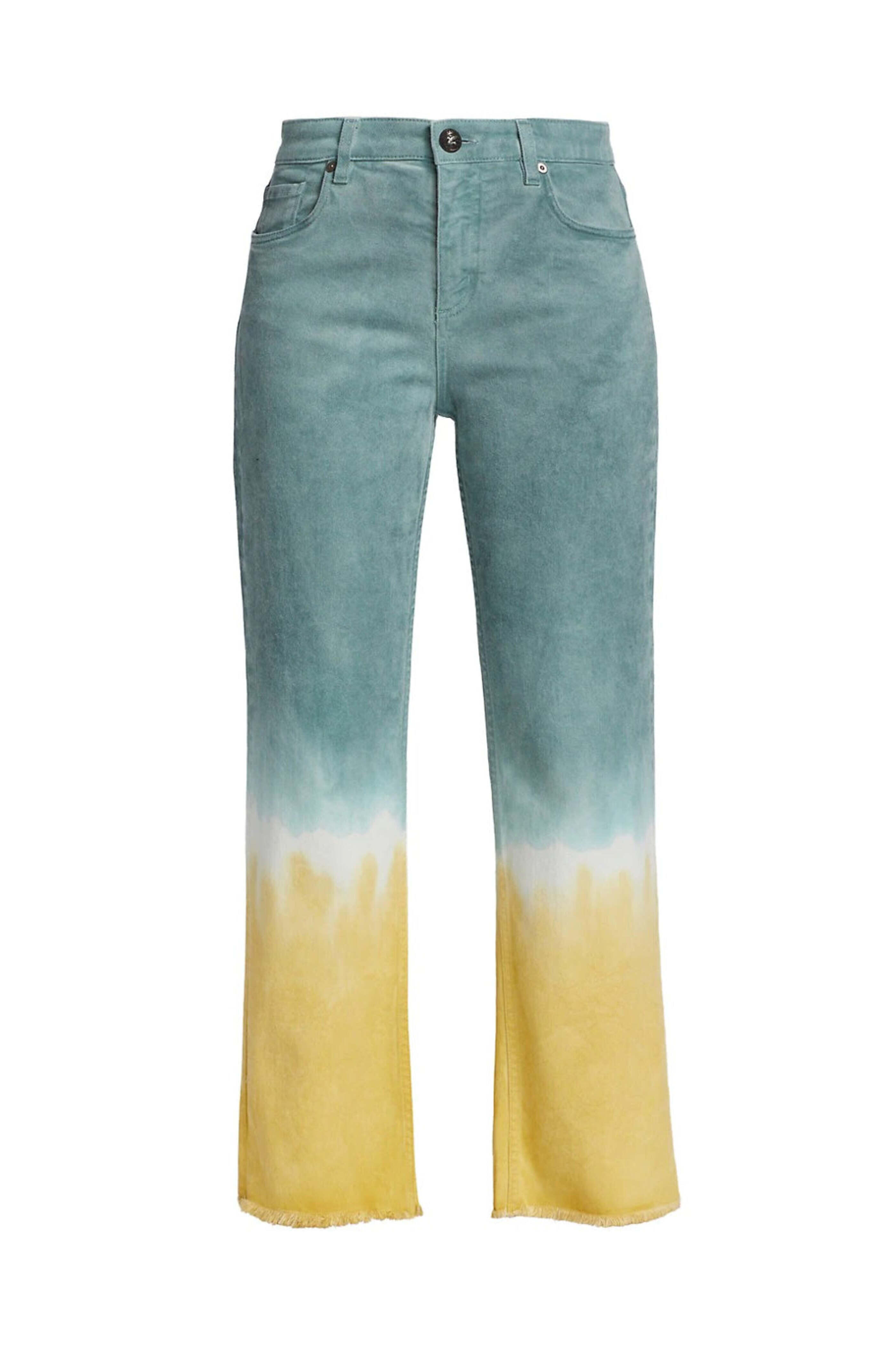 Etro Teal Dip Dye Straight Jean. Button closure. Zip fly. Belt loops. Five pocket style. Straight silhouette. Dip dye fabrication. Raw hem. Ankle length. Unlined. 98% cotton, 2% elastane.