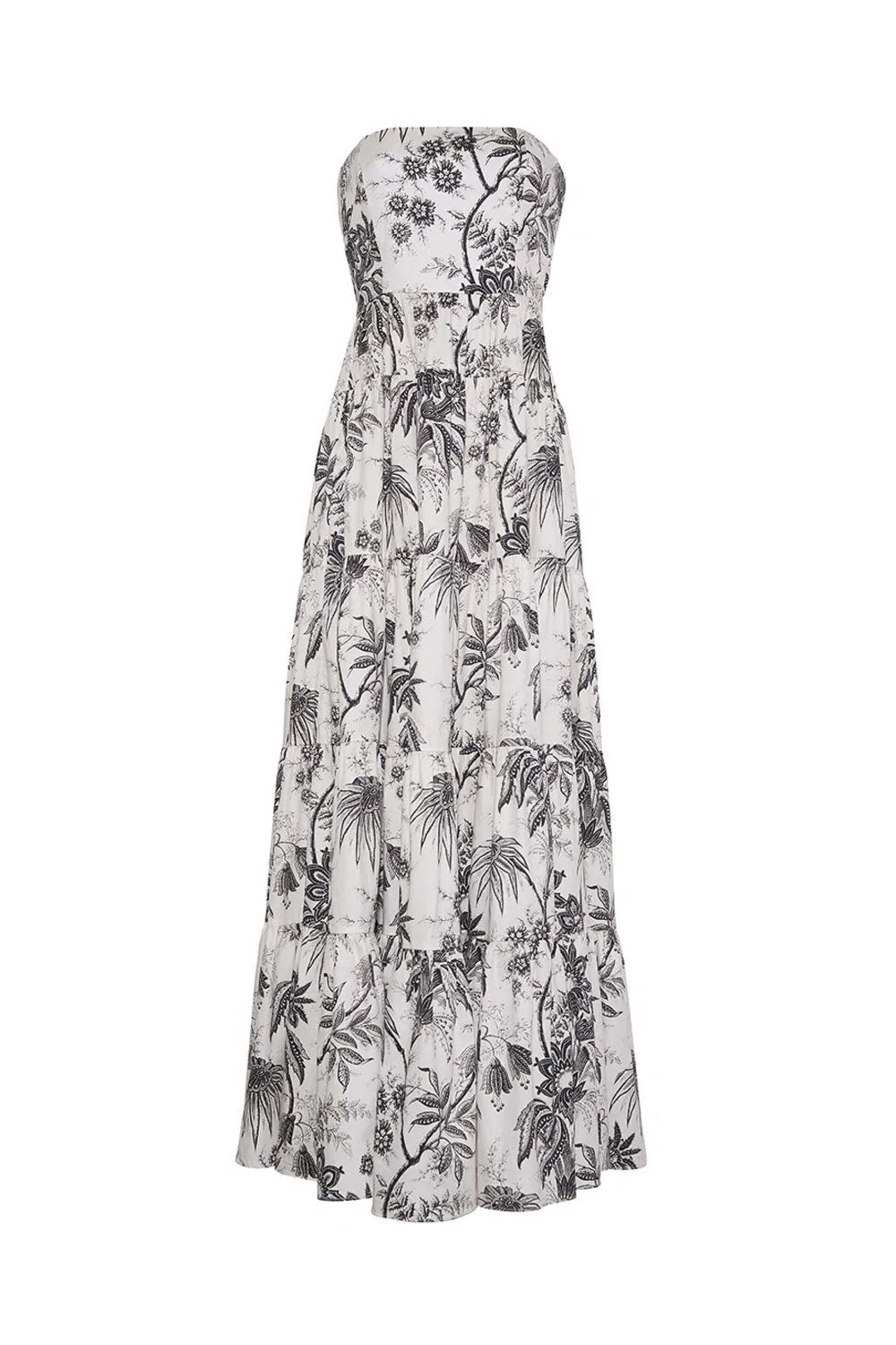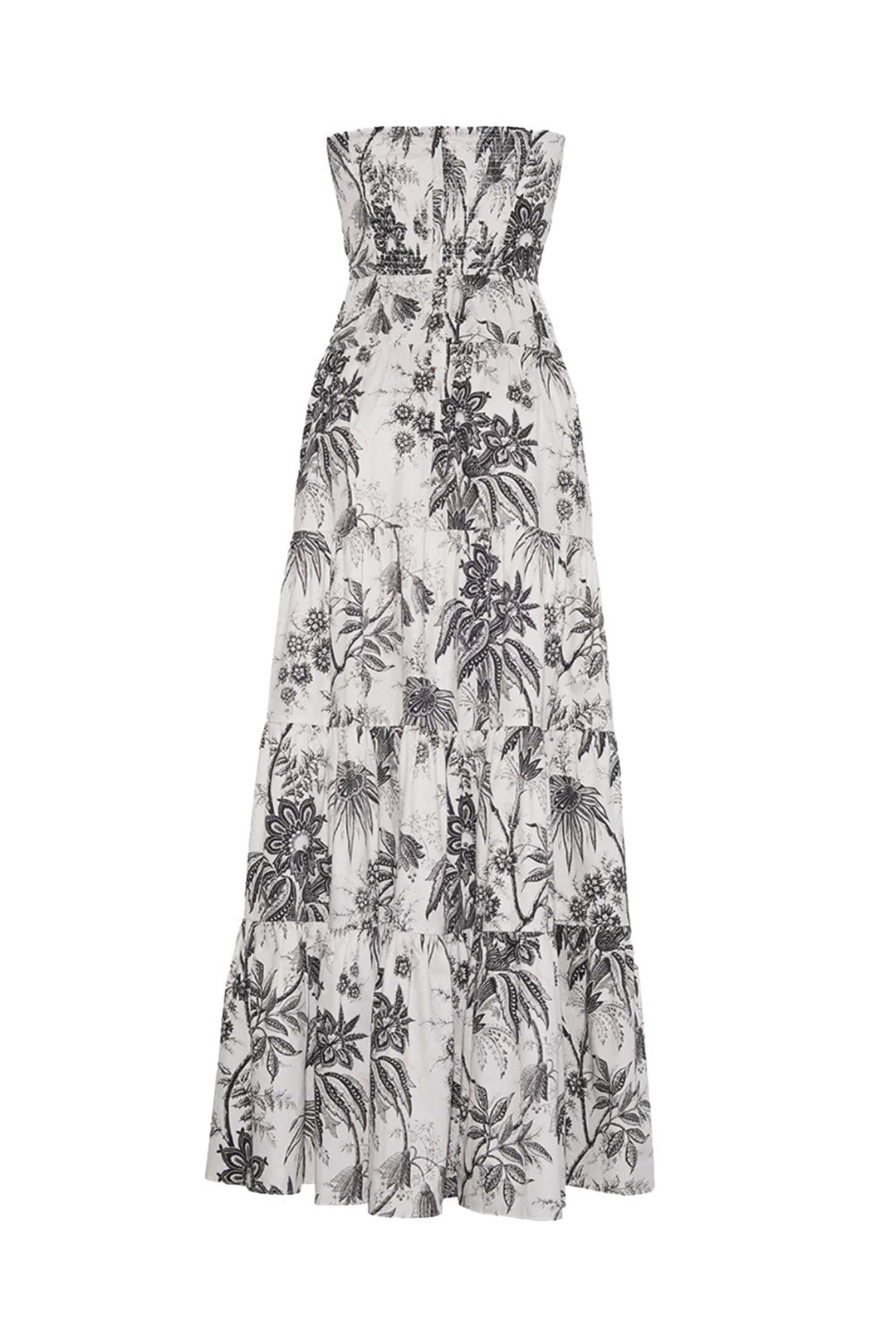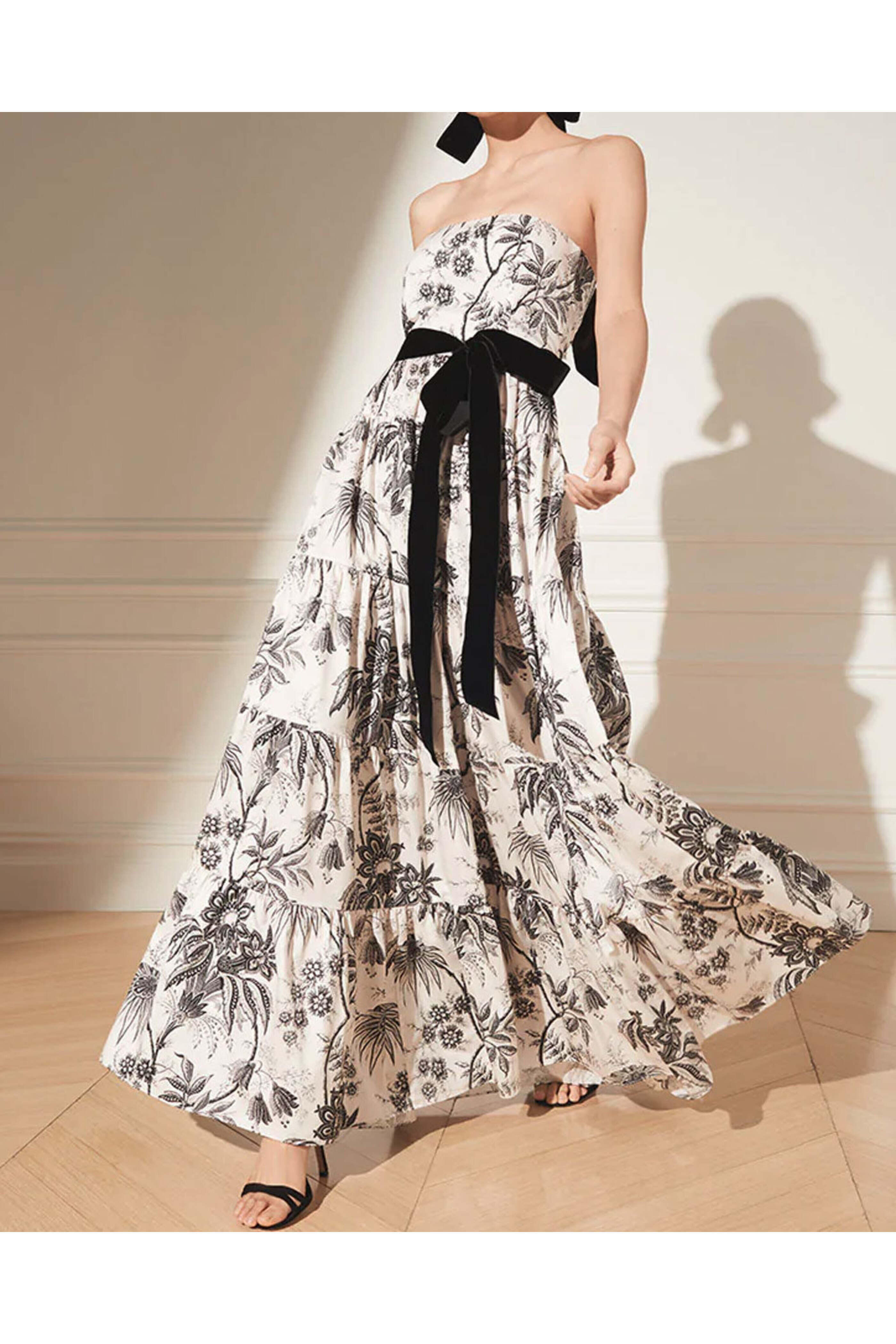 Cara Cara Jacobean Toile Black Roxanne Dress. Sweetheart neck. Strapless. Concealed zipper closure. Fitted bodice. Detachable self tie sash. Floor length; tiered skirt. Fit and flare silhouette. Slim fit. 97% Cotton, 3% Spandex.