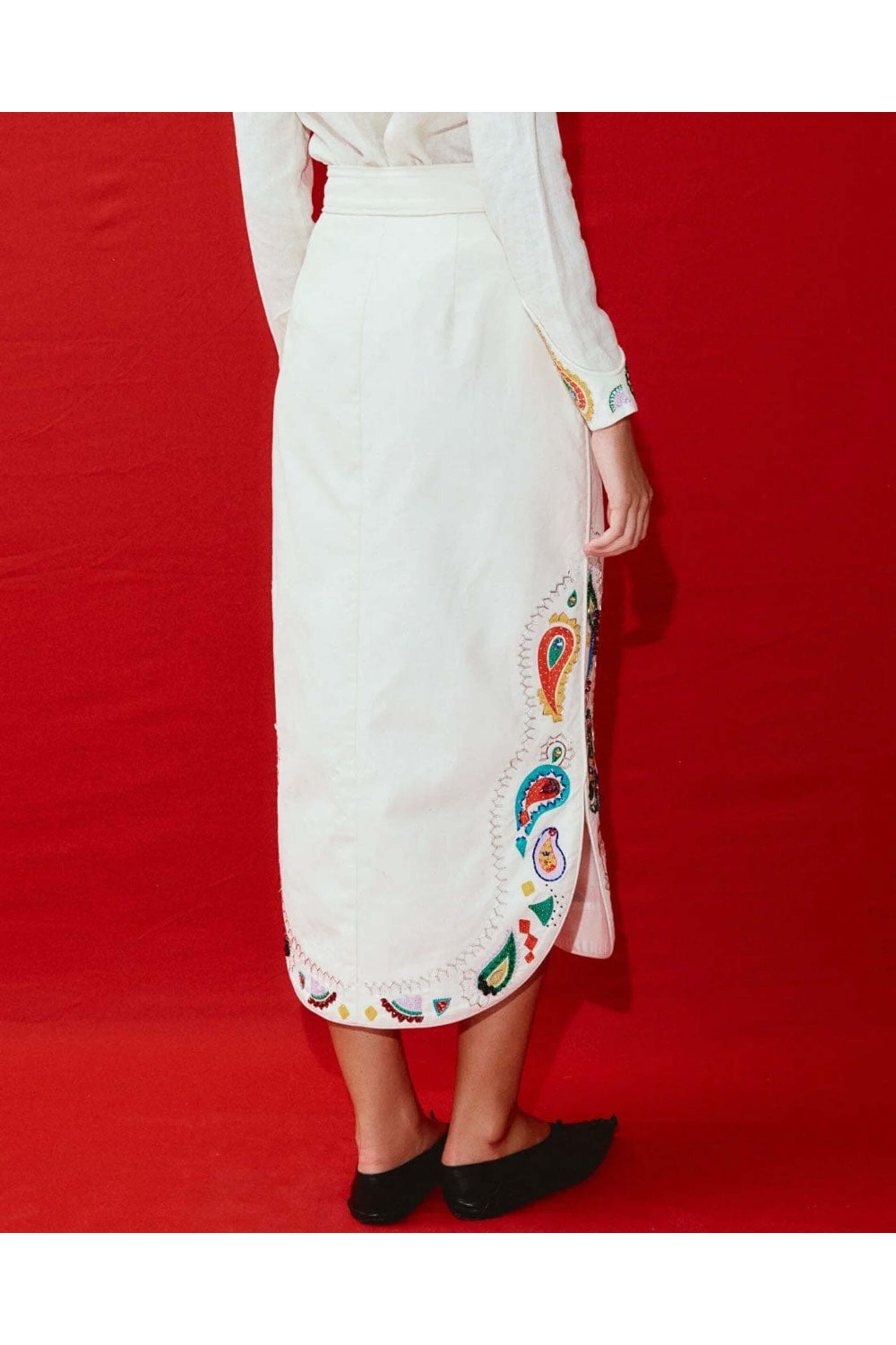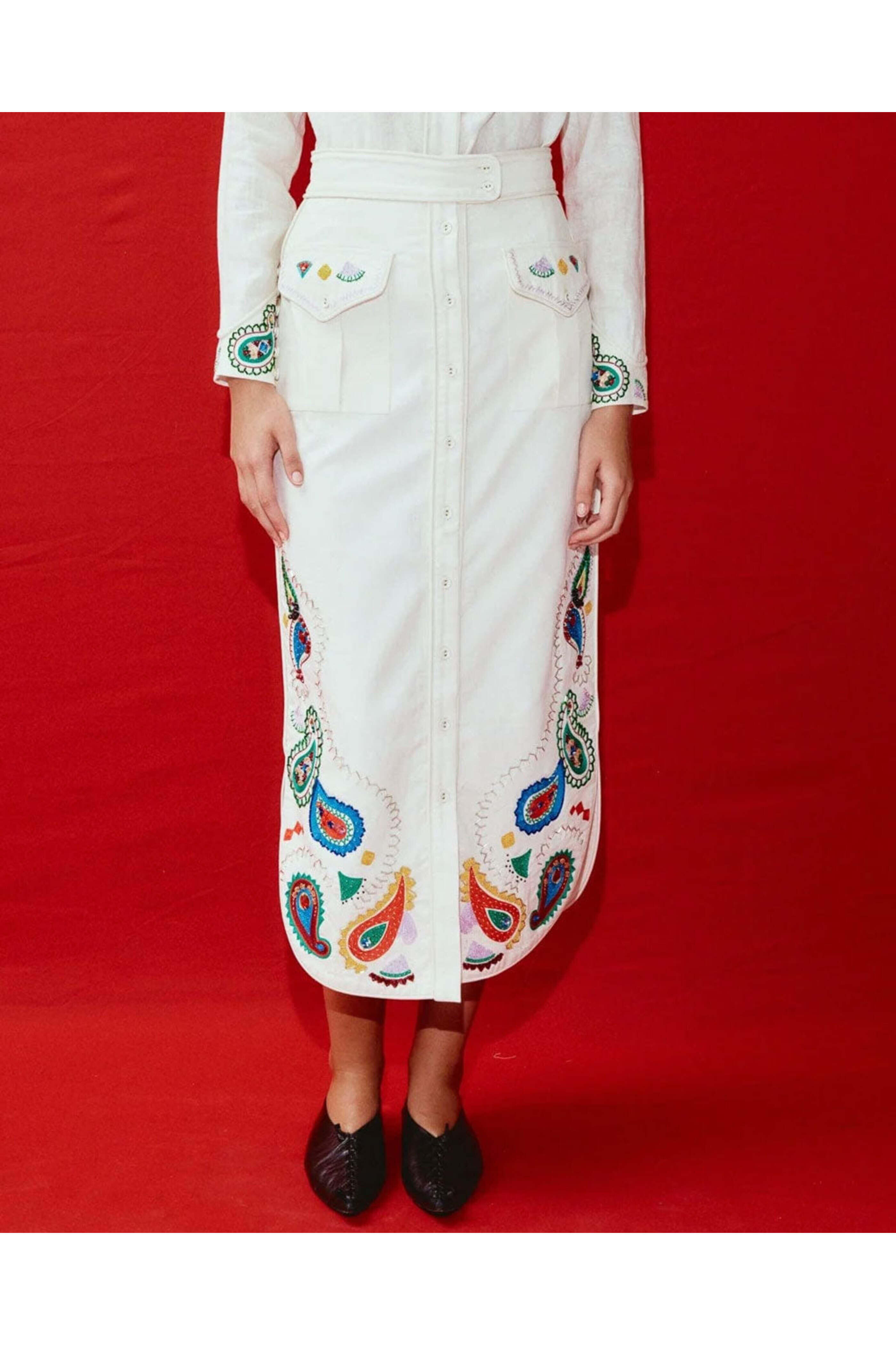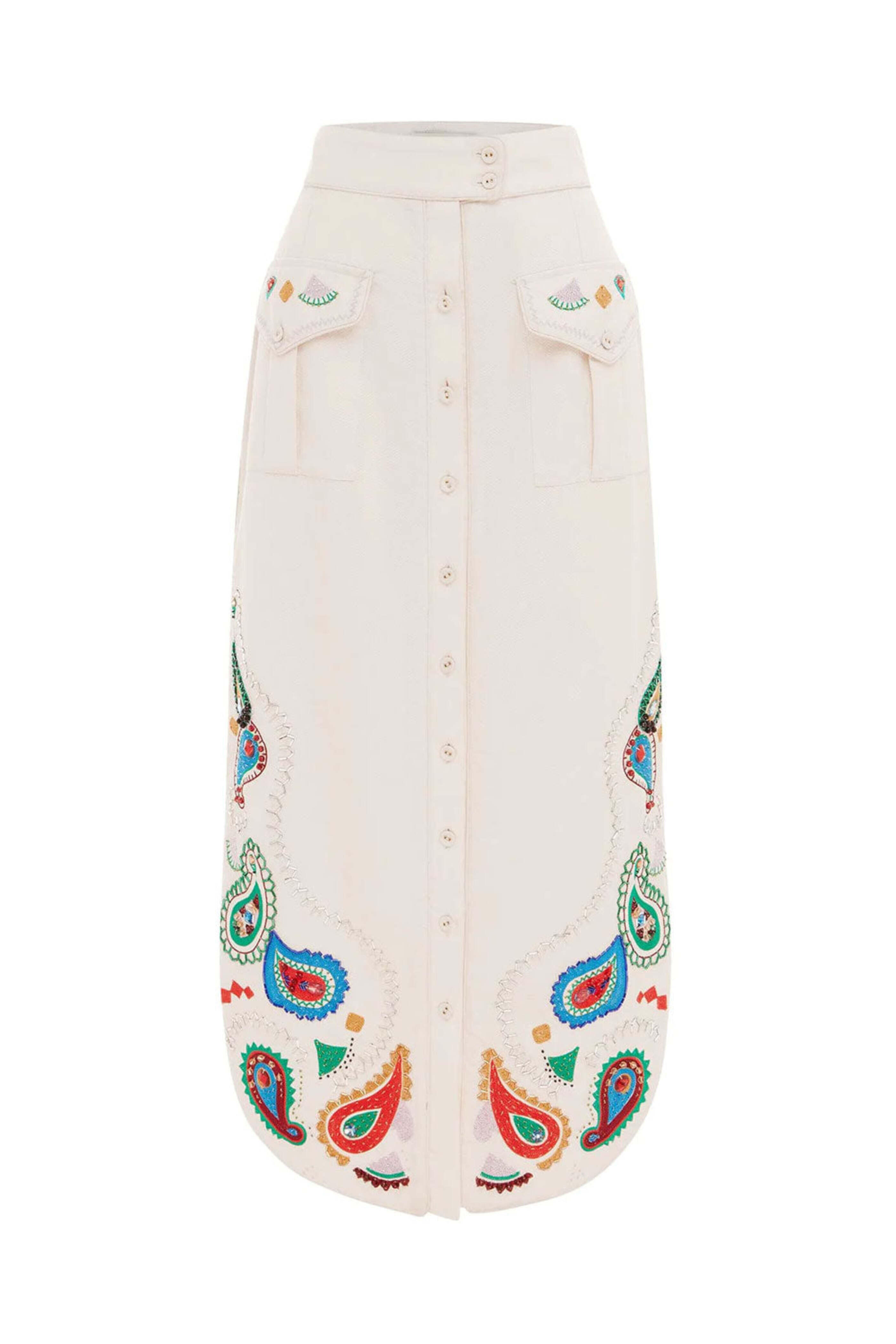 Alémais Ivory Embroidered Peggy Skirt. High rise. Button front closure. Zip fly. Front pockets. Midi length. Curved hem. Embroidery and bead detail on pockets and hem. 100% organic cotton.