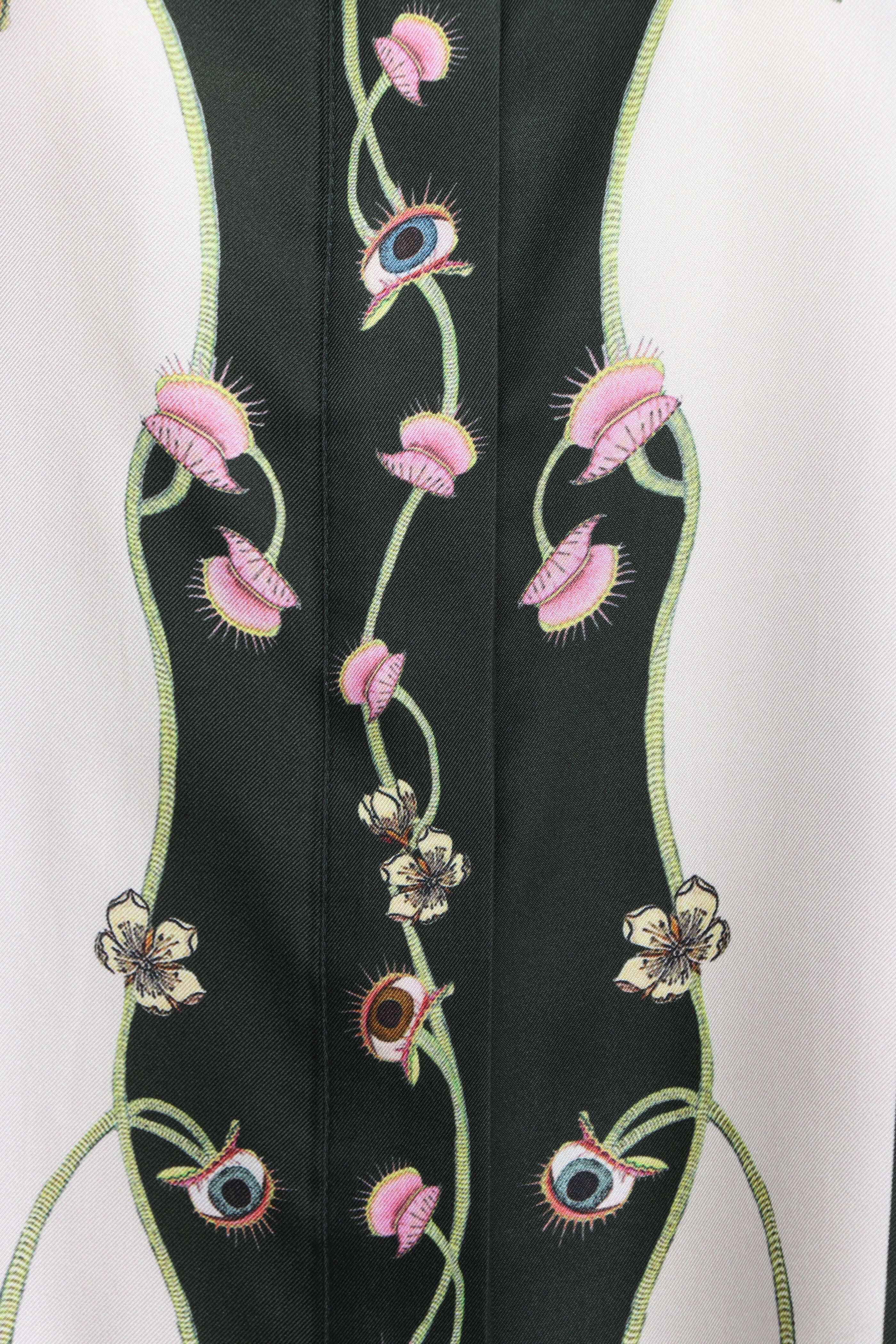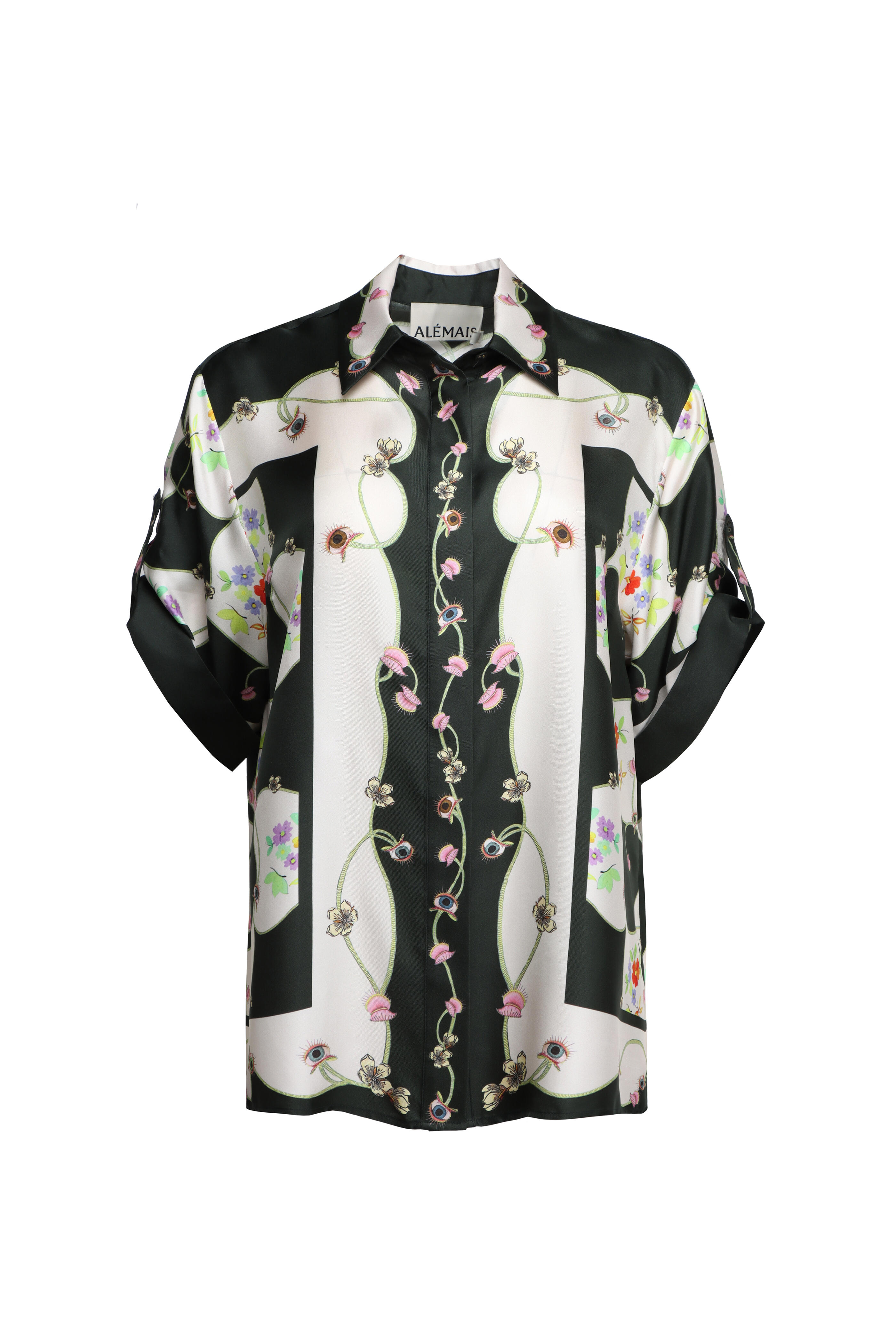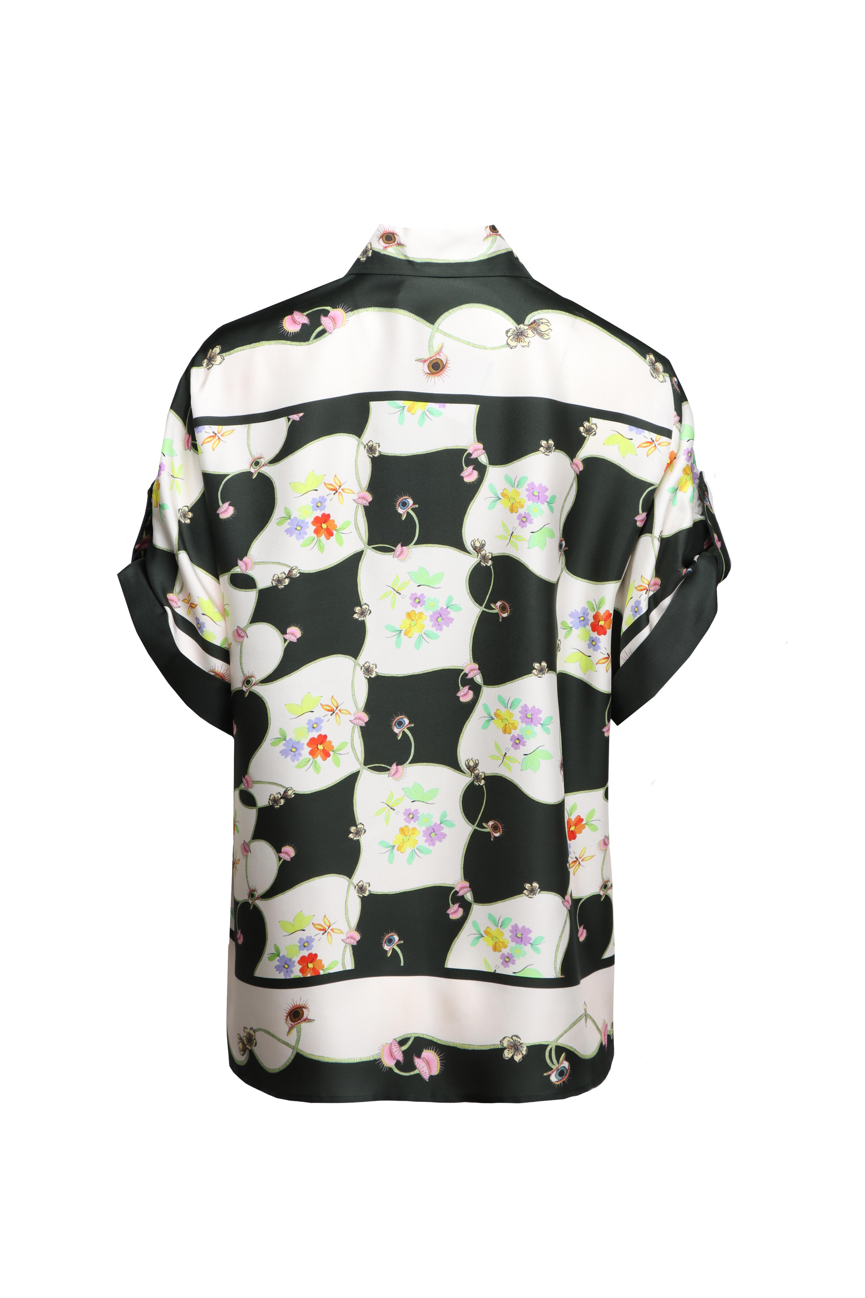 Collar. Drop shoulders. Short sleeves; folded cuffs with roll tab. Concealed button front closure. Oversized fit. Rounded hem. Imported. 17” sleeve length (US 4). 28” length (US 4). 45.5” bust (US 4). 100% silk. Hand wash.