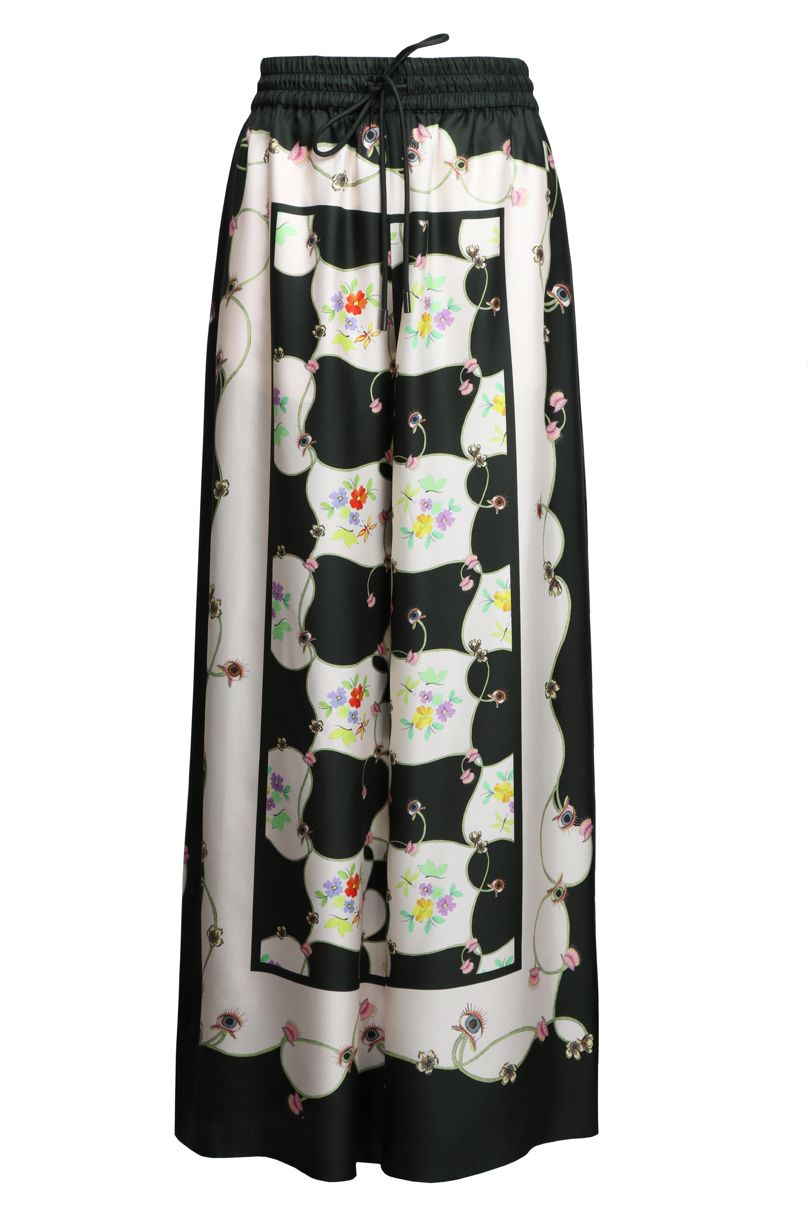 High rise. Elastic drawstring waist. Wide through leg. Imported. 31” rise (US 4). 42.5” length (US 4). 27” waist (US 4). 100% silk. Hand wash.