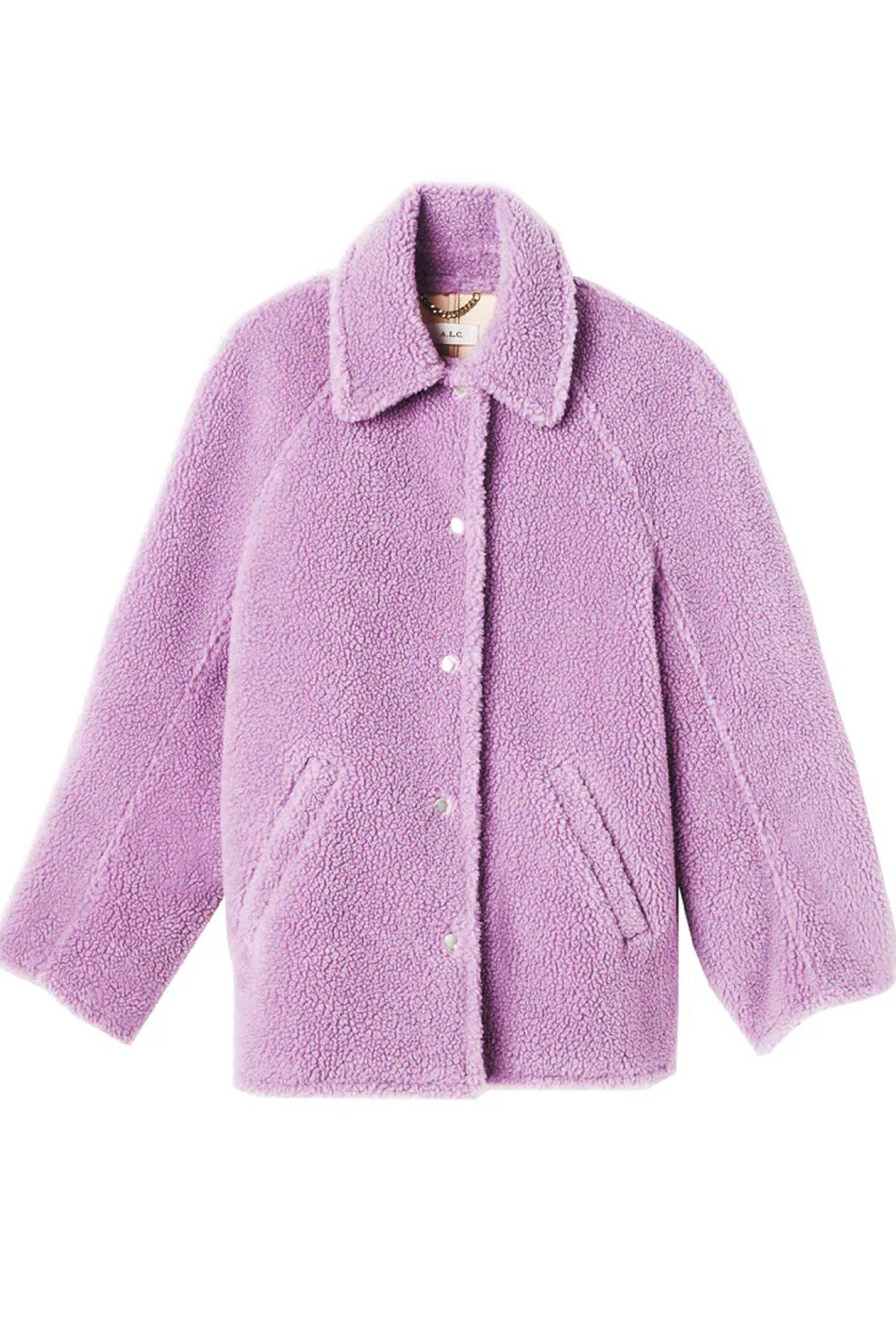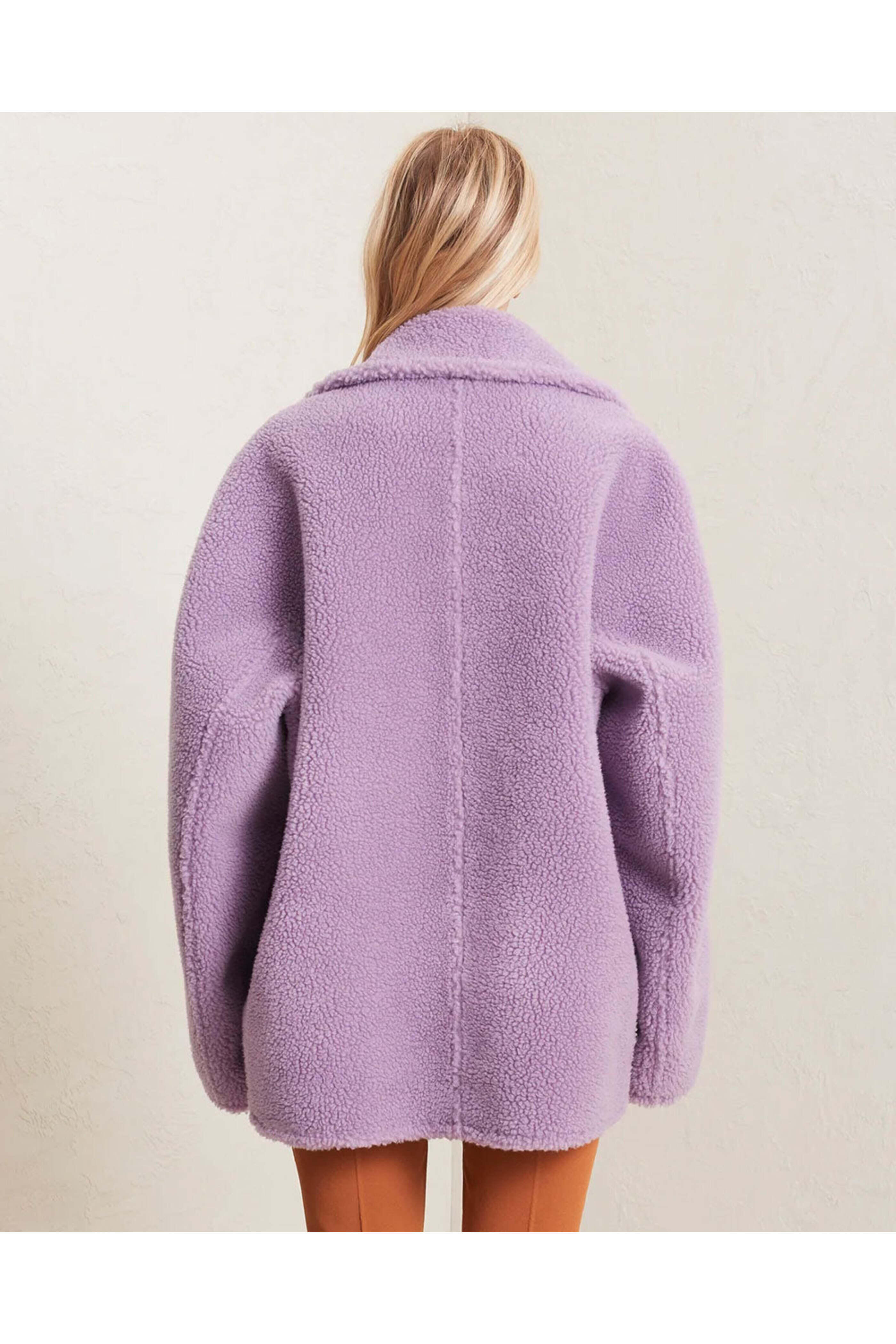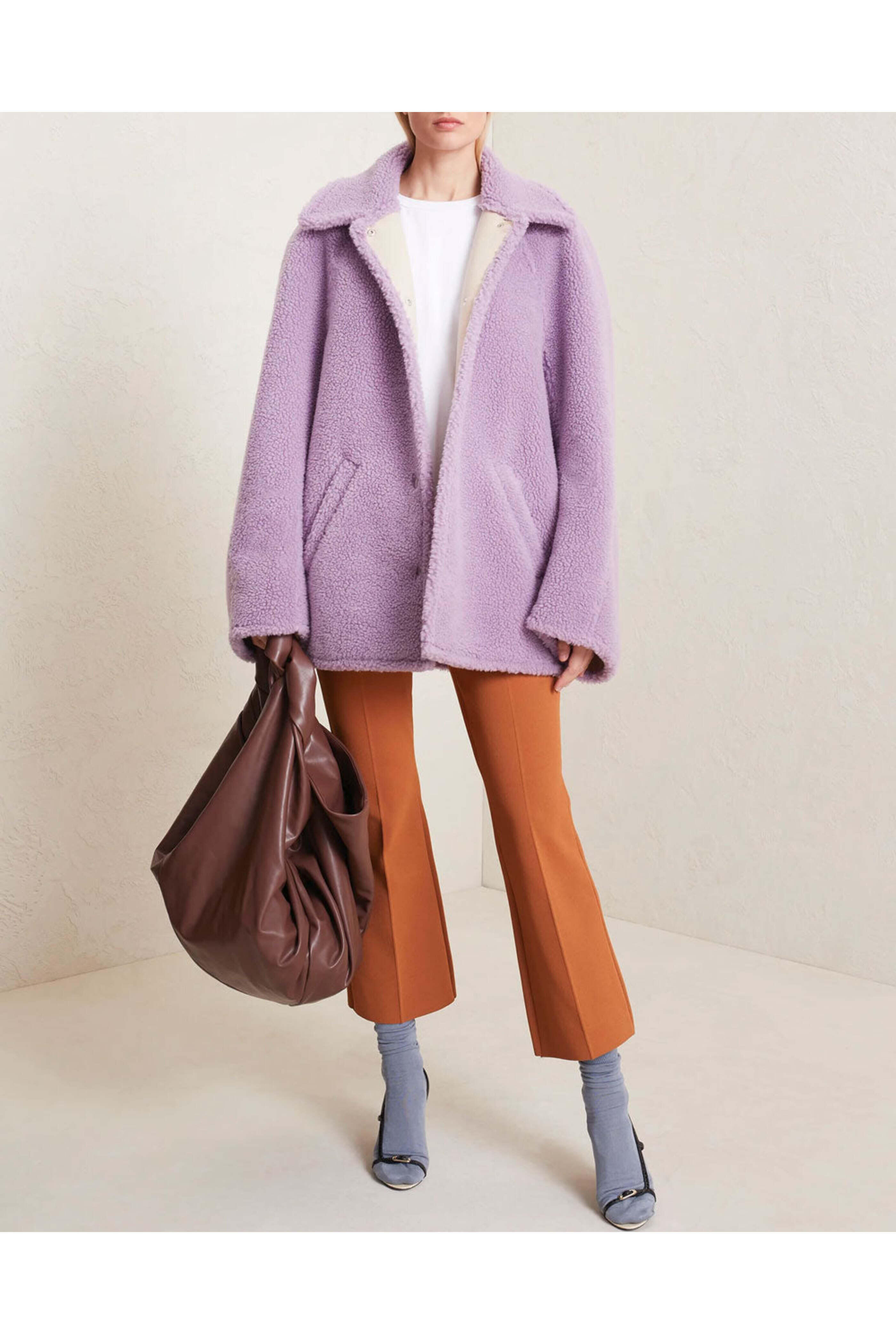 A.L.C. Deep Lilac Lincoln Faux Fur Coat. Point collar. Long raglan sleeves. Snap button up closure. Front welt pockets. Boxy silhouette. Oversized fit. 77% Polyester, 22% Wool.