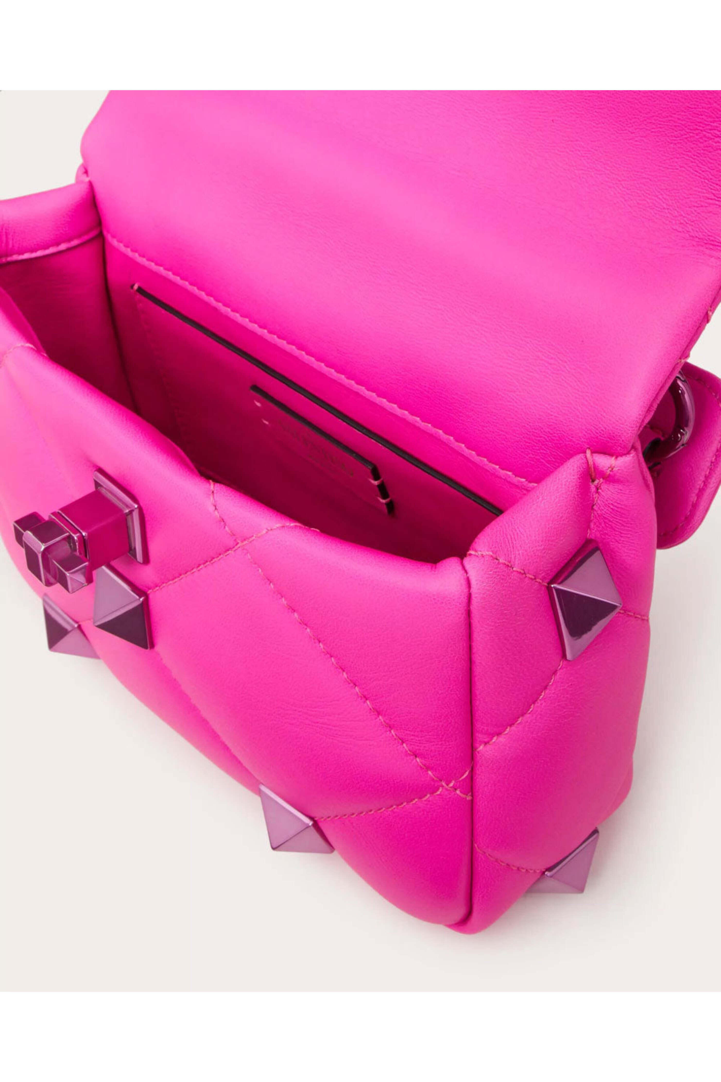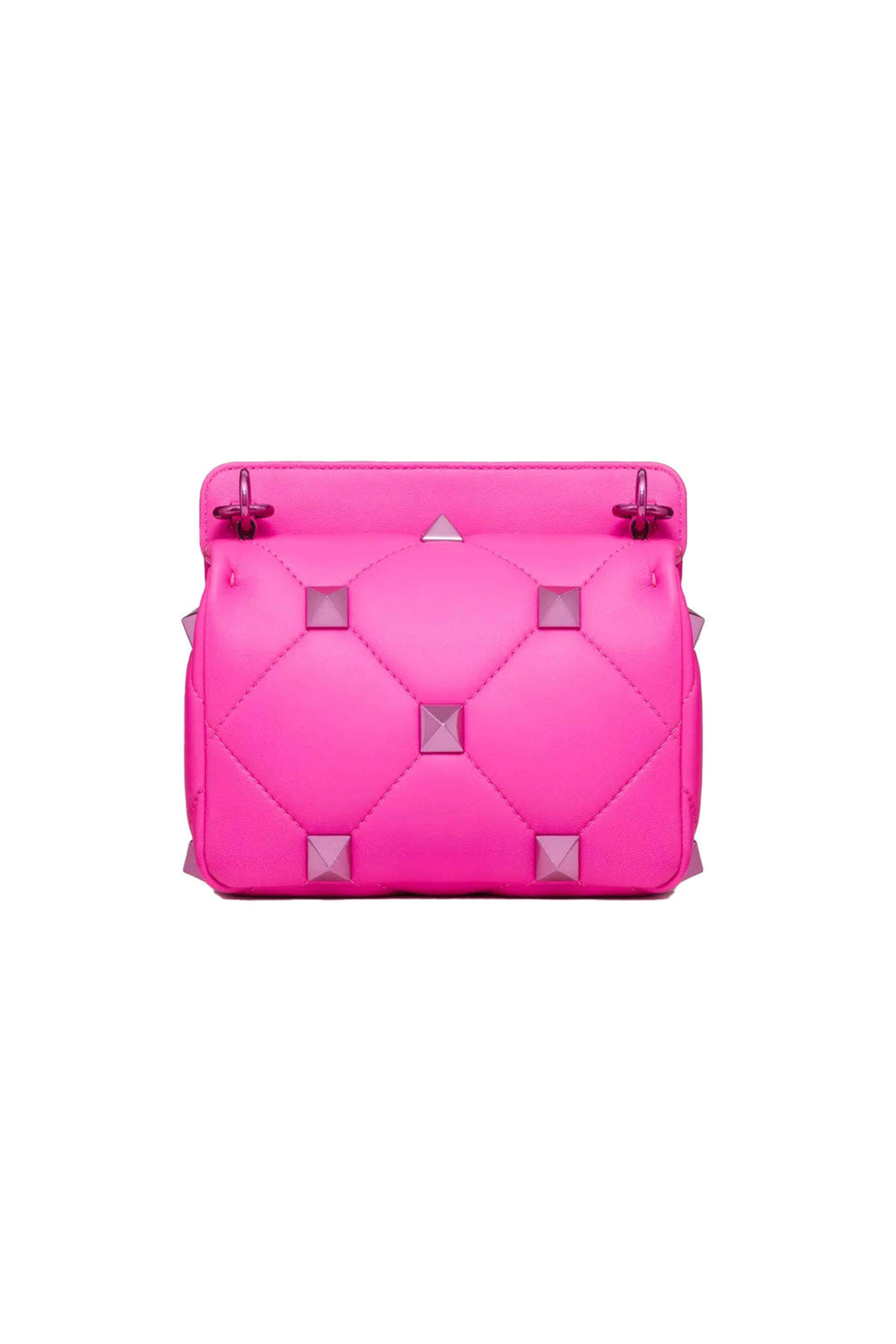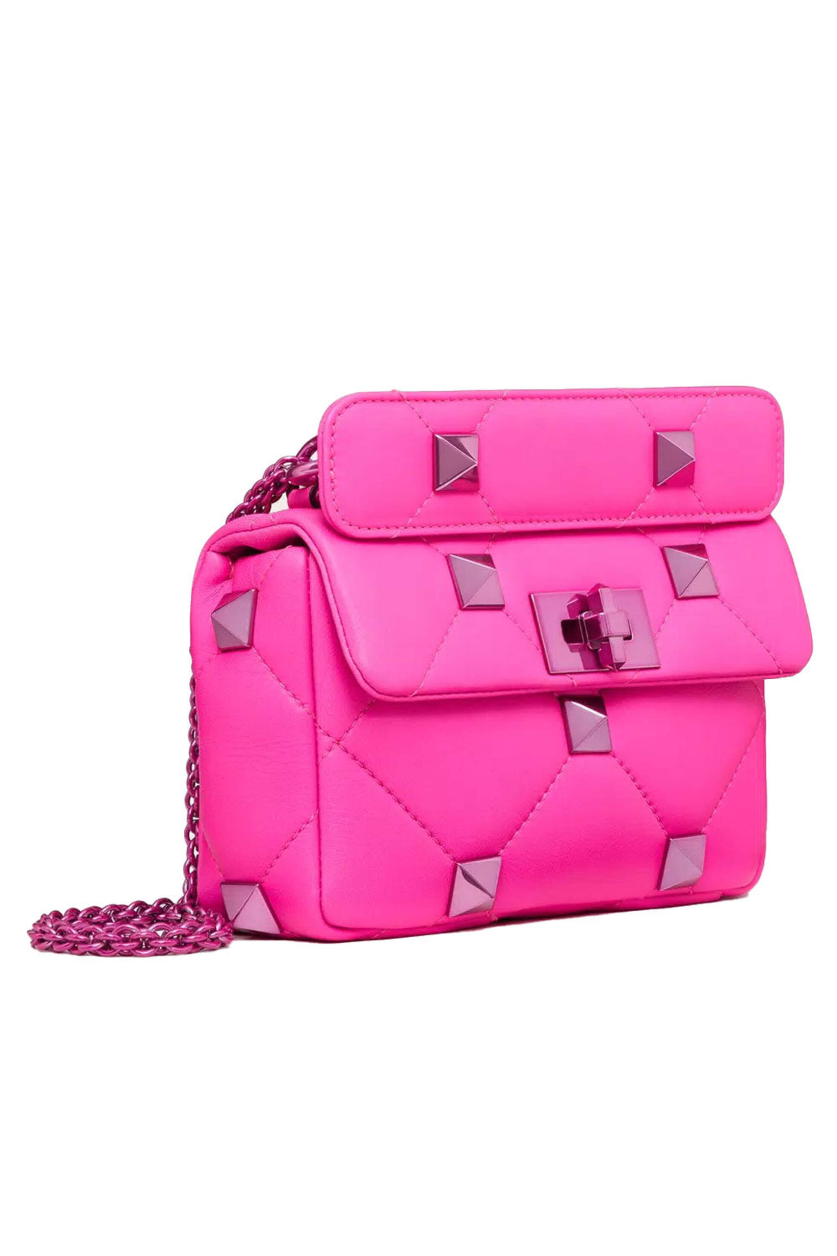 Valentino Garavani Small Roman Stud Shoulder Bag in Pink PP. Twist lock closure. Detachable sliding chain shoulder strap. Detachable top handle. Single interior slip pocket. Roman stud detail throughout. Quilted detail throughout. Tonal hardware. Nappa leather. 3.5 H x 5.1 W x 2.4 D. 11 21.6 shoulder strap length. Made in Italy.
