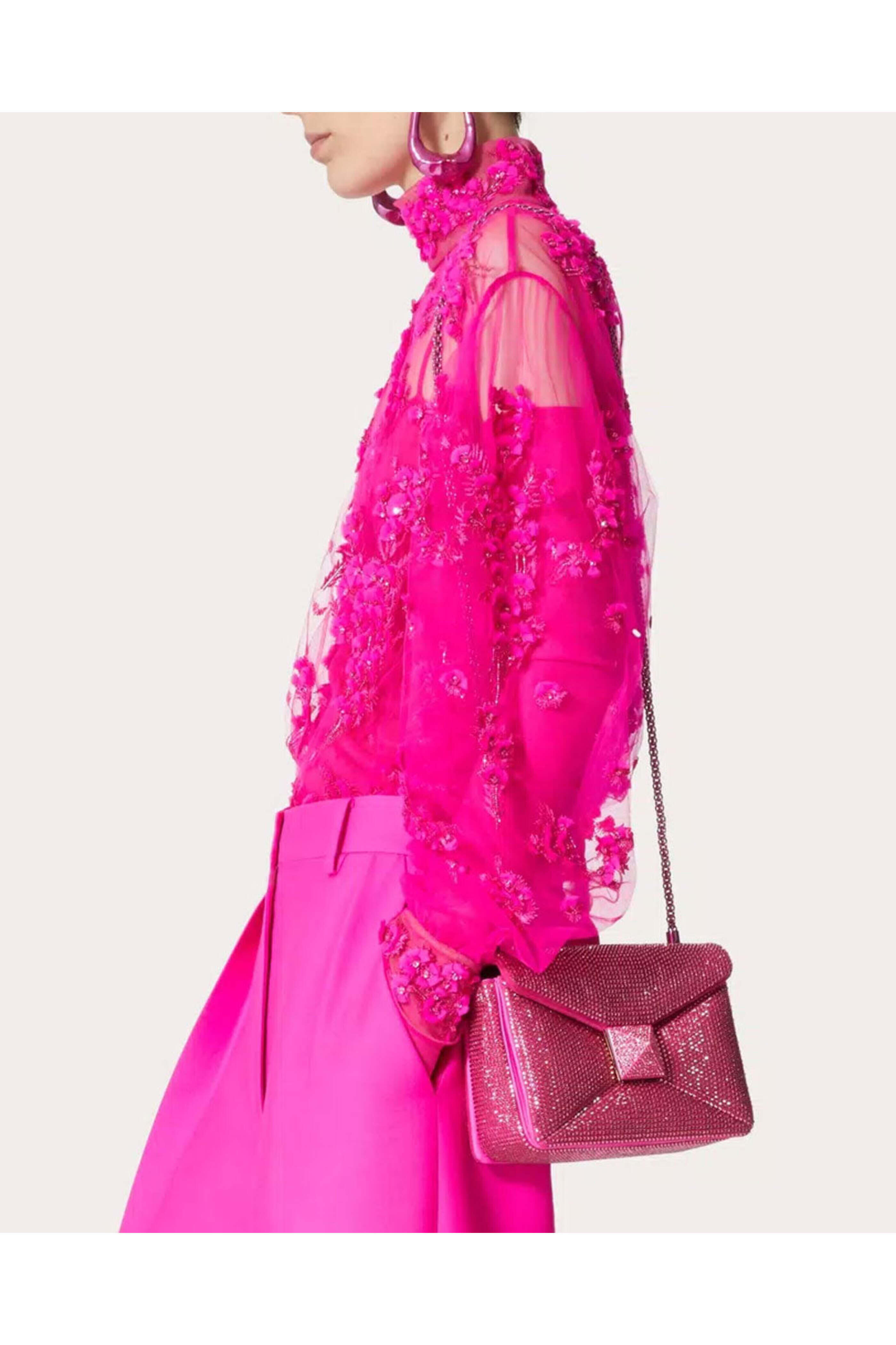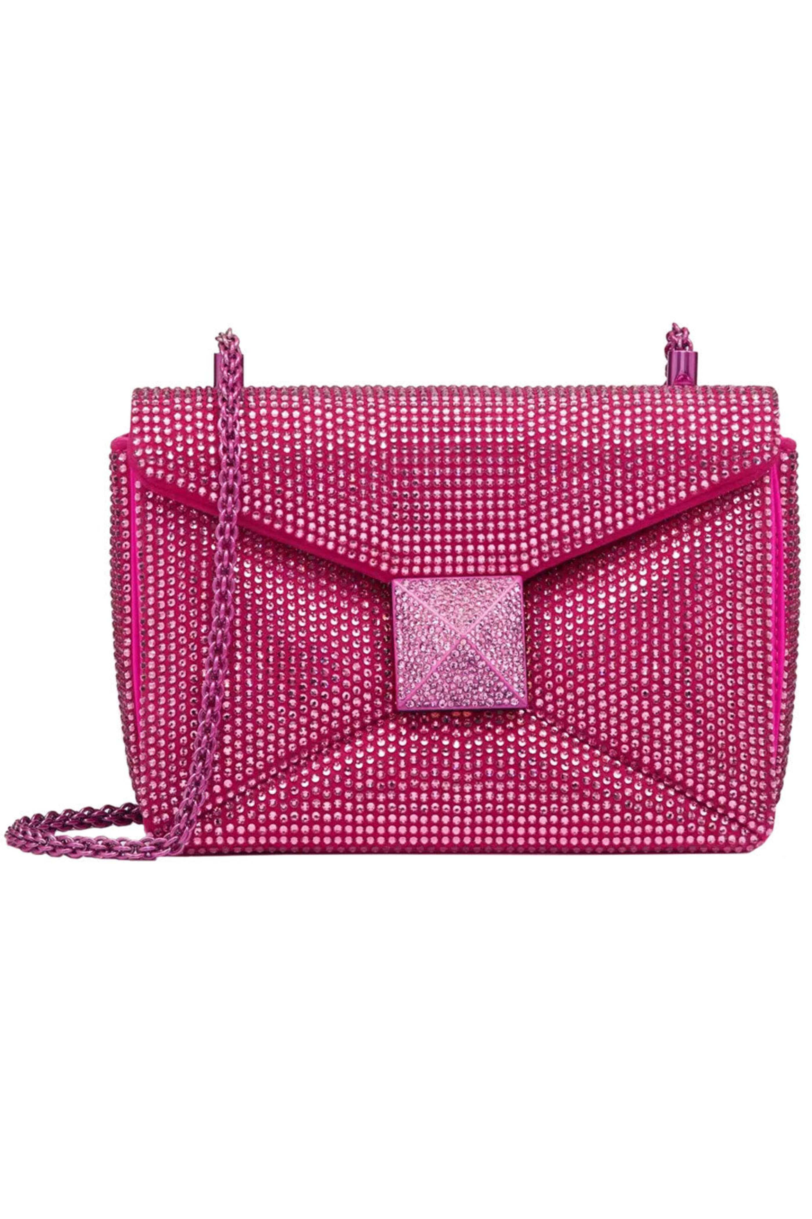 Valentino Garavani One Stud Rhinestone Small Crossbody Bag in Pink PP. Front flap closure. Magnetic fastening. Chain crossbody strap. Single interior slip pocket. Single interior slip pocket. Single maxi stud front; Swarovski crystal embellished throughout. Tonal hardware and embellishments. 5.5 H x 7.4 W x 4.3 D. 17.7 strap drop. Leather outer and lining, Swarovski crystal embellishment throughout. Made in Italy.