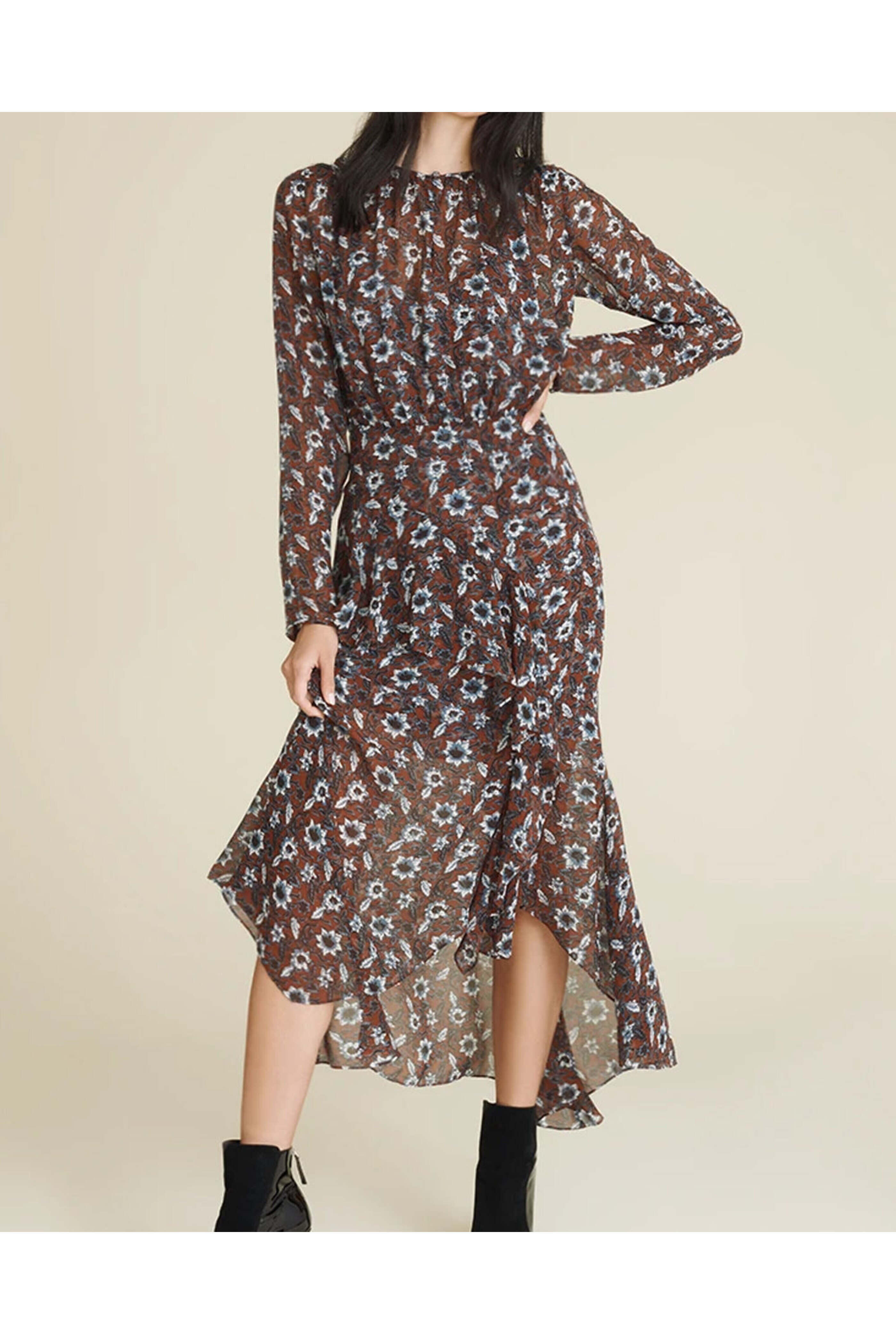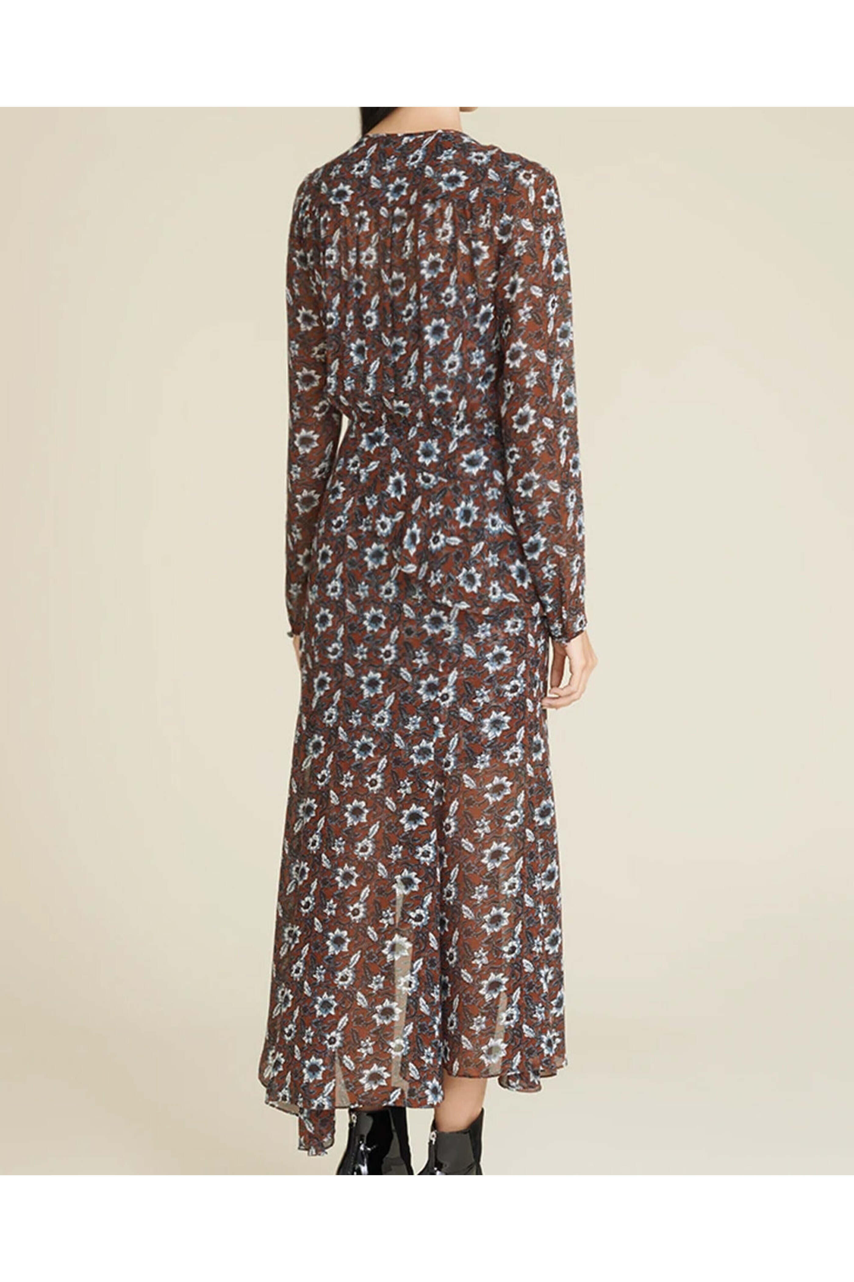 Veronica Beard Clay Floral Sazan Midi Dress Round neck; button closure and keyhole detail Long sleeves; single button cuffs Hidden side zip closure Fitted at waist Ruffle detail across front Handkerchief hemline; hem slit Midi length Unlined 100% silk.