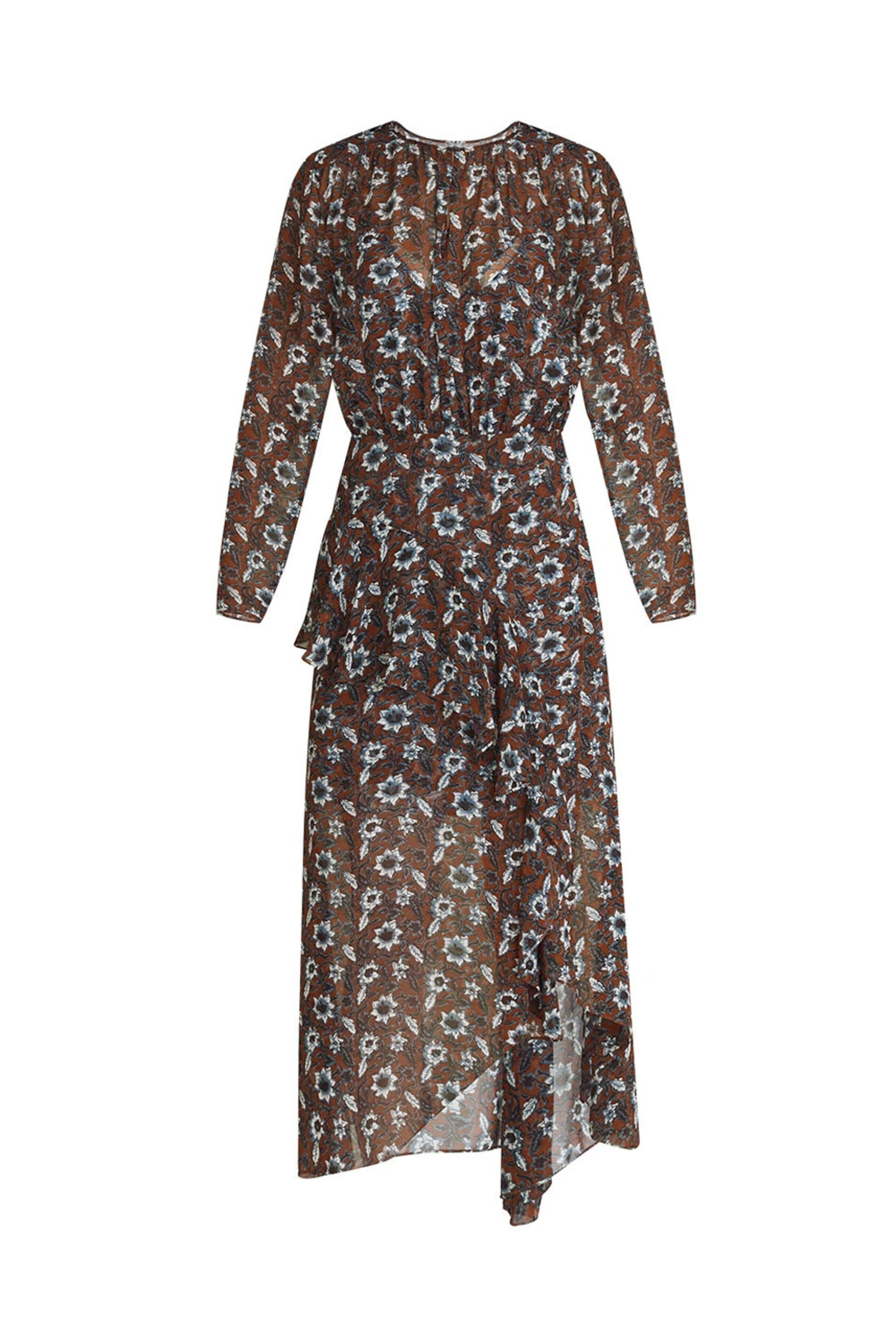 - Veronica Beard Clay Floral Sazan Midi Dress Round neck; button closure and keyhole detail Long sleeves; single button cuffs Hidden side zip closure Fitted at waist Ruffle detail across front Handkerchief hemline; hem slit Midi length Unlined 100% silk