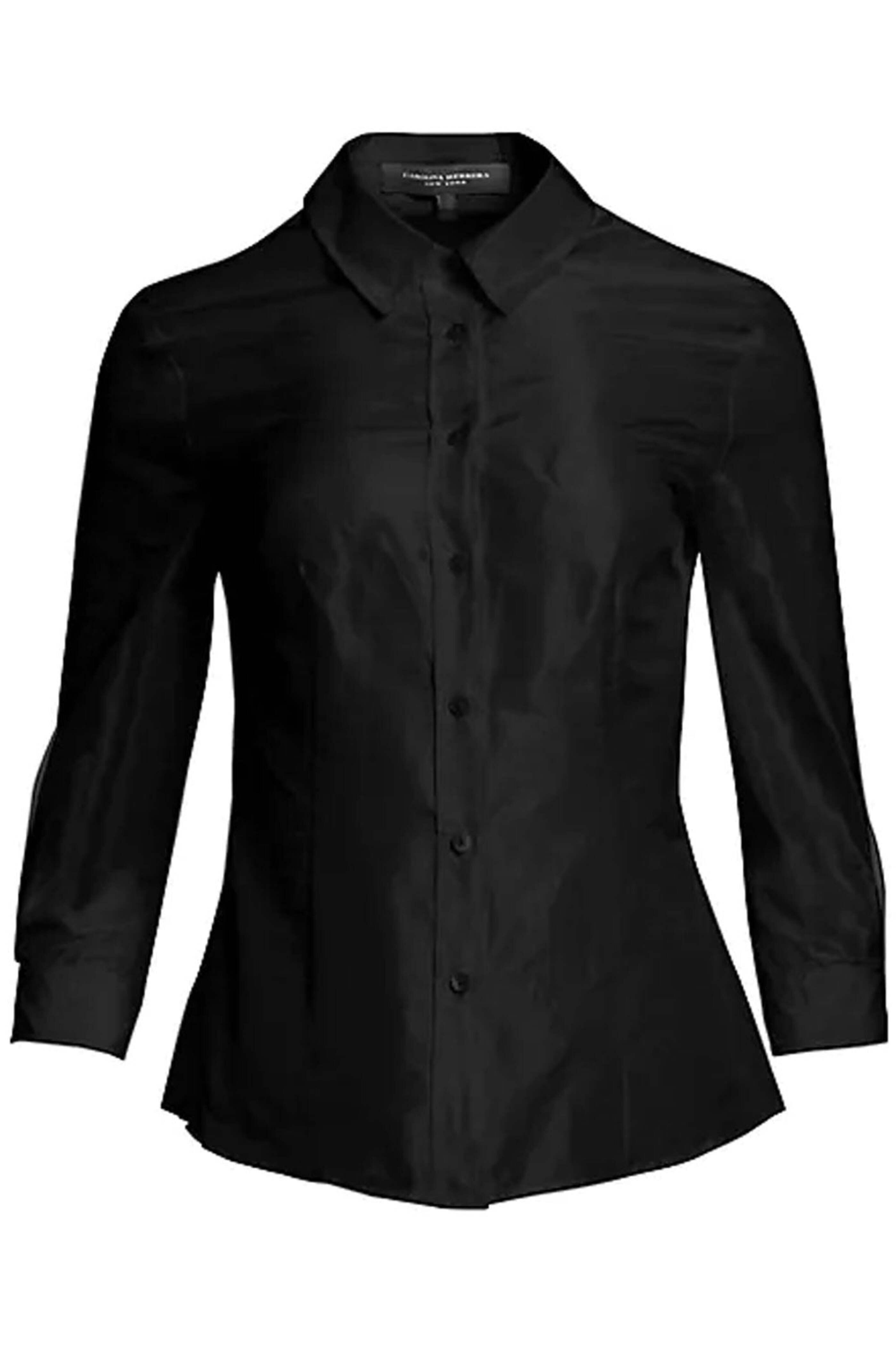 Carolina Herrera Black Signature Taffeta Blouse. Spread collar. 3/4 sleeves. Front button closure. Seam detail at front and back. High/low hem. Made in Italy. 100% silk.
