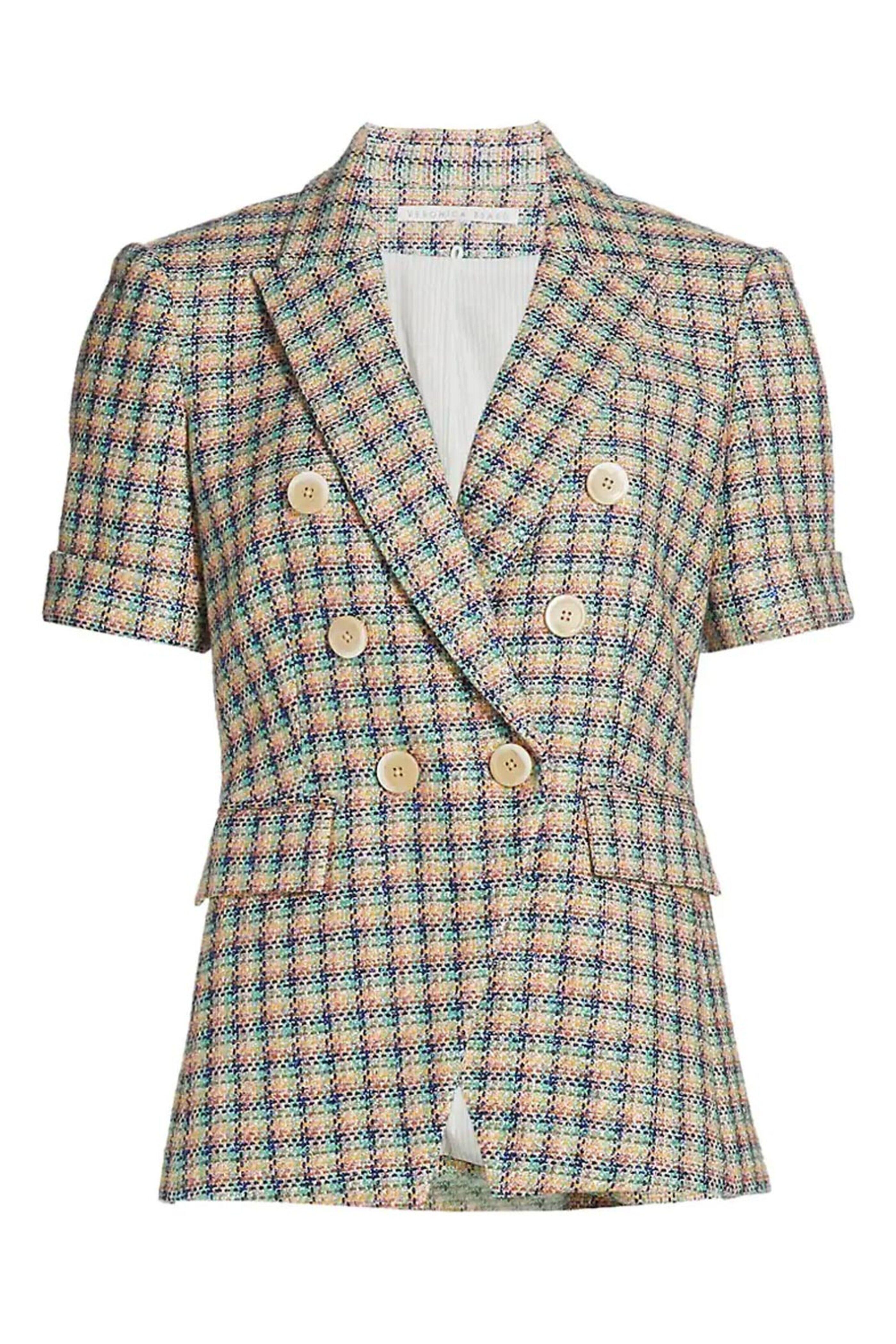Veronica Beard Rainbow Tweed Jenny Dickey Jacket. Notch lapels. Shoulder pads. Short sleeves. Front button closure. Front flap pockets. Dickey compatible. Lined. 63% cotton, 19% other fibers, 12% polyester, 6% nylon.