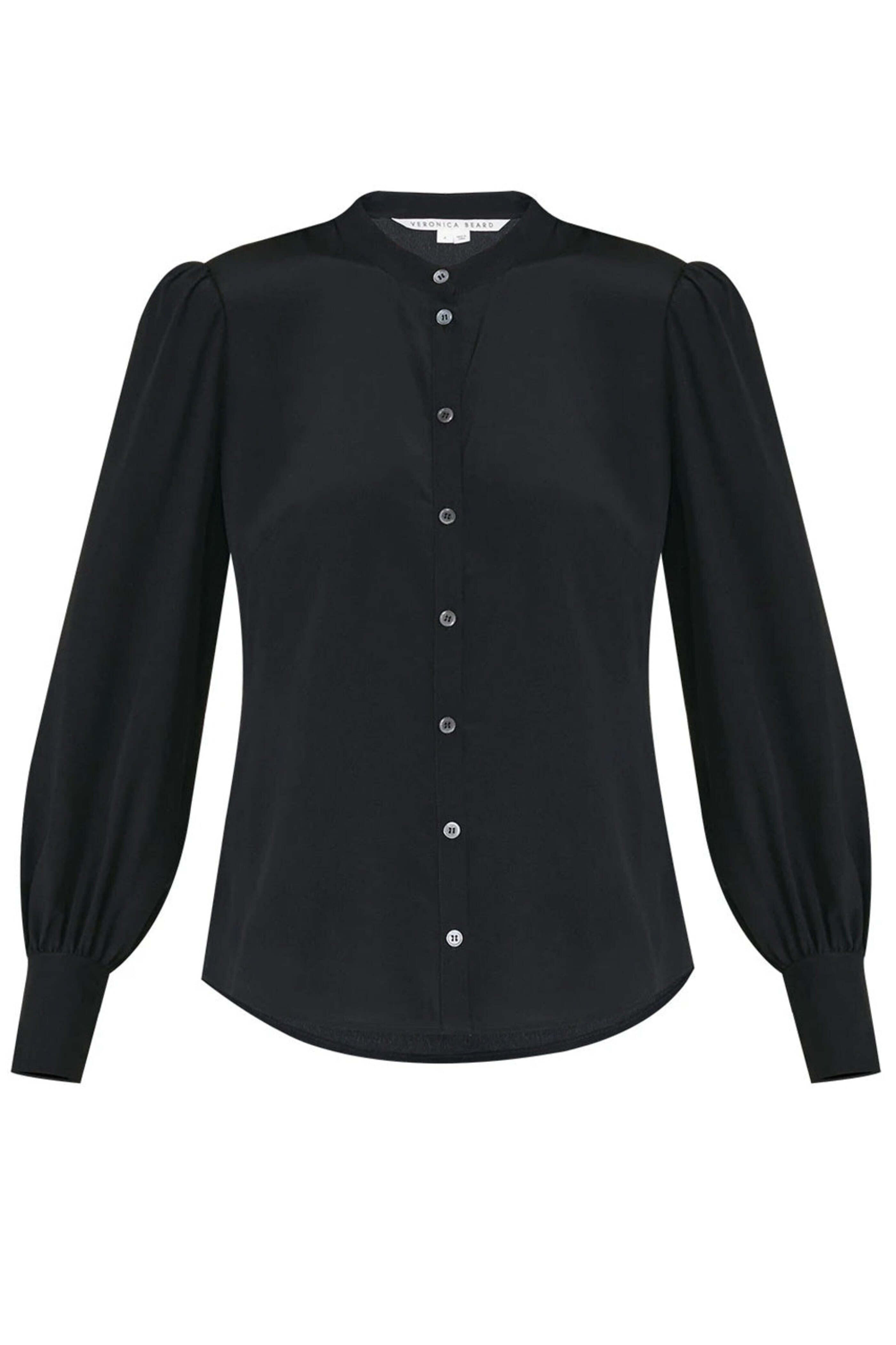 - Veronica Beard Black Button Down Suvi Blouse Round neck Puff shoulders Long sleeves; button cuffs Button down front closure Relaxed fit Unlined 100% silk