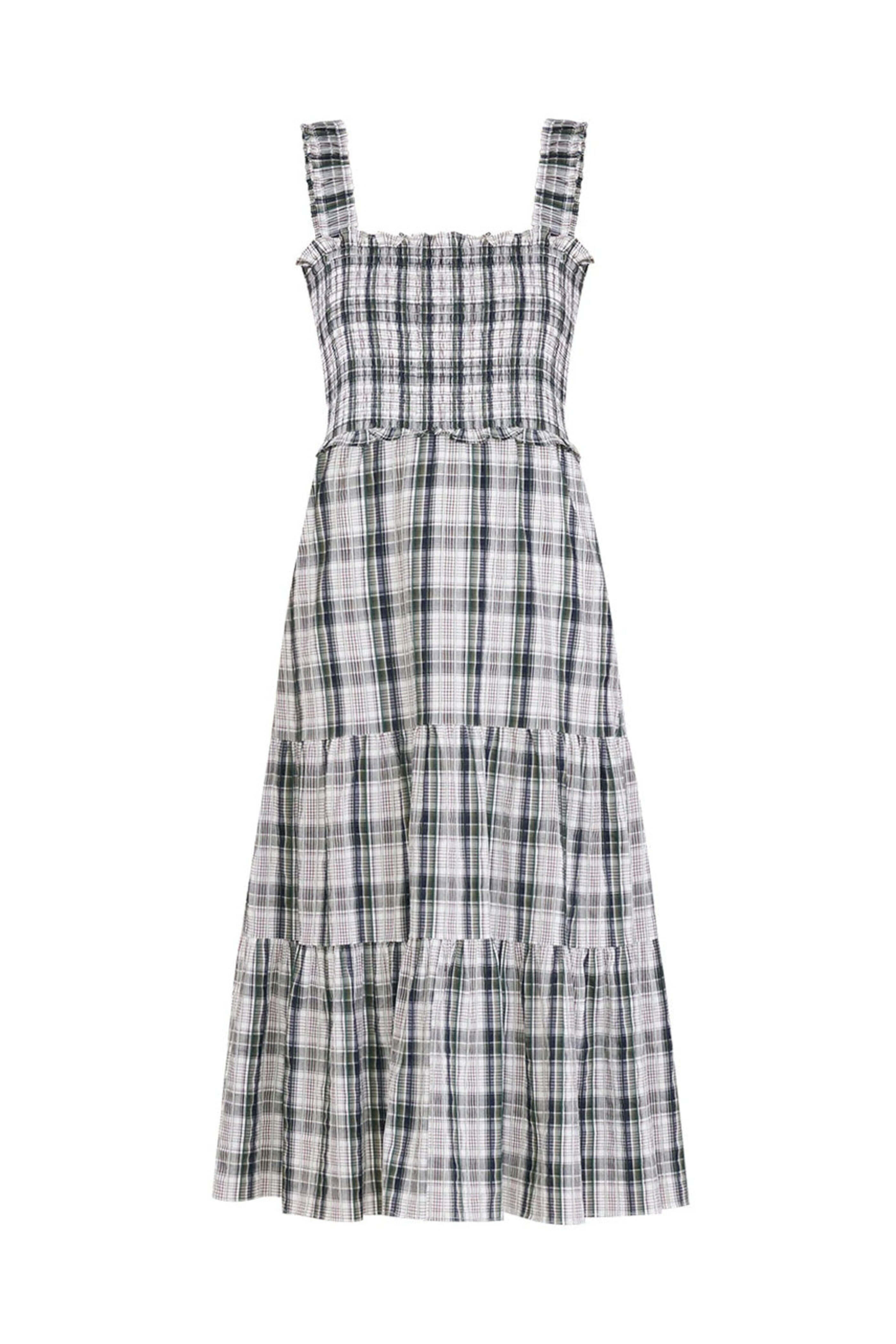 Veronica Beard Multi Plaid Ziada Midi Dress. Square neck. Square back. Sleeveless; ruched shoulder straps. Smocked bodice. Tiered a line skirt. Midi length. Unlined. 66% cotton, 19% viscose, 15% polyester.