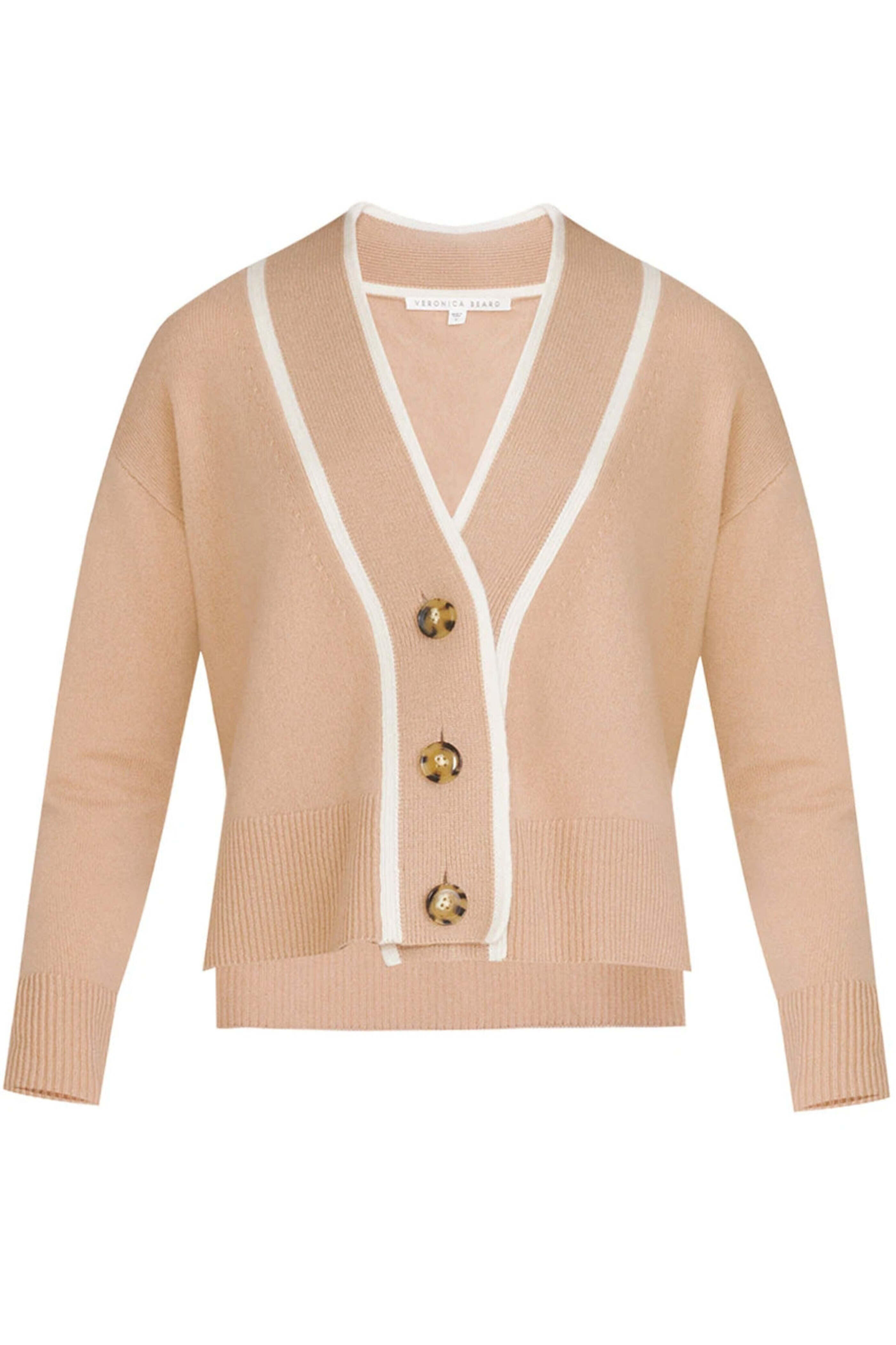- Veronica Beard Camel Trisha Cashmere Cardigan V neck Drop shoulders Long sleeves Ribbed cuffs and hem Button down front closure Relaxed fit Unlined 100% cashmere