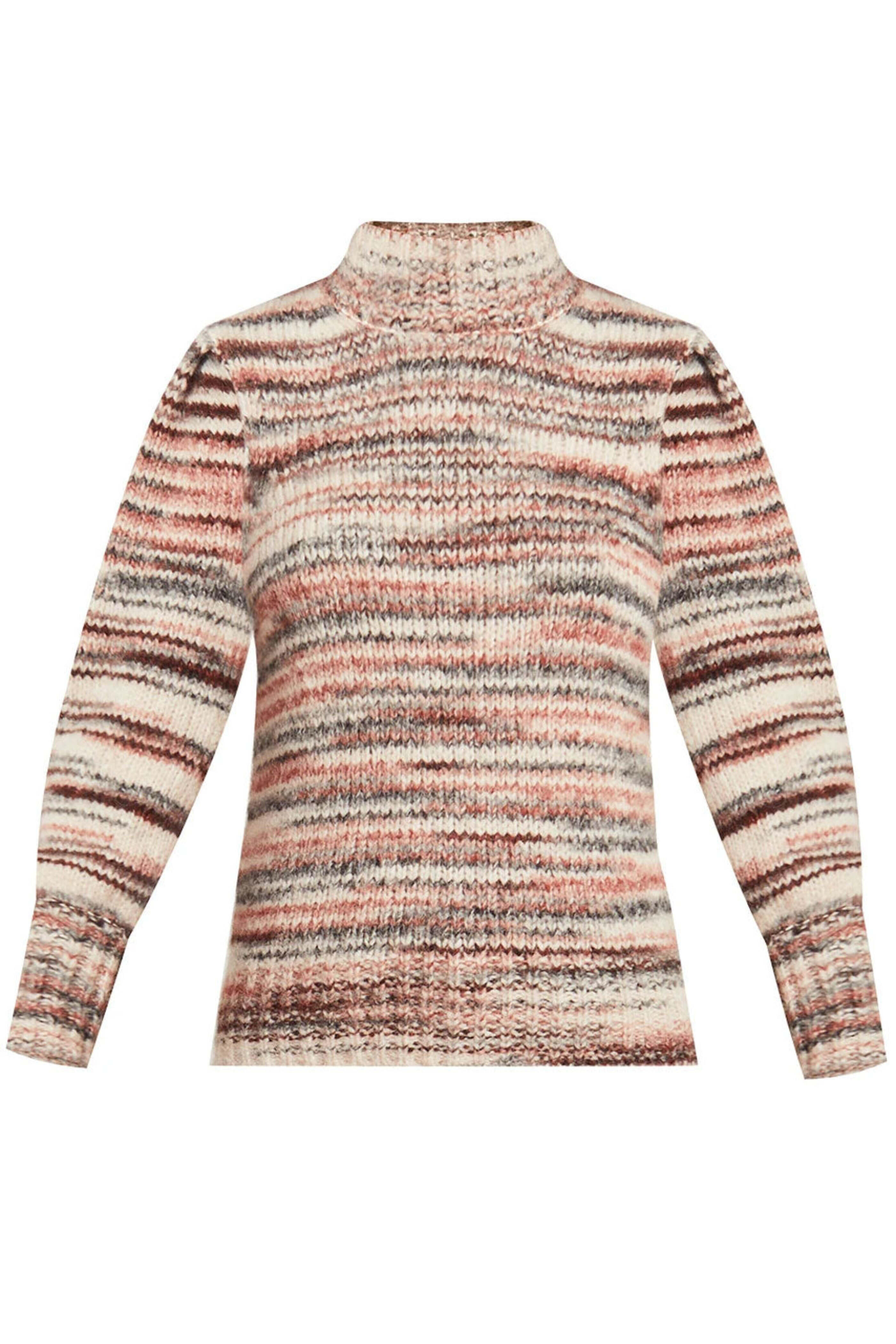 Veronica Beard Pink Multi Knit Alston Sweater. Mock neck. Puff shoulders. Long sleeves. Relaxed fit. Knit fabrication. 70% baby alpaca, 20% polyamide, 10% wool.