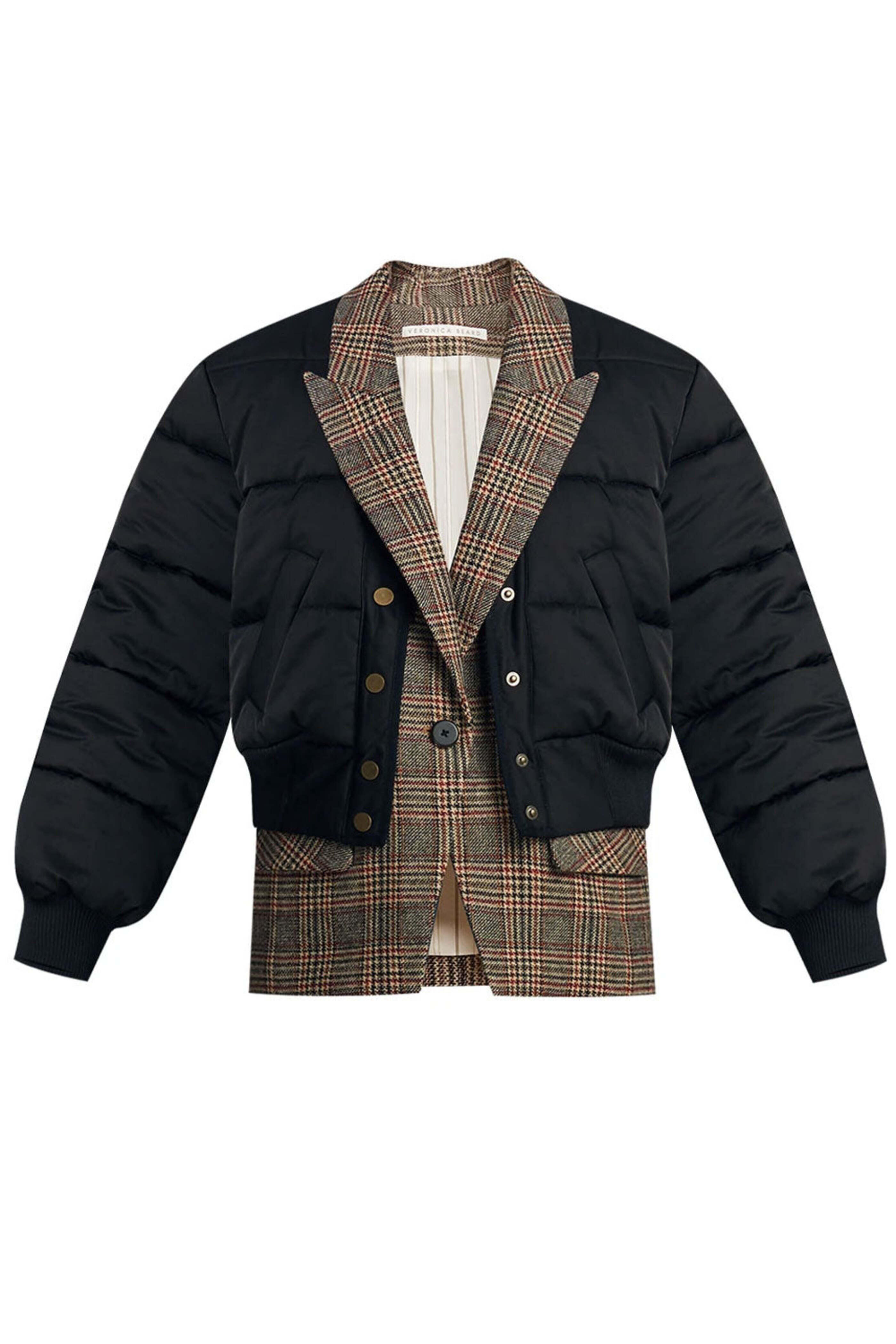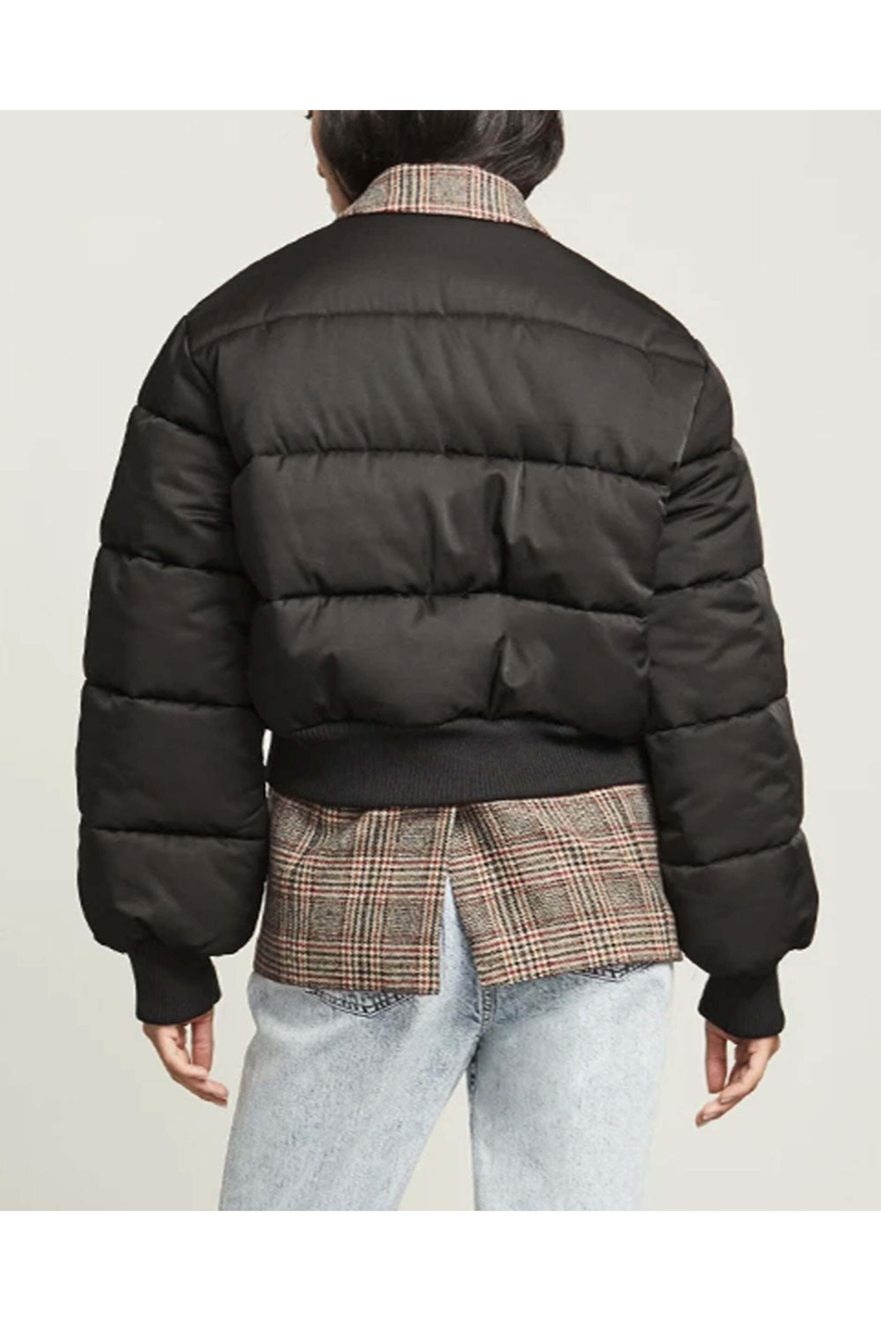 Veronica Beard Black Larkin Puffer Jacket. Lapels. Long sleeves; ribbed cuffs. Button down closure. Side slip pockets. Faux layer fabrication. Puffer silhouette. Lined. 100% polyester.