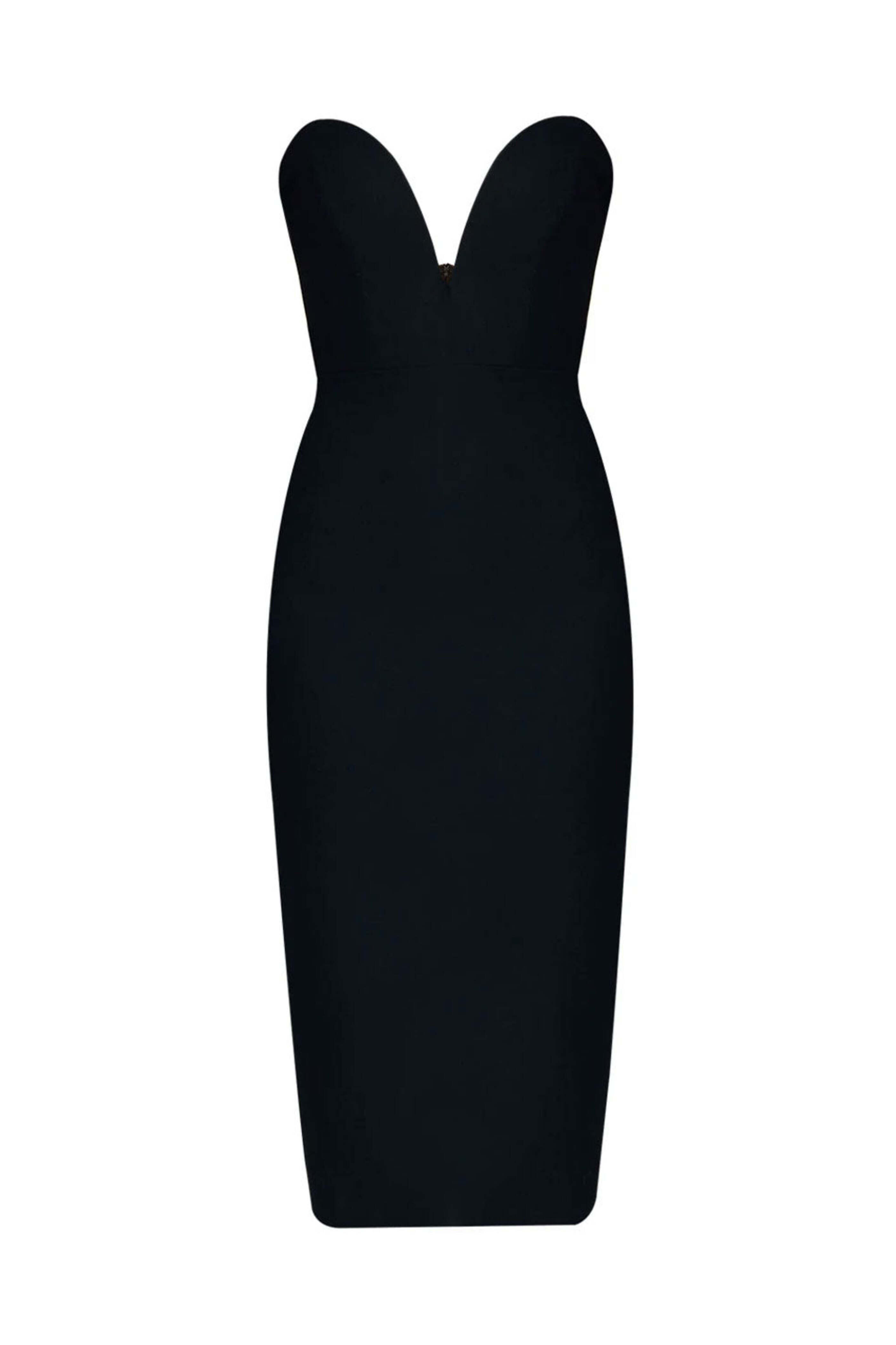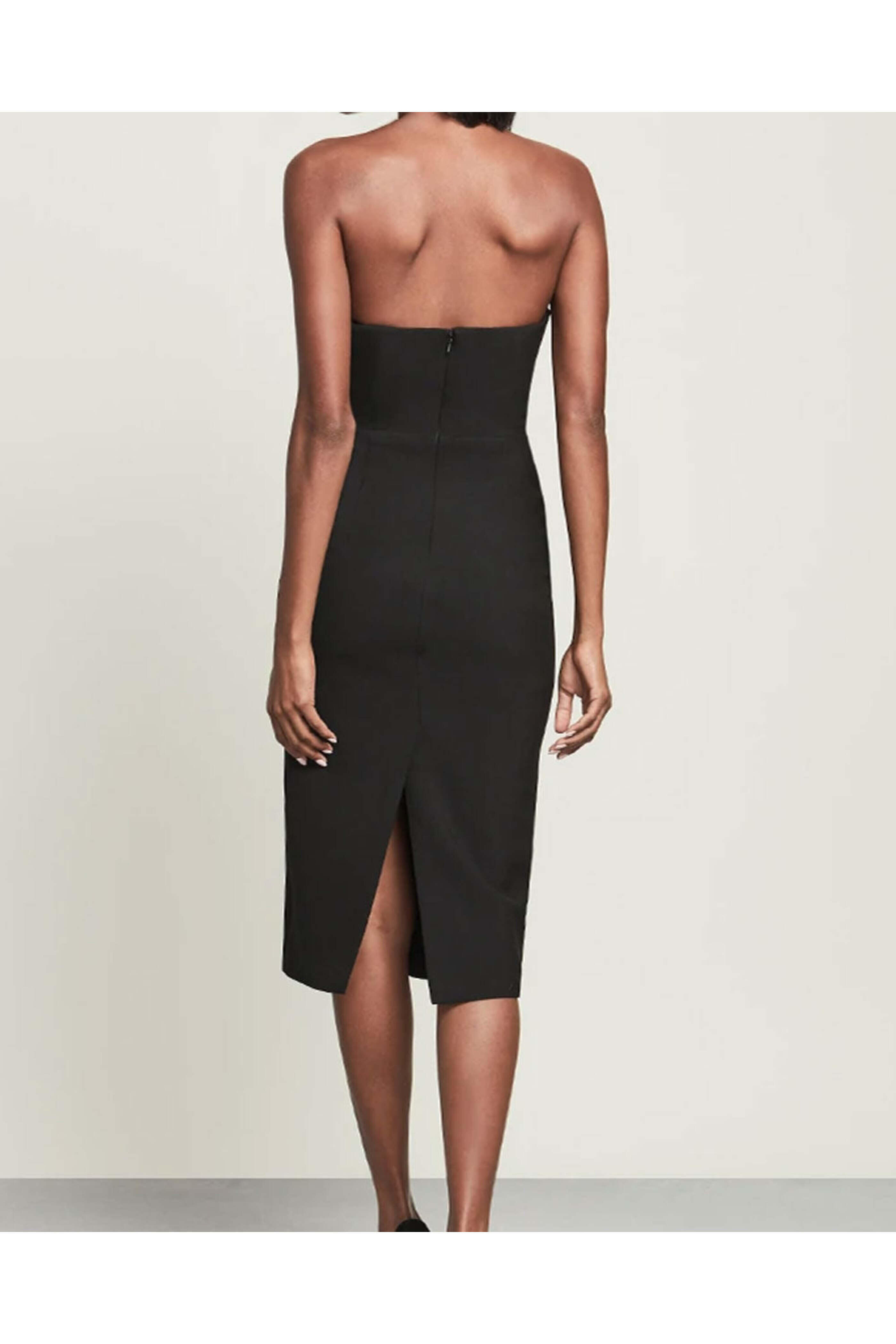 Veronica Beard Black Colebrook Midi Dress. Sweetheart neckline; deep v (boning for structure). Sleeveless. Concealed zip closure. Slim fit (runs slightly small). Midi length. Lined. 68% polyester, 28% viscose, 4% elastane.