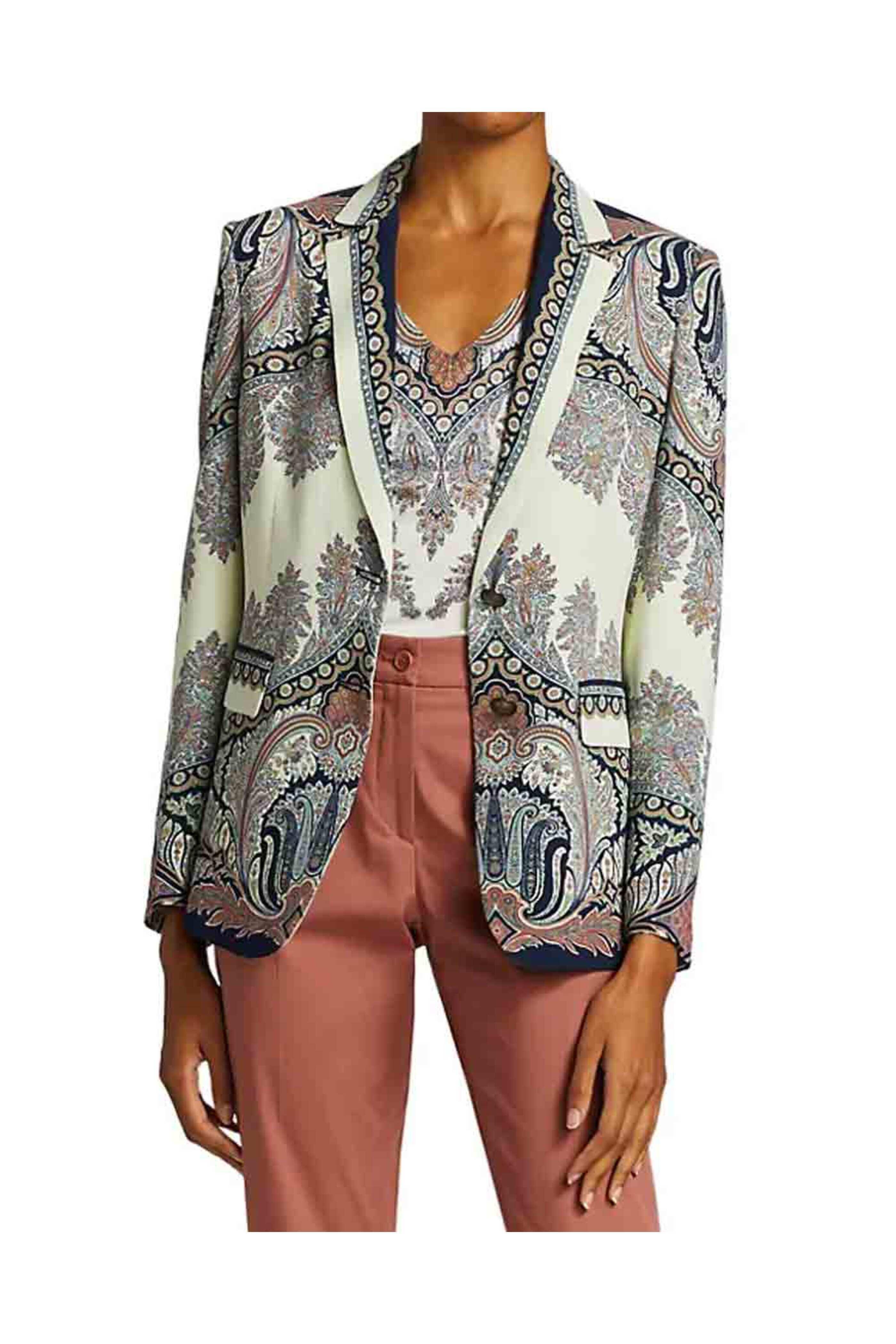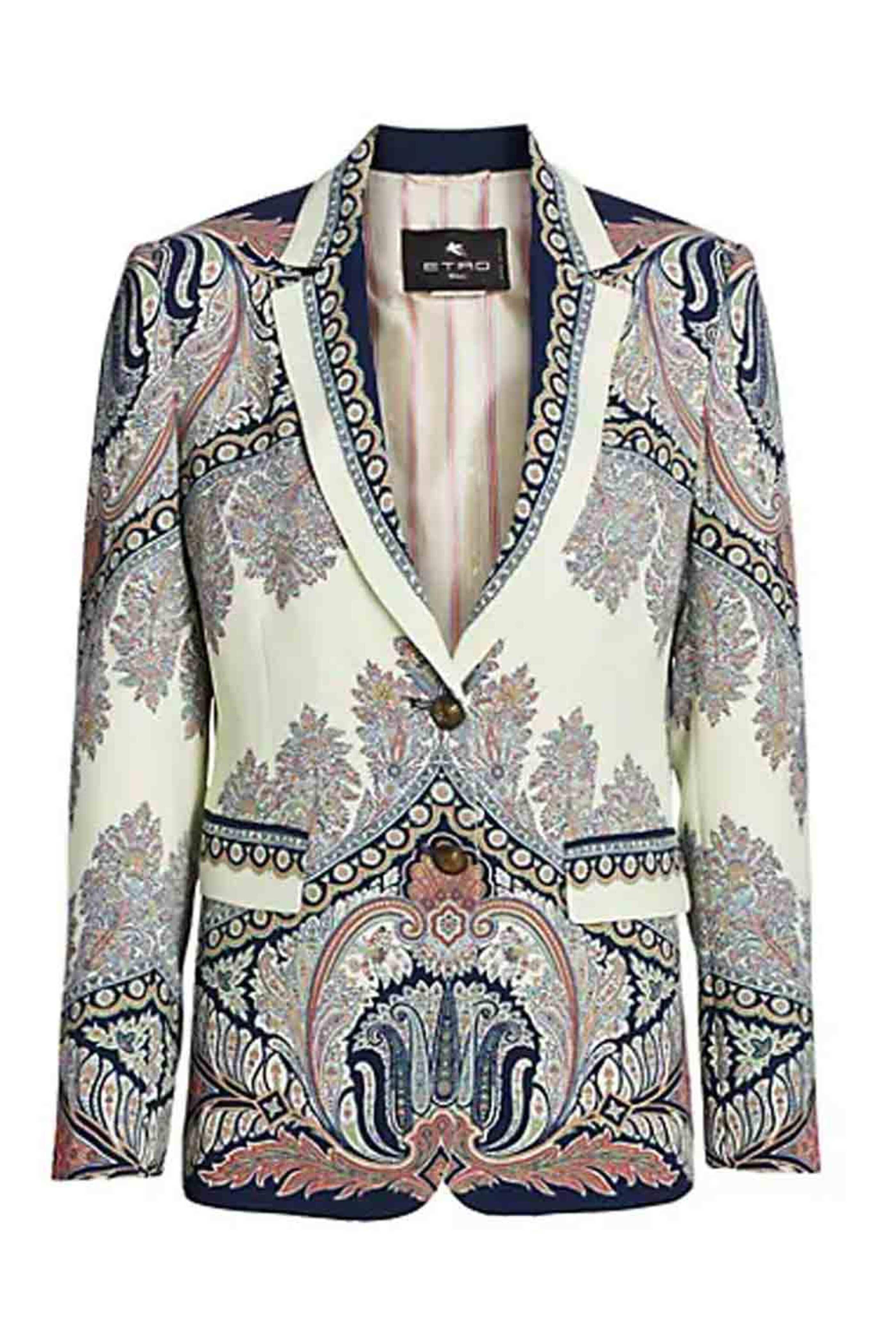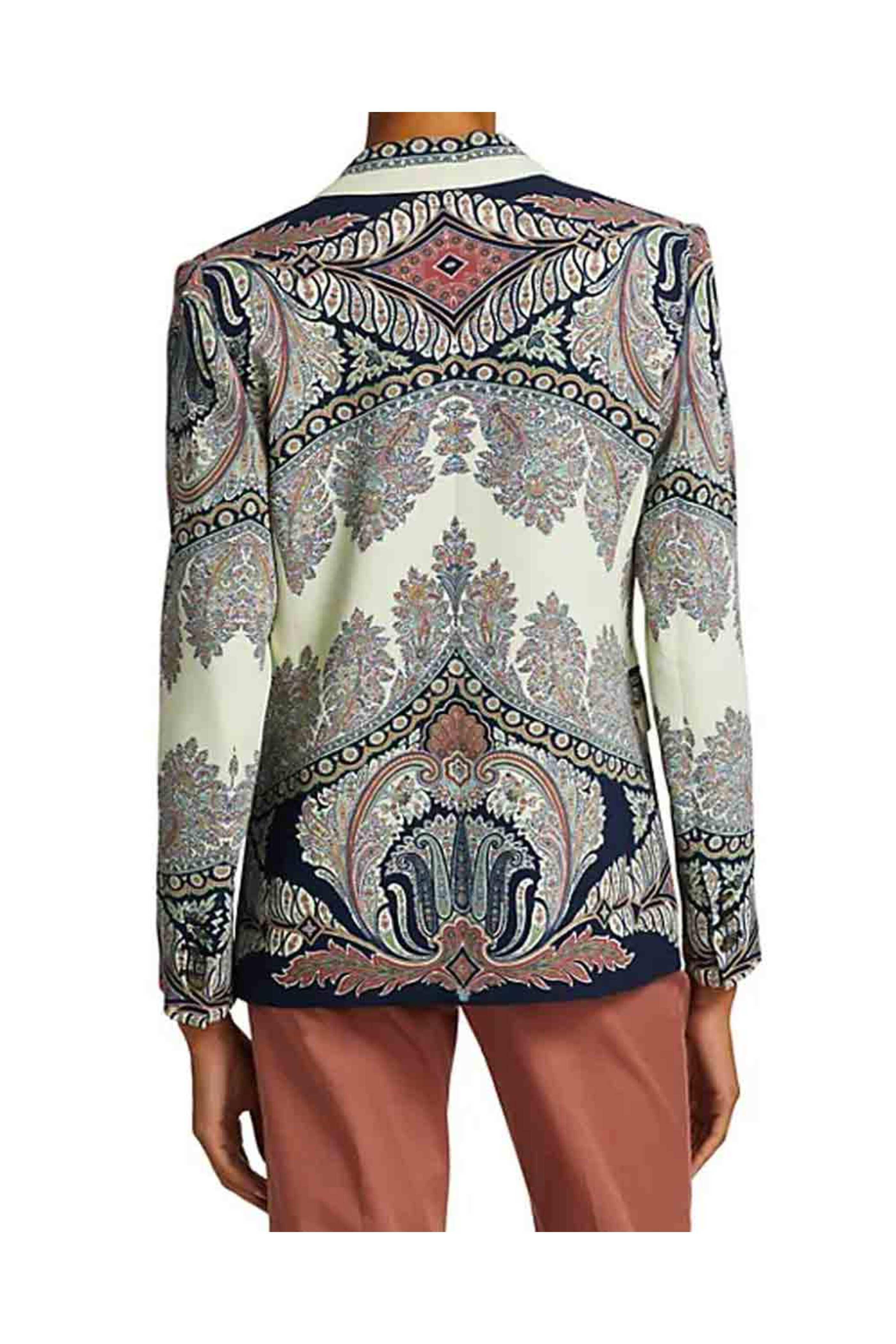Etro Navy Paisley Milano Blazer Jacket. Notch lapels. Long sleeves; faux button cuffs. Front buton closure. Flap pockets a front. Lined. Made in Italy. 96% viscose, 4% elastane.