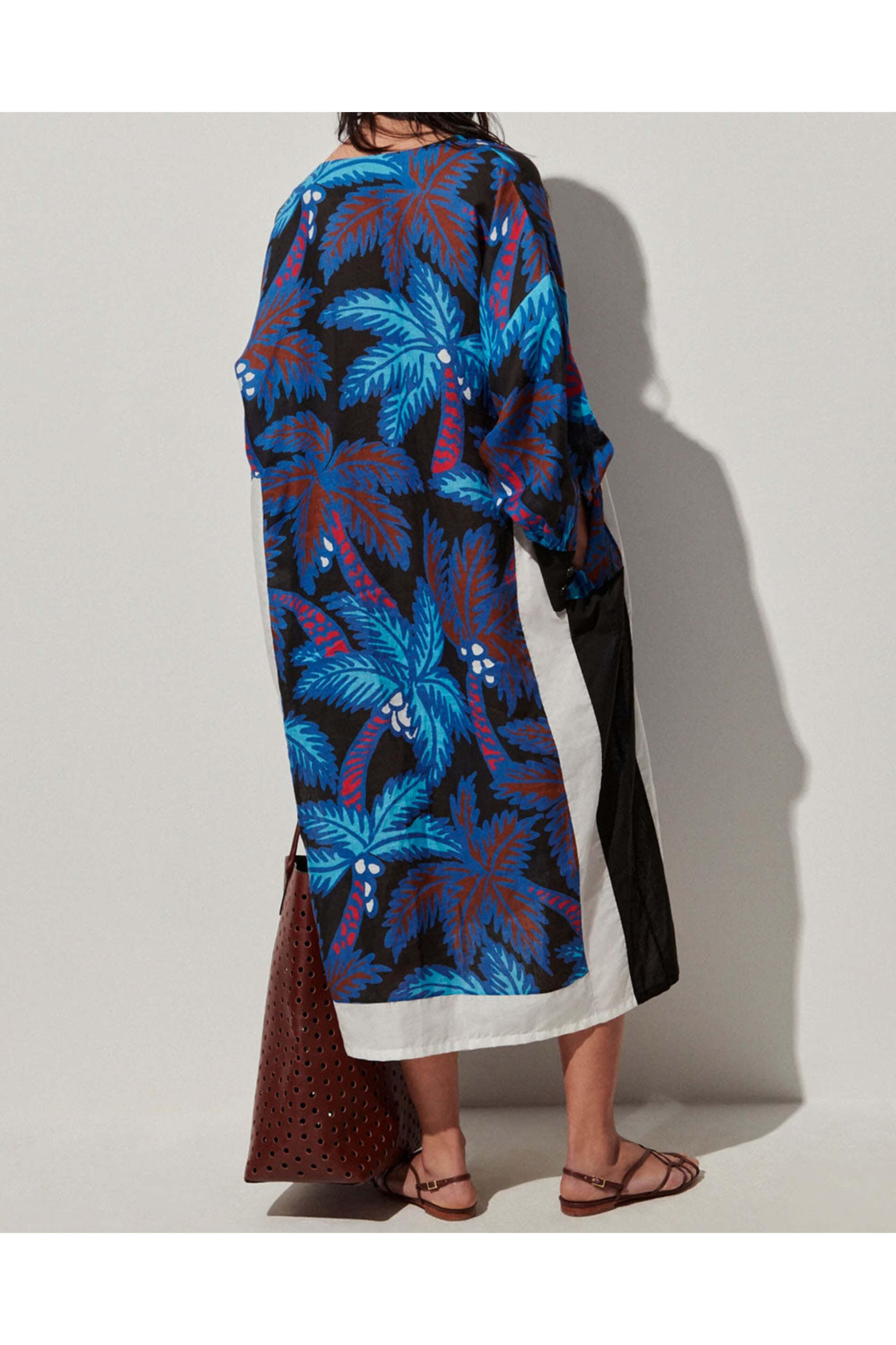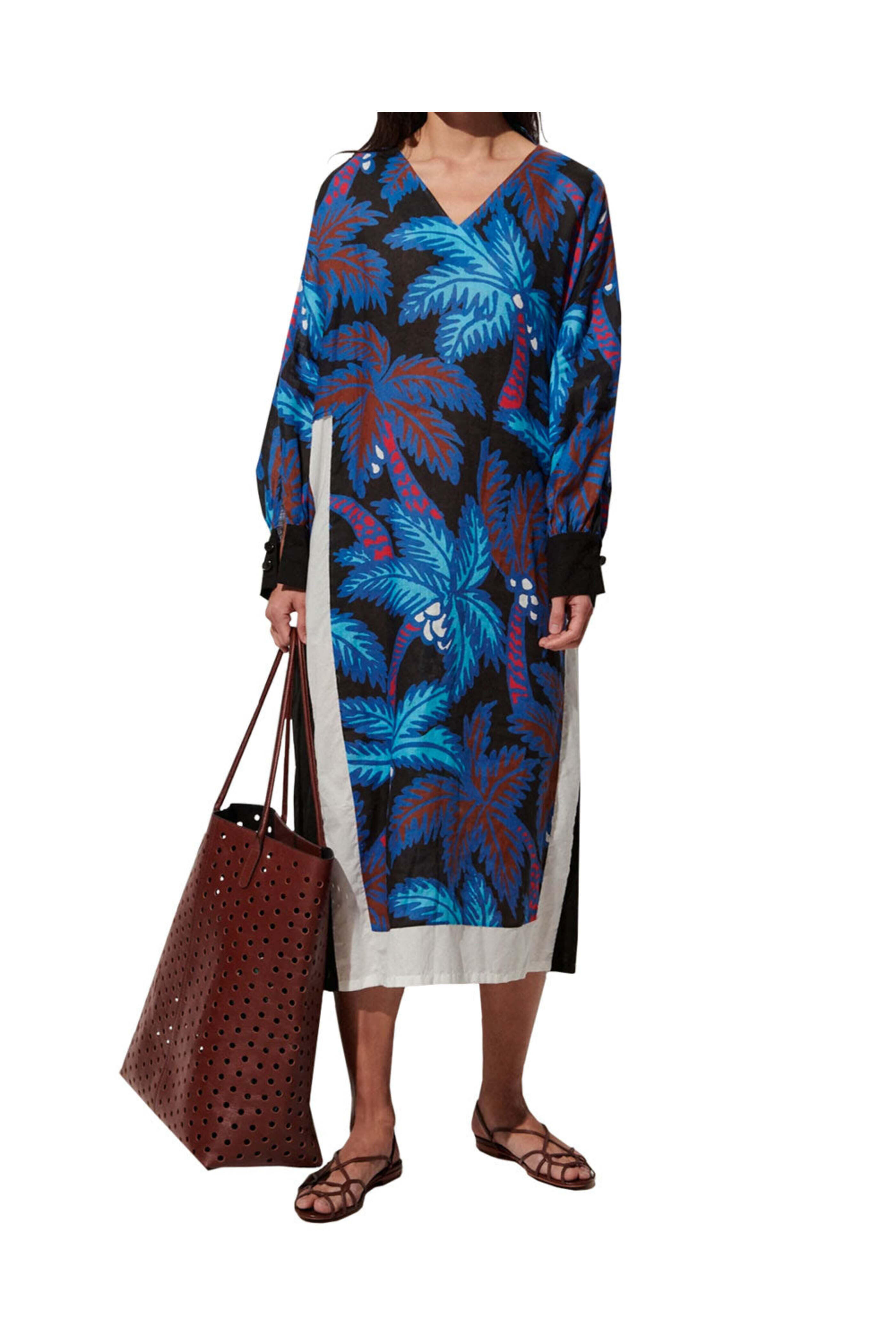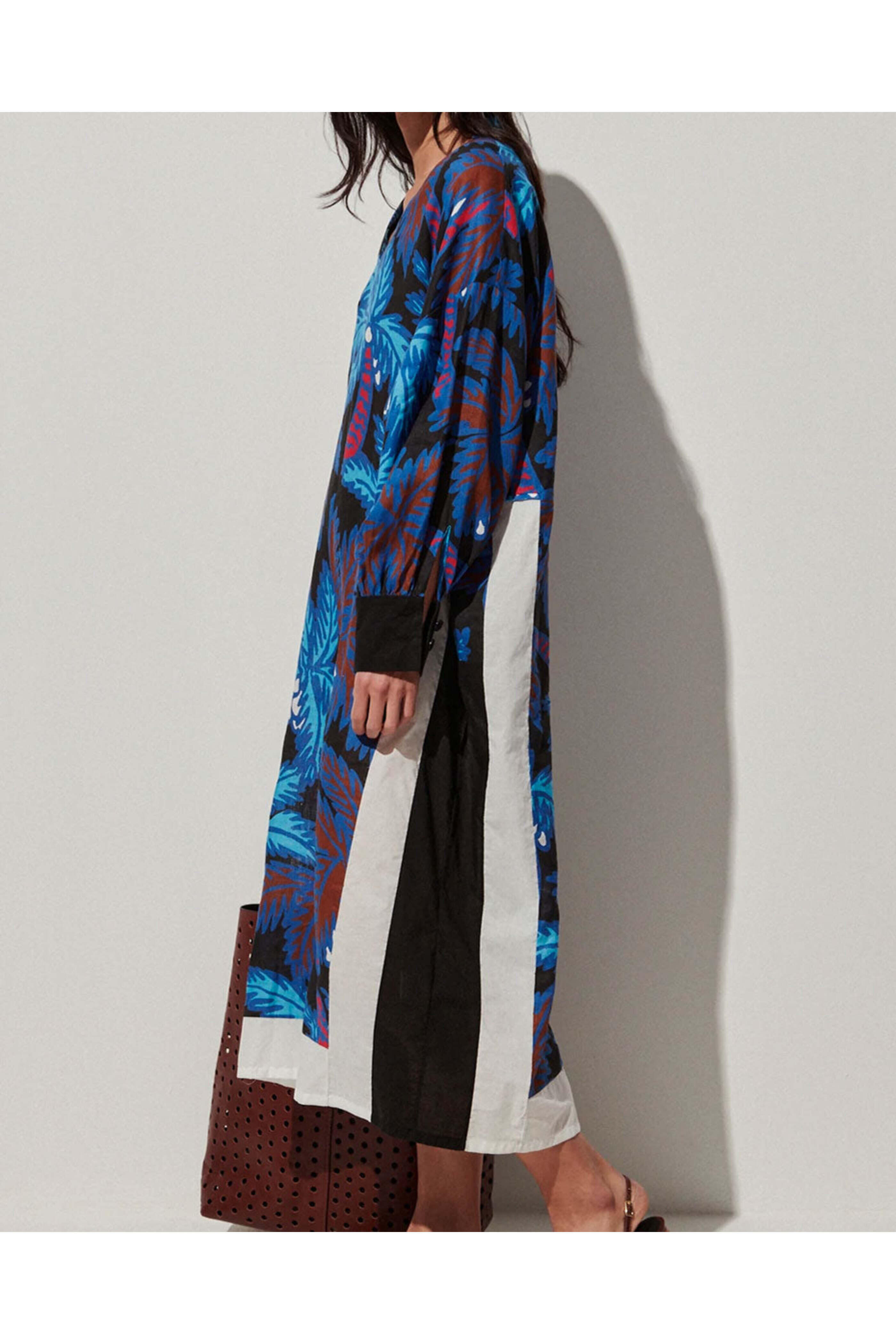 Rachel Comey Black Multi Maisie Dress. V neck. Long dolman sleeves; button cuffs. Relaxed fit. Midi length. 100% linen.