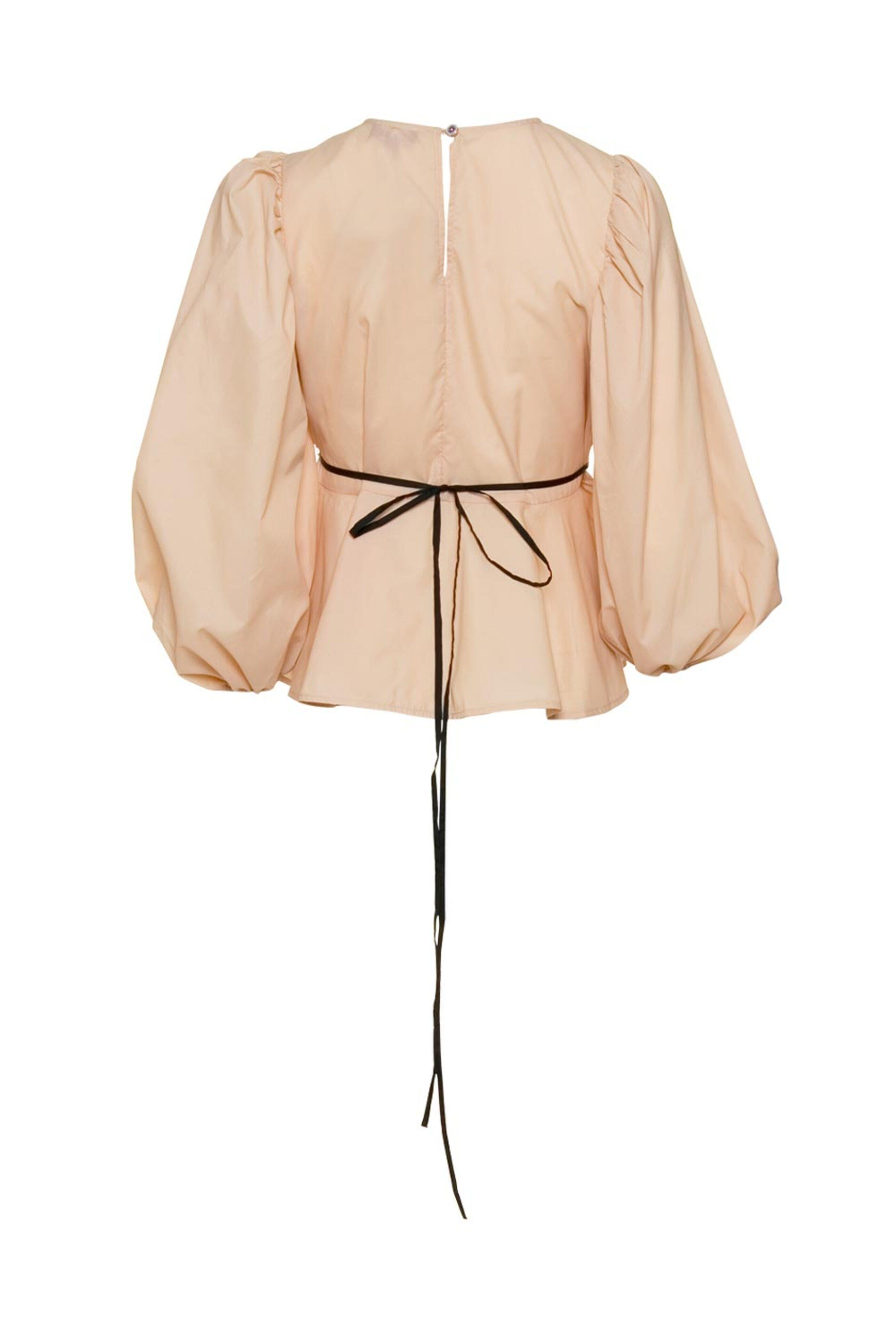 - Staud Buff Nylon Laurence Top Round neck Button closure at back; keyhole detail ¾ length puff sleeves Ties at waist Peplum silhouette Unlined 100% recycled nylon