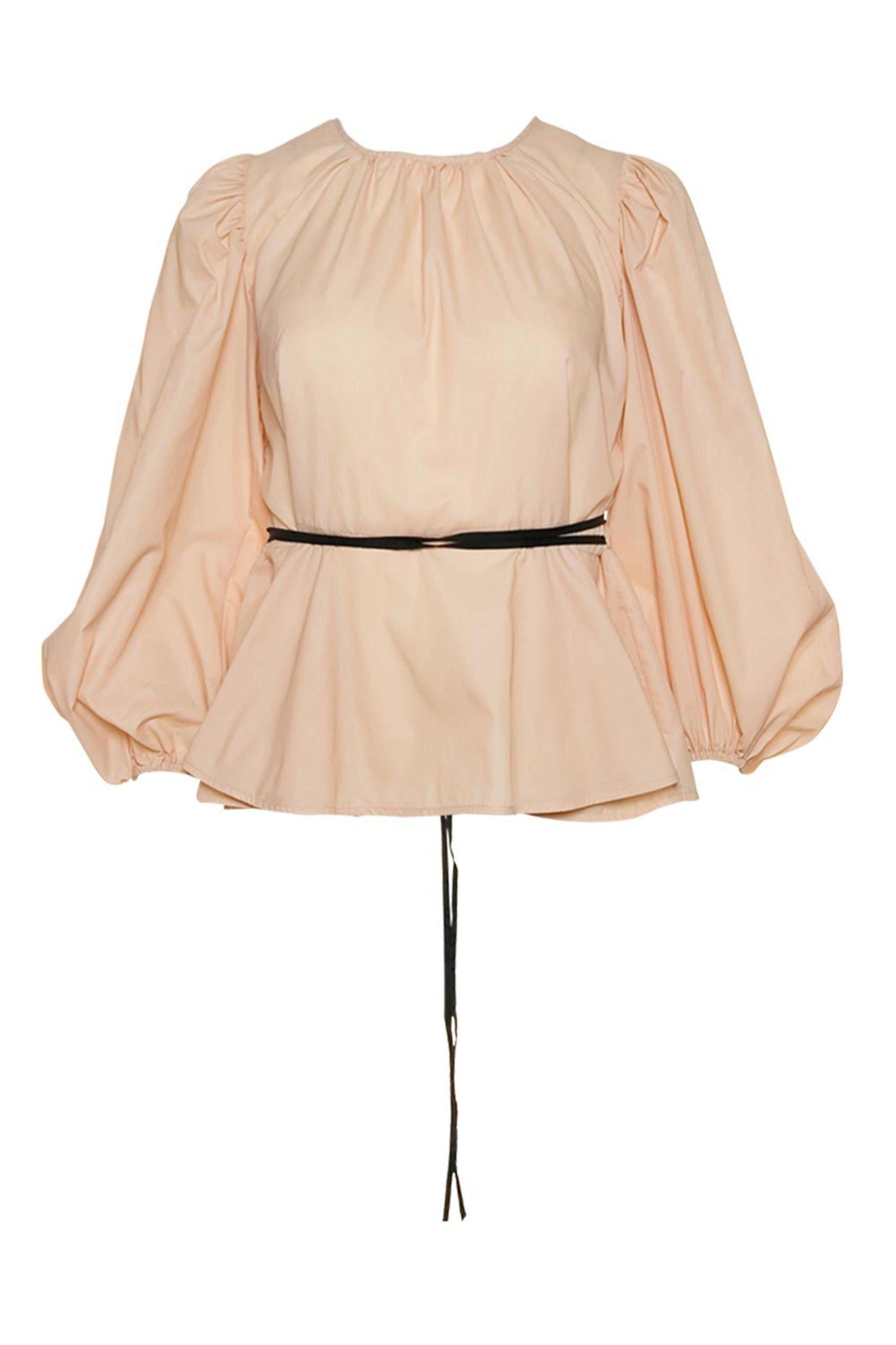 Staud Buff Nylon Laurence Top Round neck Button closure at back; keyhole detail ¾ length puff sleeves Ties at waist Peplum silhouette Unlined 100% recycled nylon.