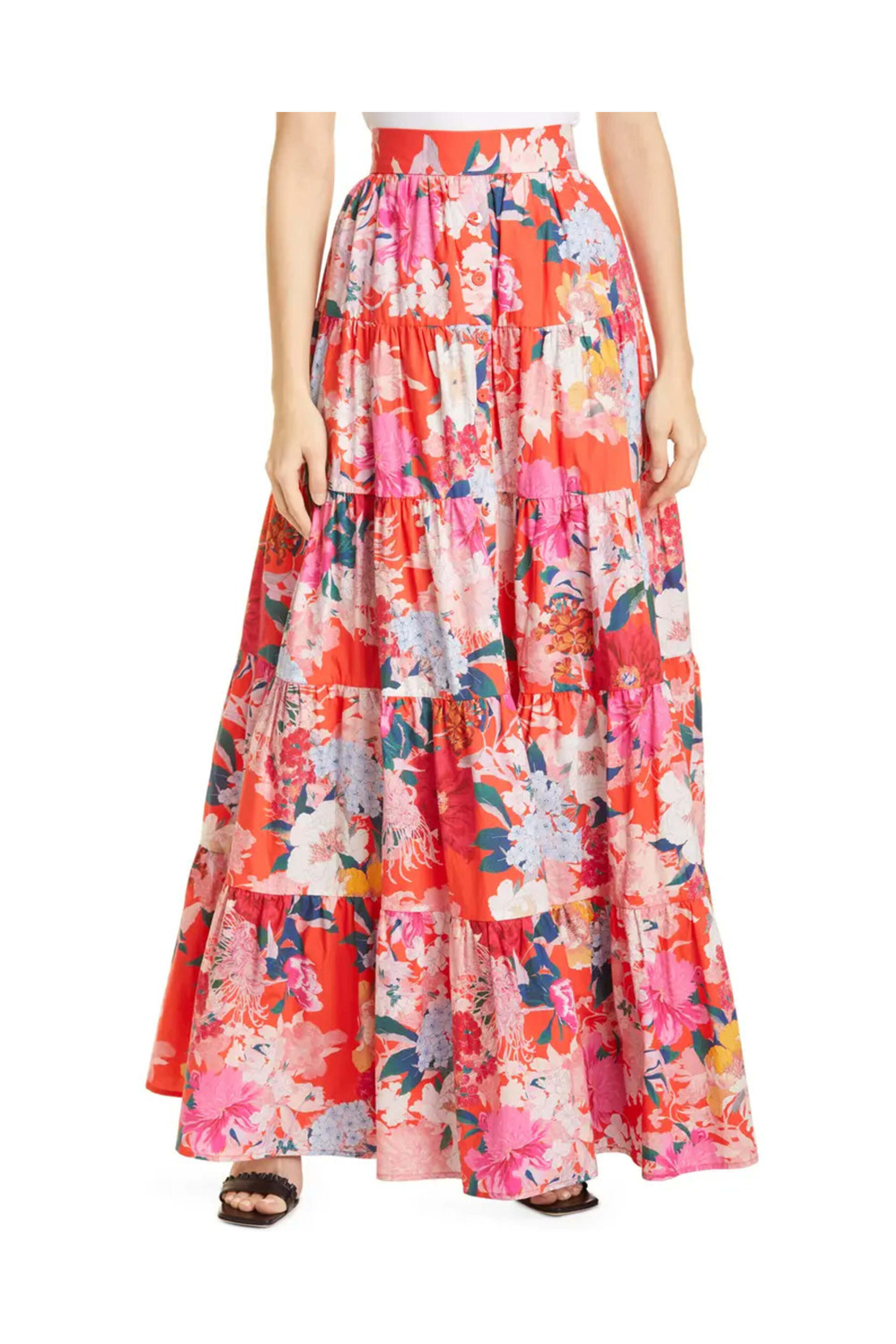 Cara Cara Floral Red Nathali Skirt. High rise. Back zip closure. Front buttons. Maxi hemline; ruffled. Relaxed fit. Unlined. 100% cotton.