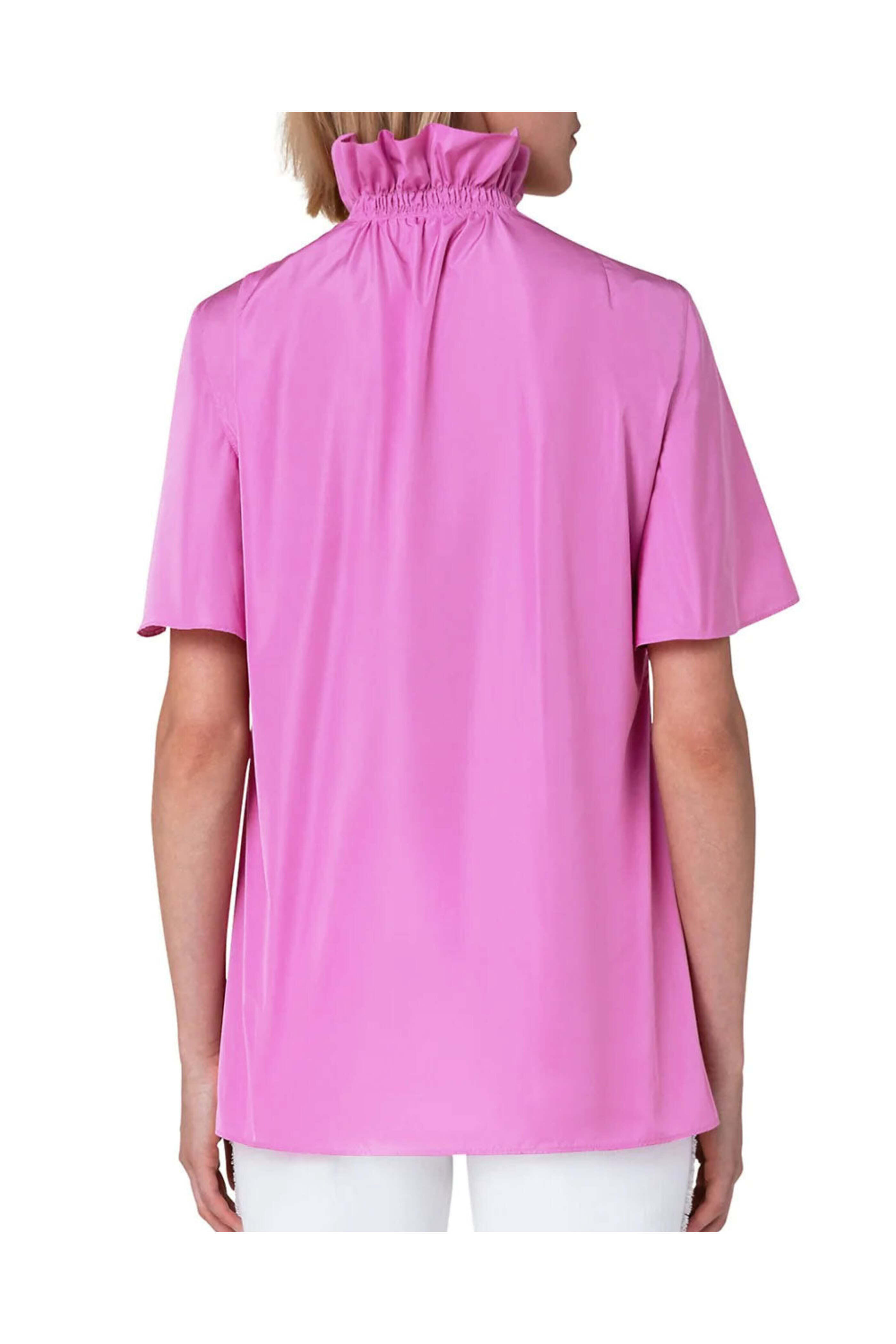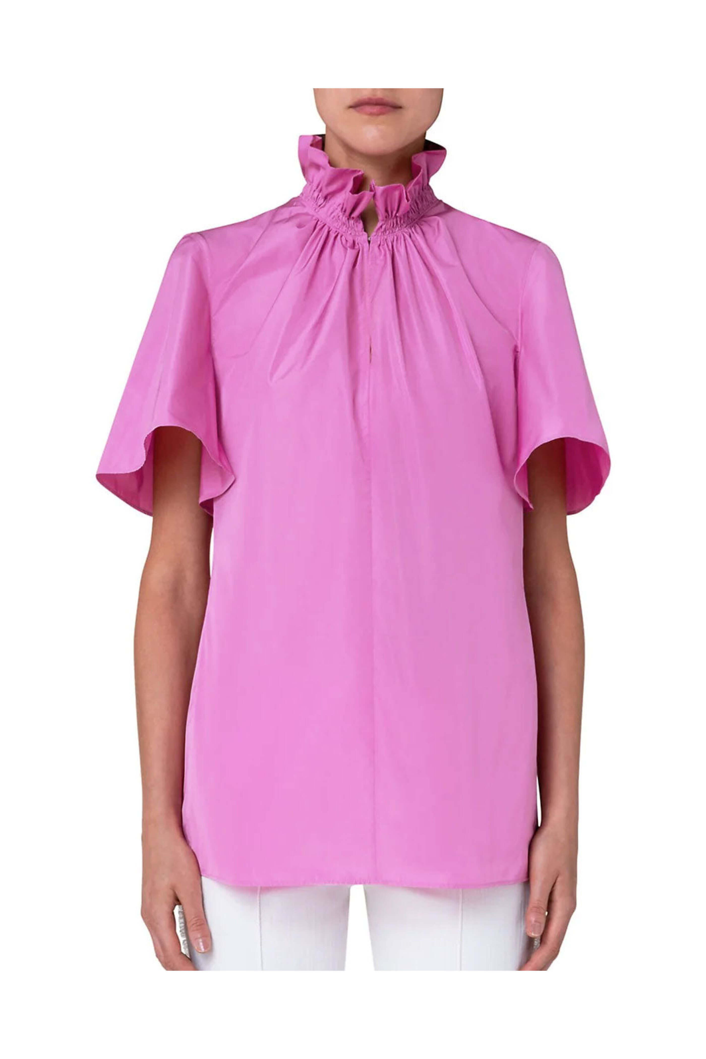 Akris Punto Pink Techno Taffeta Ruffle Neck Blouse. Ruffle stand collar. V neck; hook and eye closure. Short wide sleeves. Relaxed fit. Straight hem. 100% polyester.